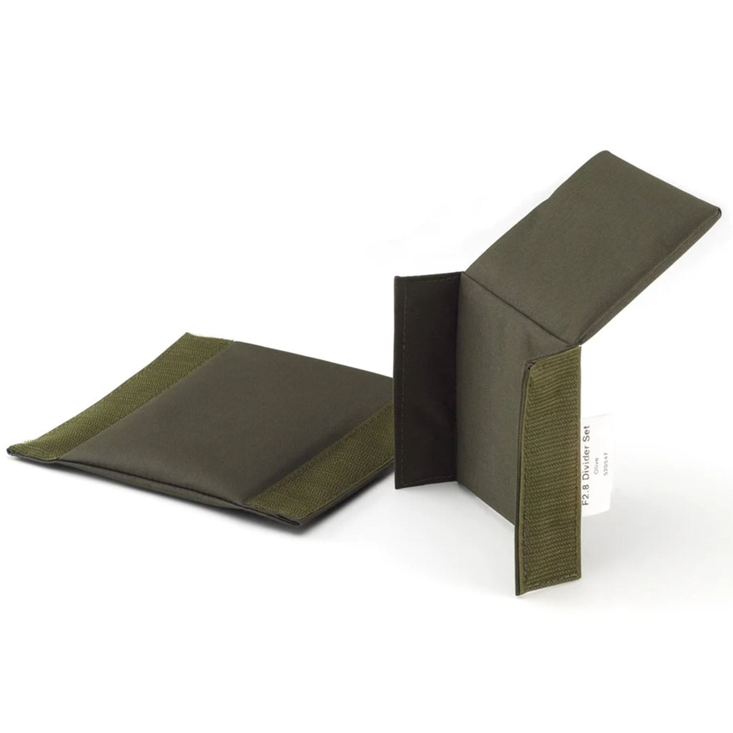 2x vertical padded dividers (one with an integral flap) are included in the set. For use in the Billingham f2.8 Camera Bag (no longer in production).