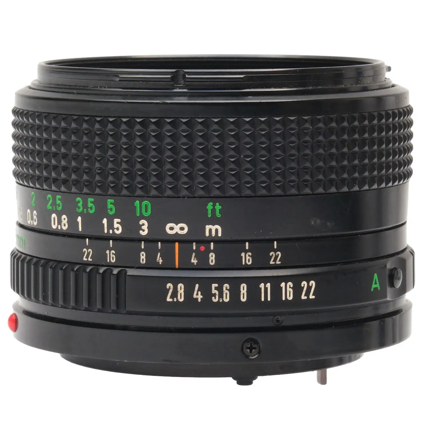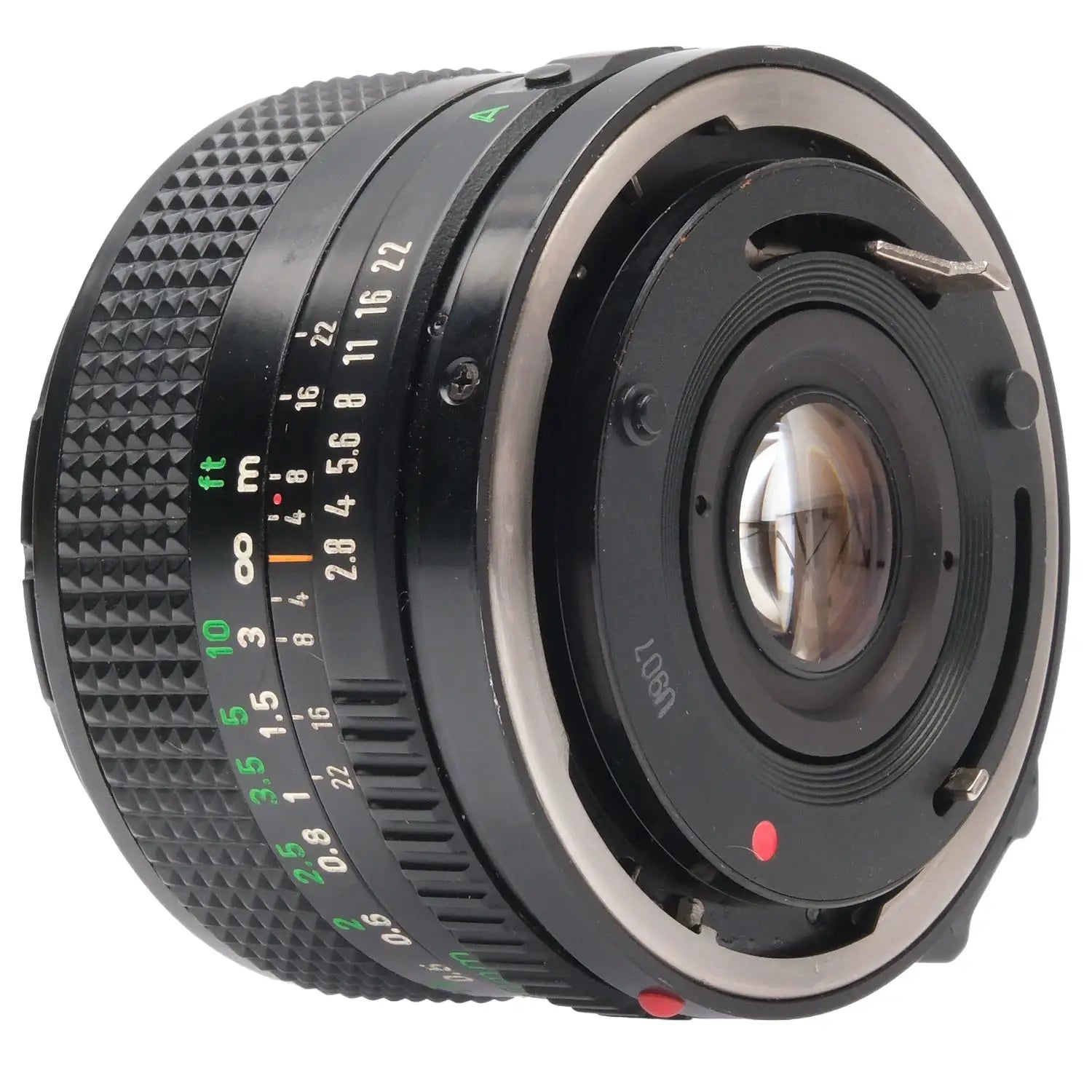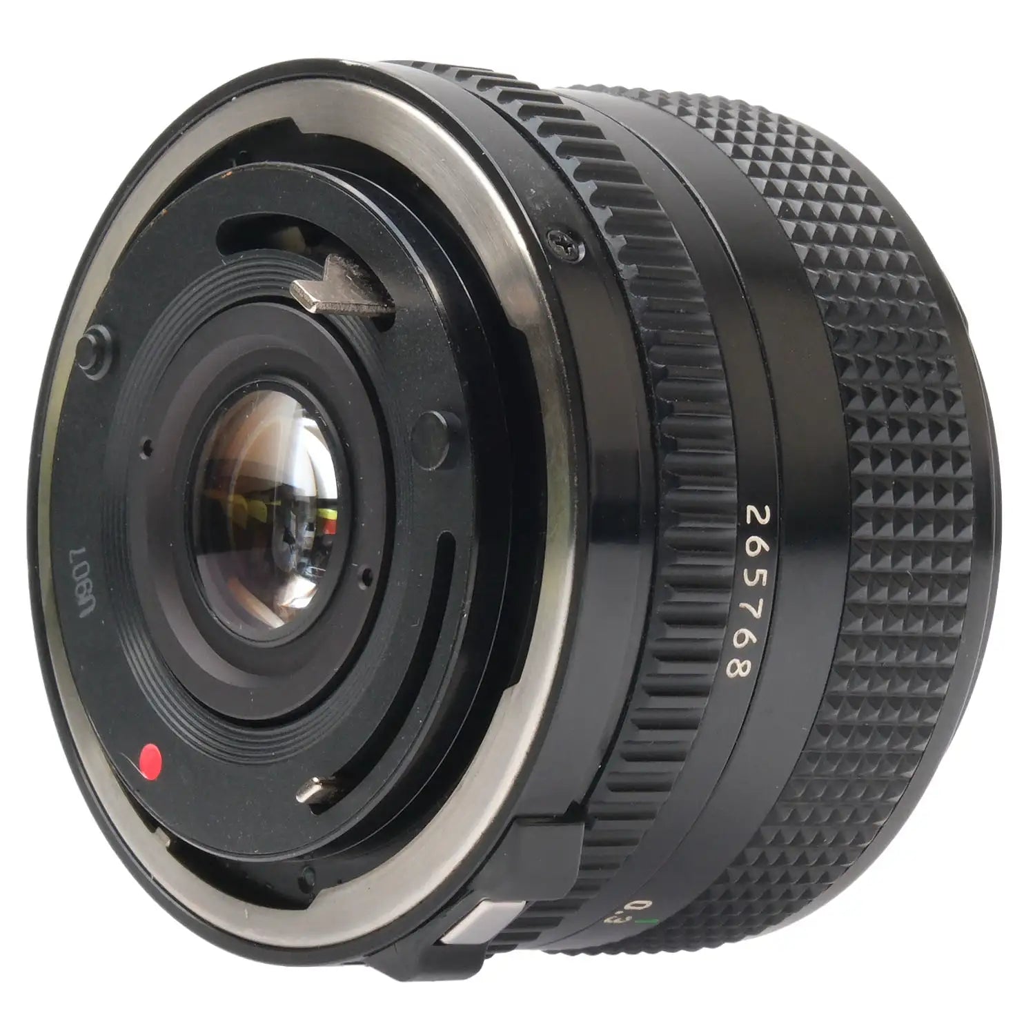 This Canon FD 28mm f2 Lens, #265768, is in great condition with minor handling wear. I rate it cosmetically a (9). The focus and aperture rings are a bit stiff, but the aperture functions properly and the glass is clean and clear with no haze, marks, or fungus. There are a few faint specks of dust inside, but they do not affect image quality. This lens includes front & rear caps. Please refer to the photos for details.