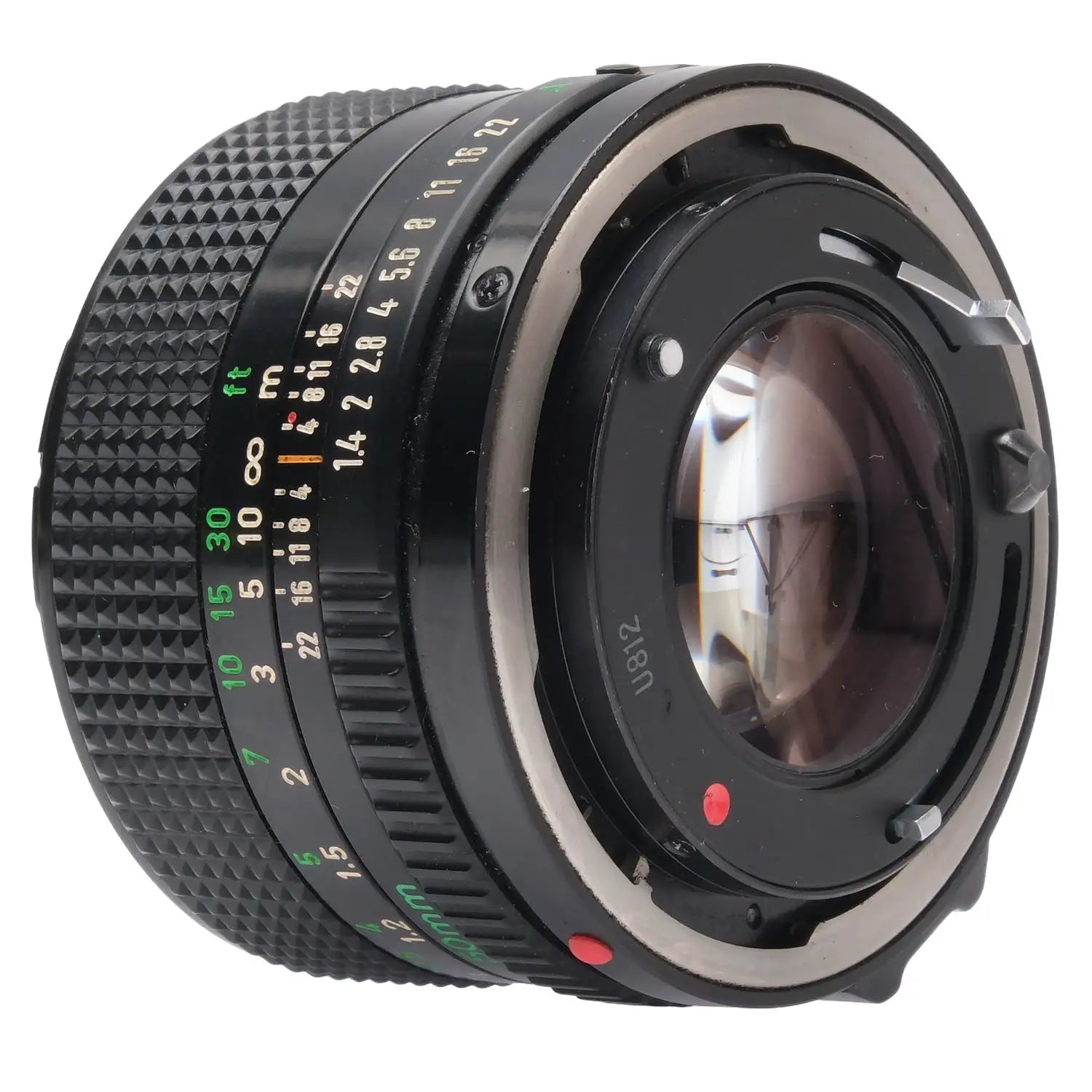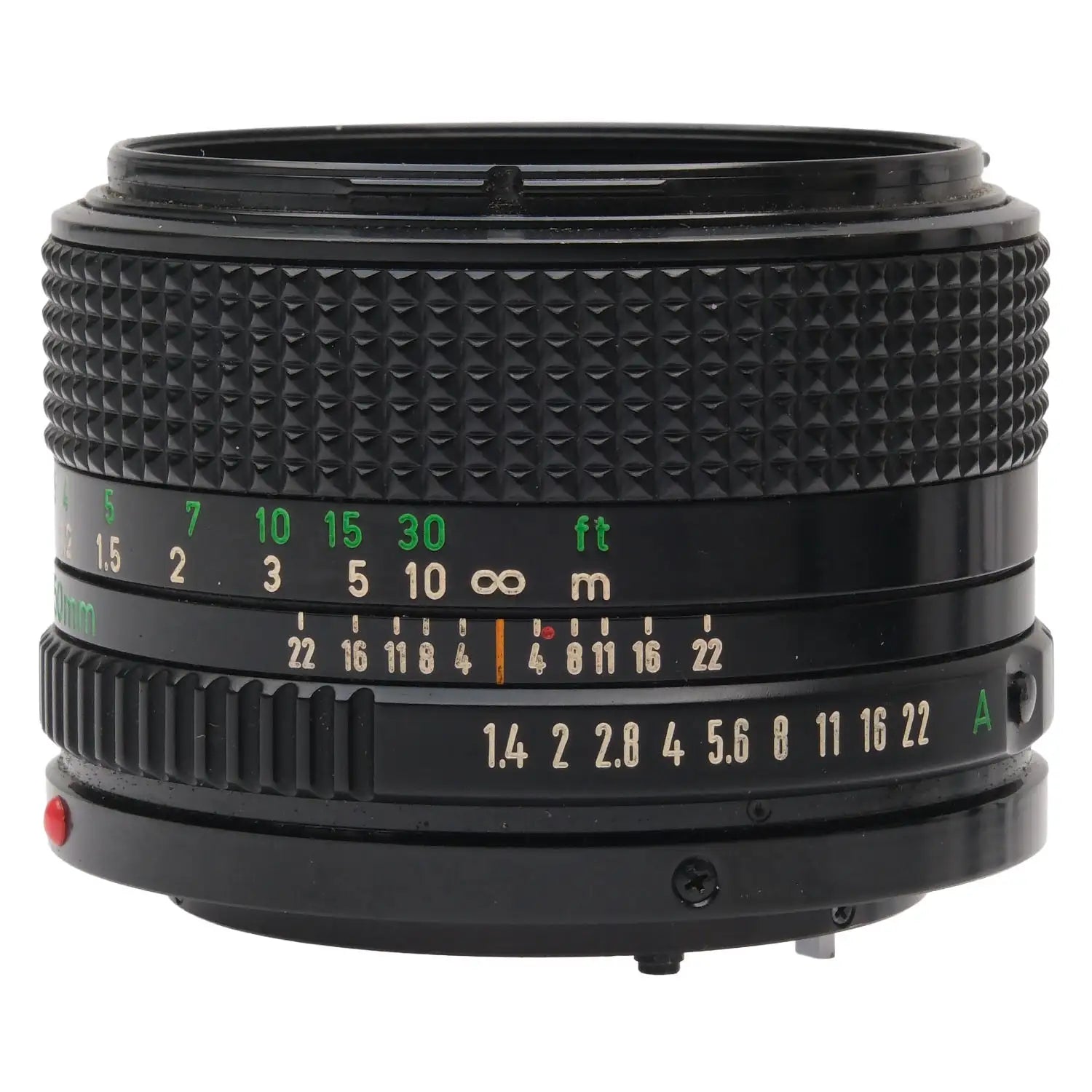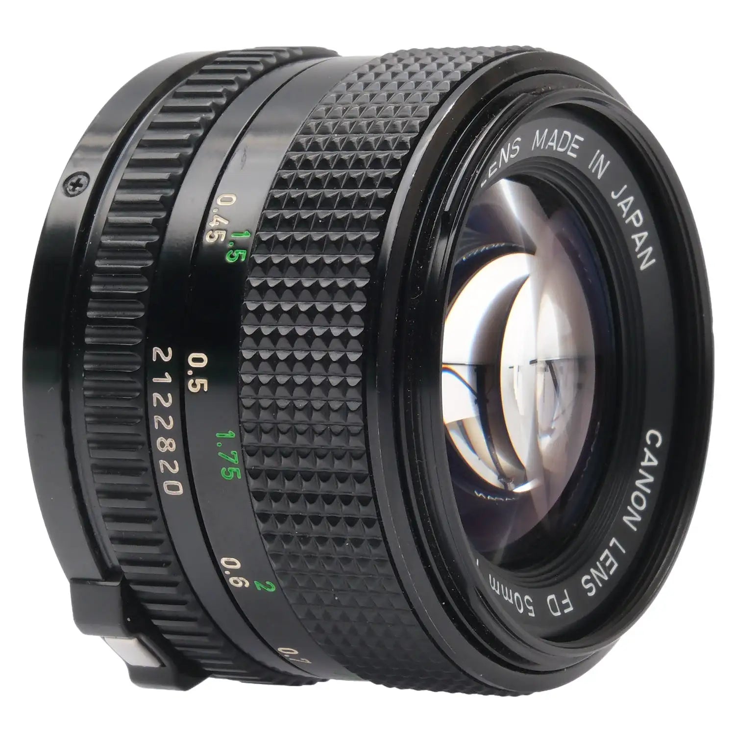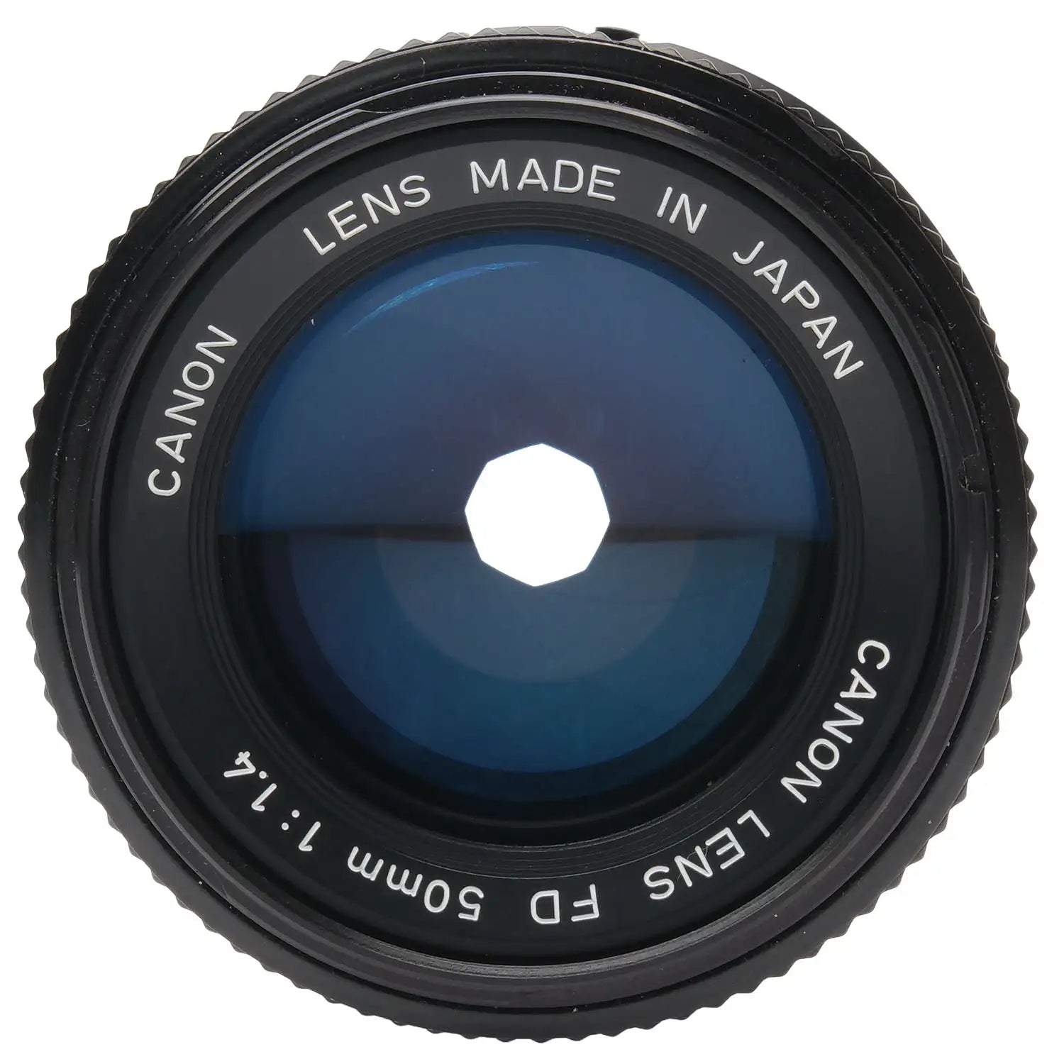 This Canon FD 50mm f1.4 Lens, #2122820, is in great condition with minor handling wear. I rate it cosmetically a (9). The focus ring is smooth, but the aperture ring is very stiff. The aperture functions properly and the glass is clean and clear with no haze, marks, or fungus. There are a few faint specks of dust inside, but they do not affect image quality. This lens includes front & rear caps. Please refer to the photos for details.
