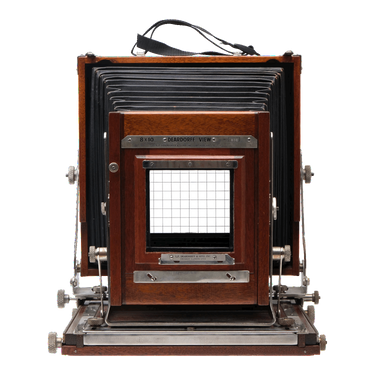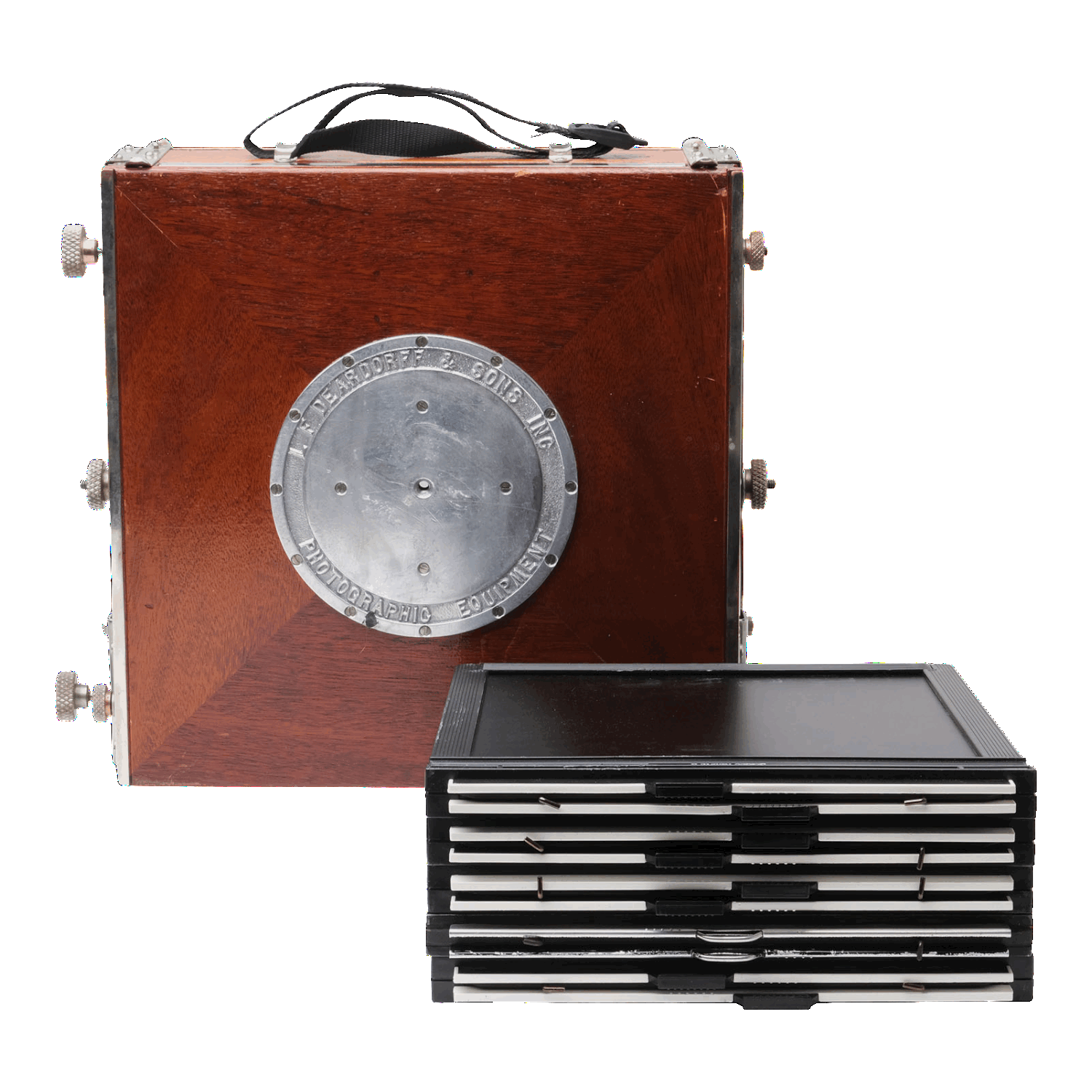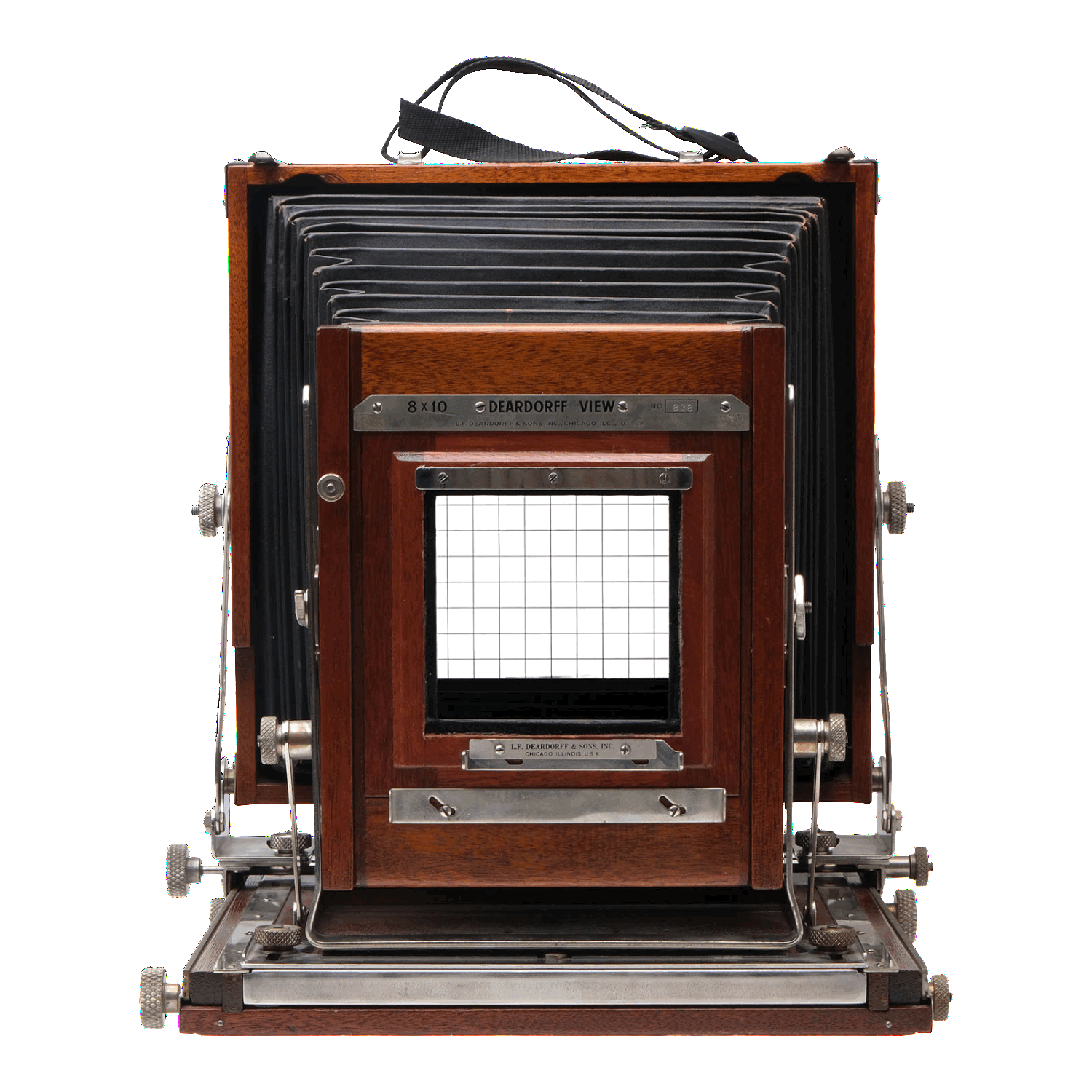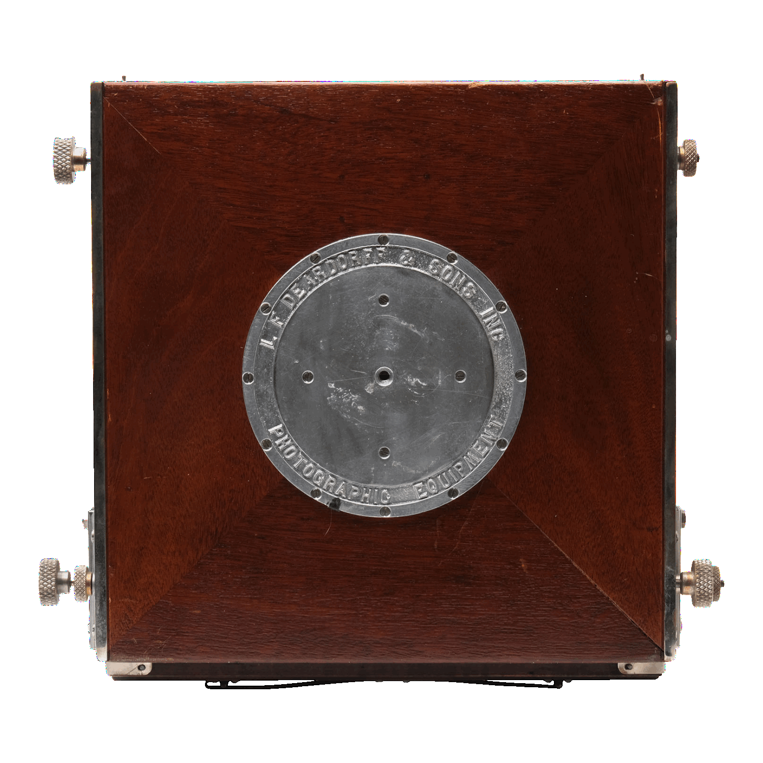 This Deardorff 8x10 FS, #838, is in good condition with some handling wear. I rate it cosmetically an (8+). The camera is in proper working order and ready to be used; all of the knobs tighten & loosen and all of the components have a full range of motion. The focusing screen has some marks on it, but is otherwise clear. The bellows is deteriorating somewhat at the corners and smells old, but we can't detect any pinholes. This camera includes five (5) film holders, spare focusing screens and film, and a Tenba carrying case. Please refer to the photos for details.