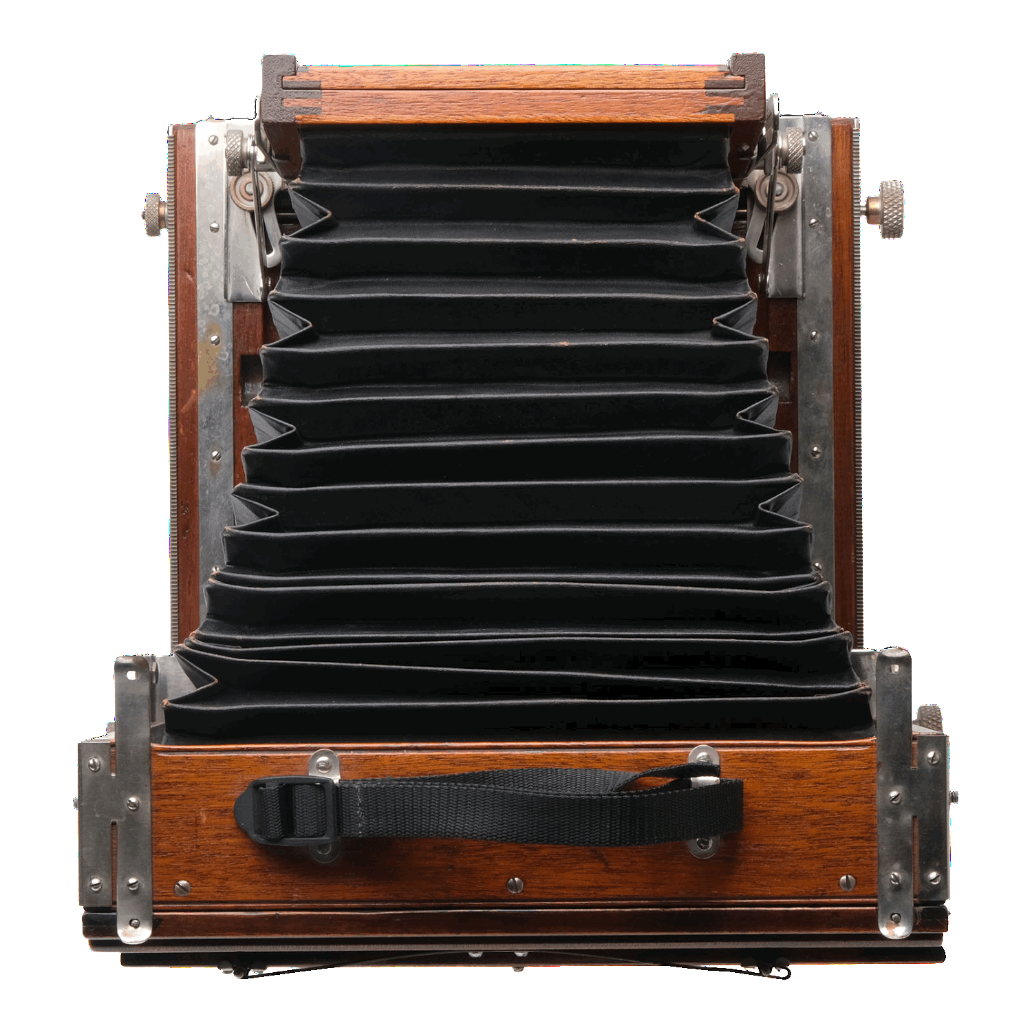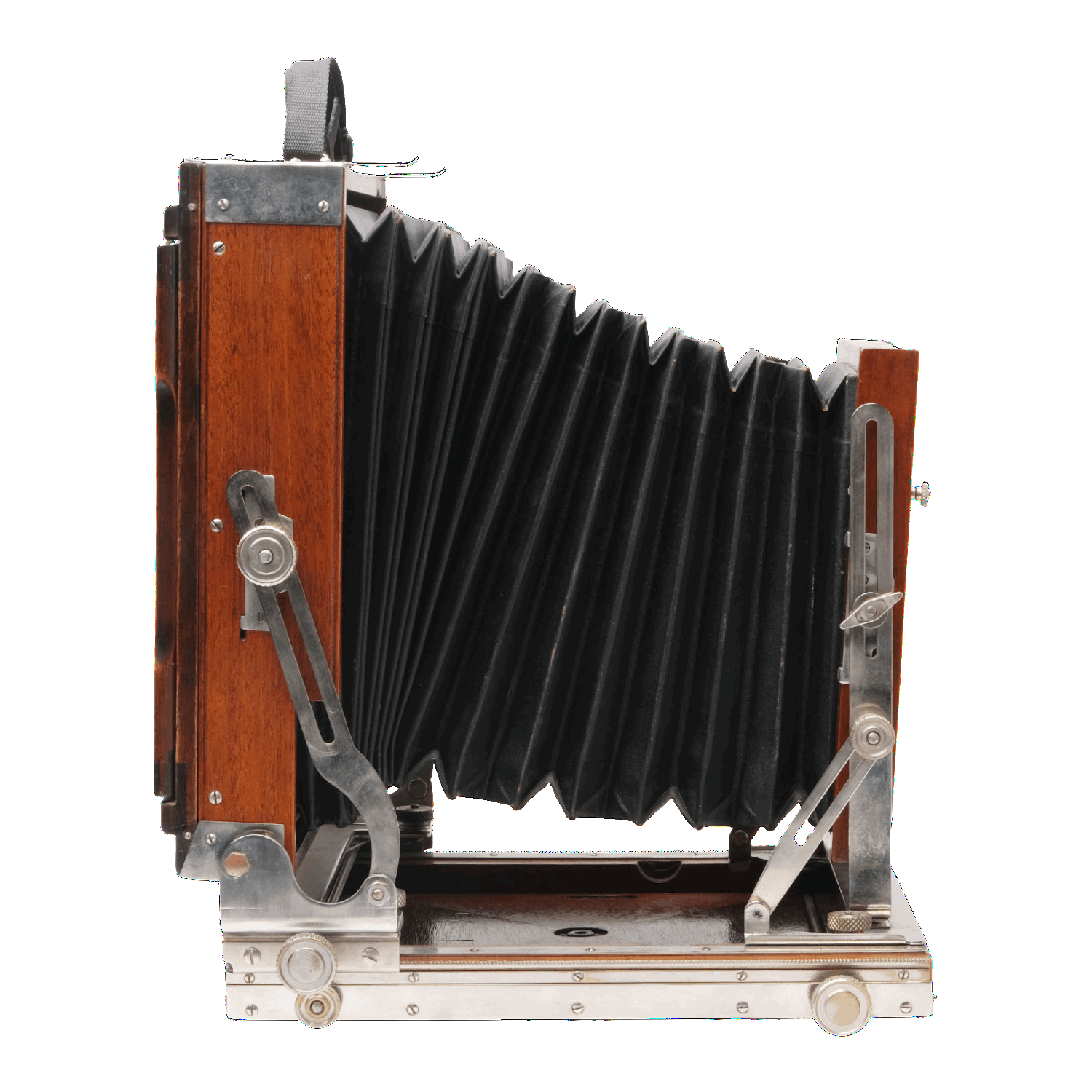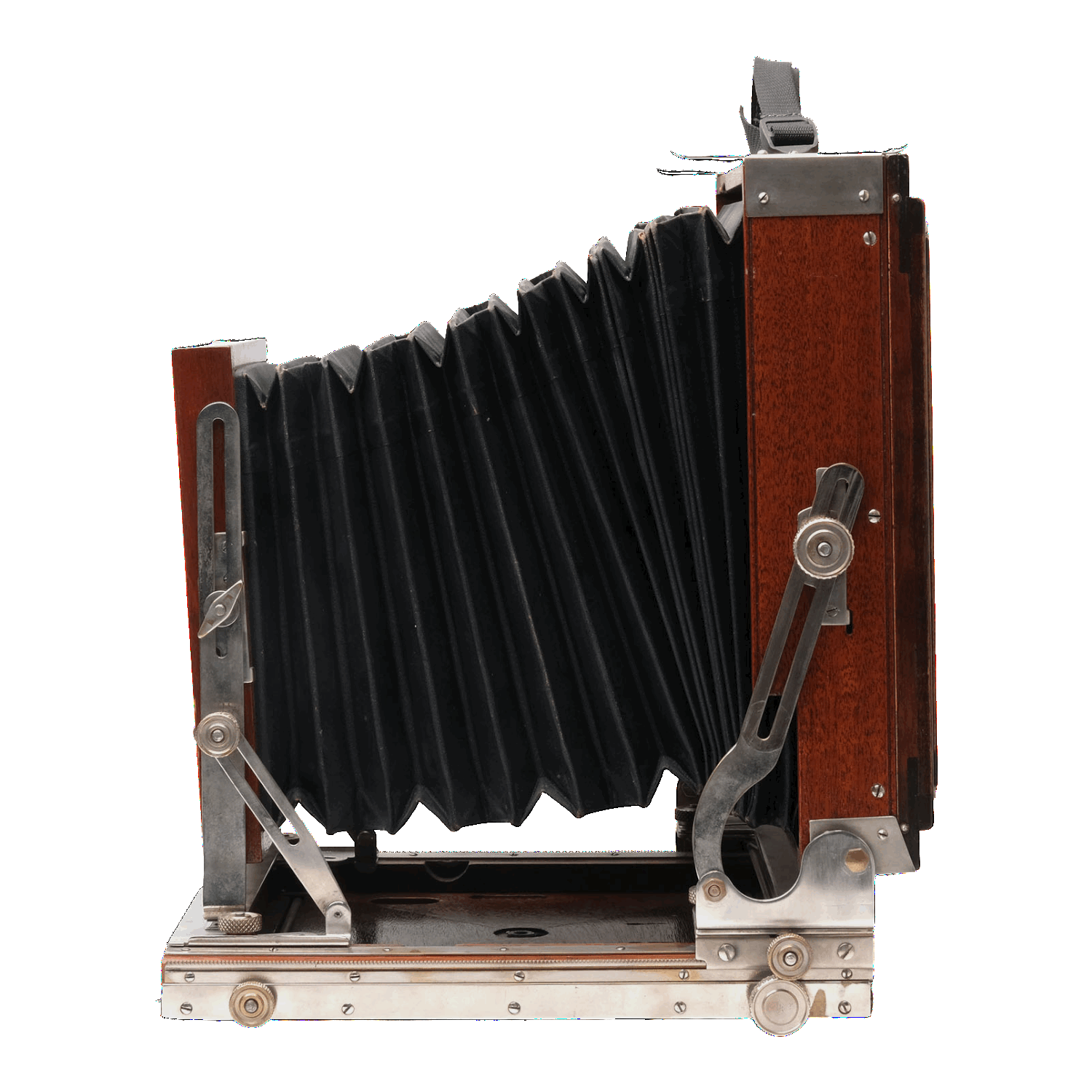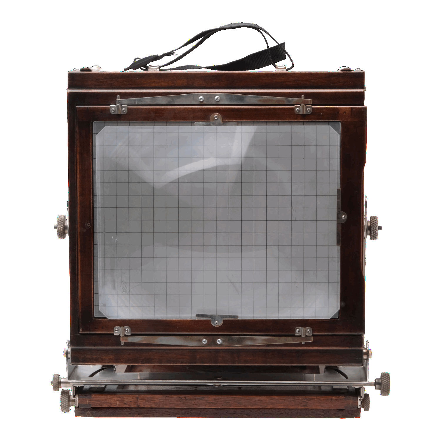 This Deardorff 8x10 FS, #838, is in good condition with some handling wear. I rate it cosmetically an (8+). The camera is in proper working order and ready to be used; all of the knobs tighten & loosen and all of the components have a full range of motion. The focusing screen has some marks on it, but is otherwise clear. The bellows is deteriorating somewhat at the corners and smells old, but we can't detect any pinholes. This camera includes five (5) film holders, spare focusing screens and film, and a Tenba carrying case. Please refer to the photos for details.