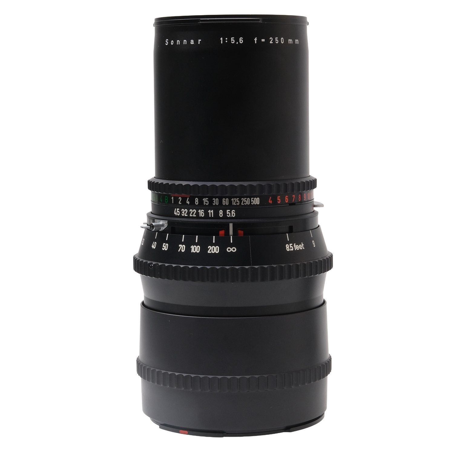This Hasselblad C 250mm f5.6 Sonnar T* Lens (Black), #57541119, is in great condition with minor handling wear. I rate it cosmetically a (9+). The aperture and shutter speed rings are smooth, but the focus ring is a bit stiff. The aperture functions properly and the shutter is accurate at all speeds. The glass is clean and clear with no haze, marks, or fungus. There are a few faint specks of dust inside, but they do not affect image quality. This lens includes front & rear caps. Please refer to the photos for details.