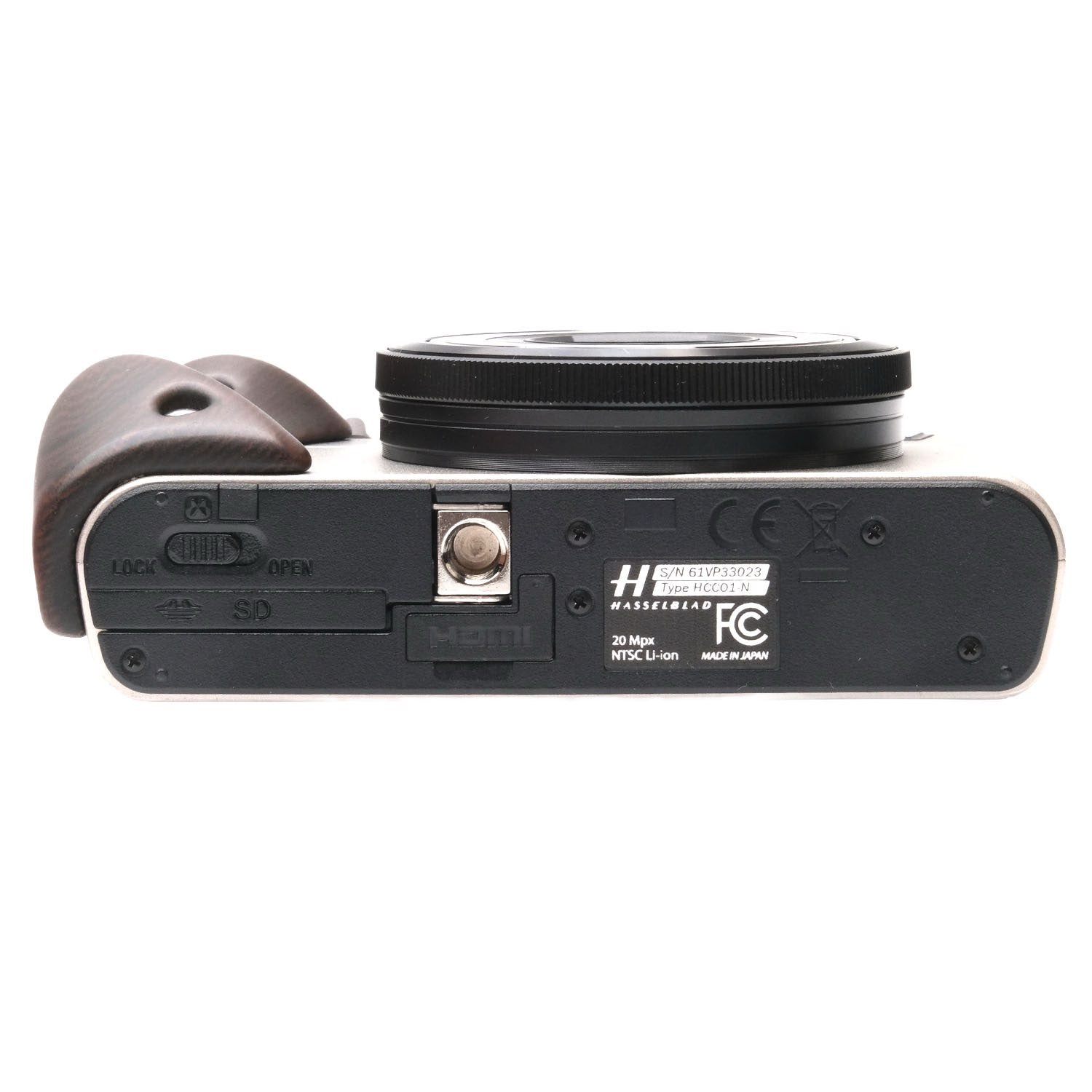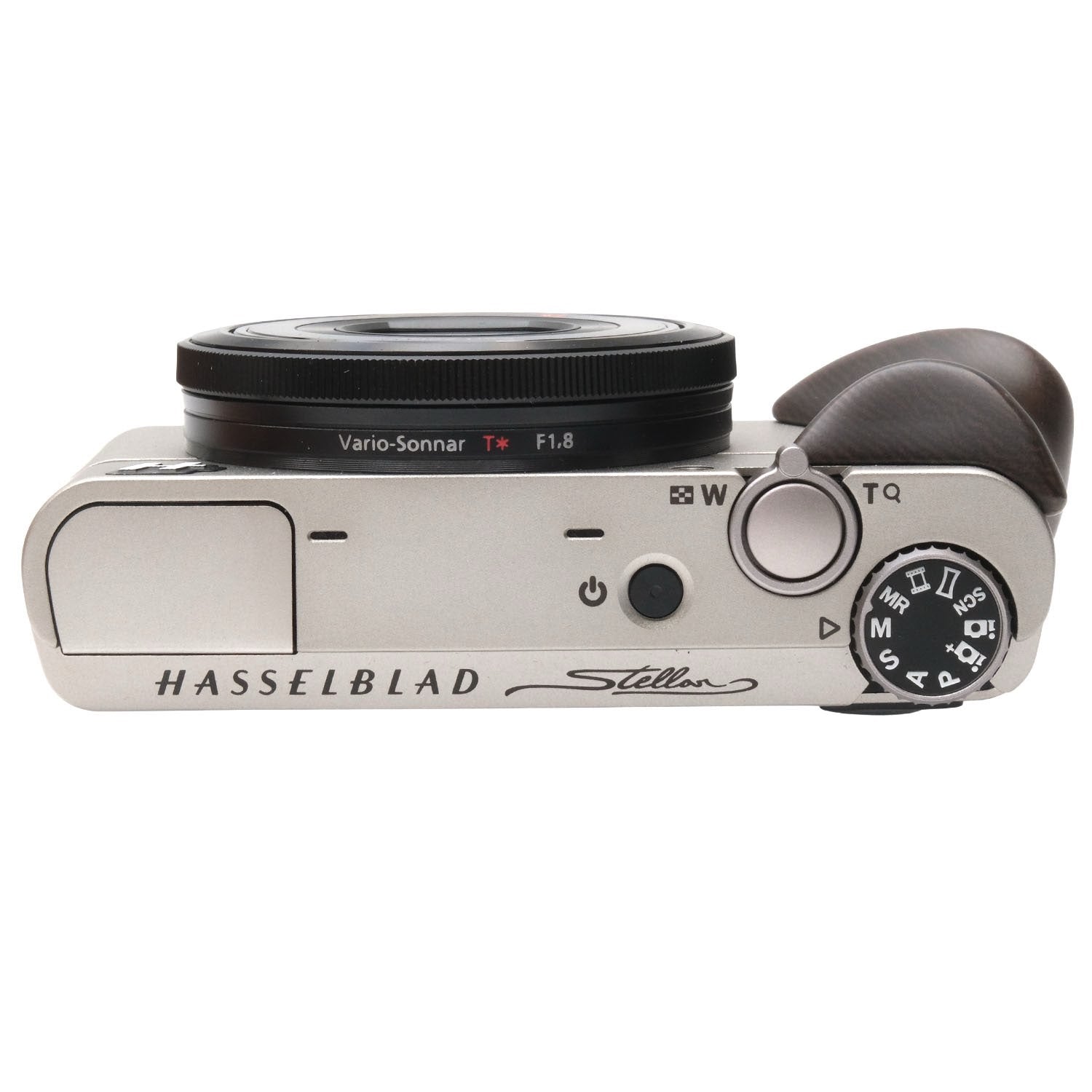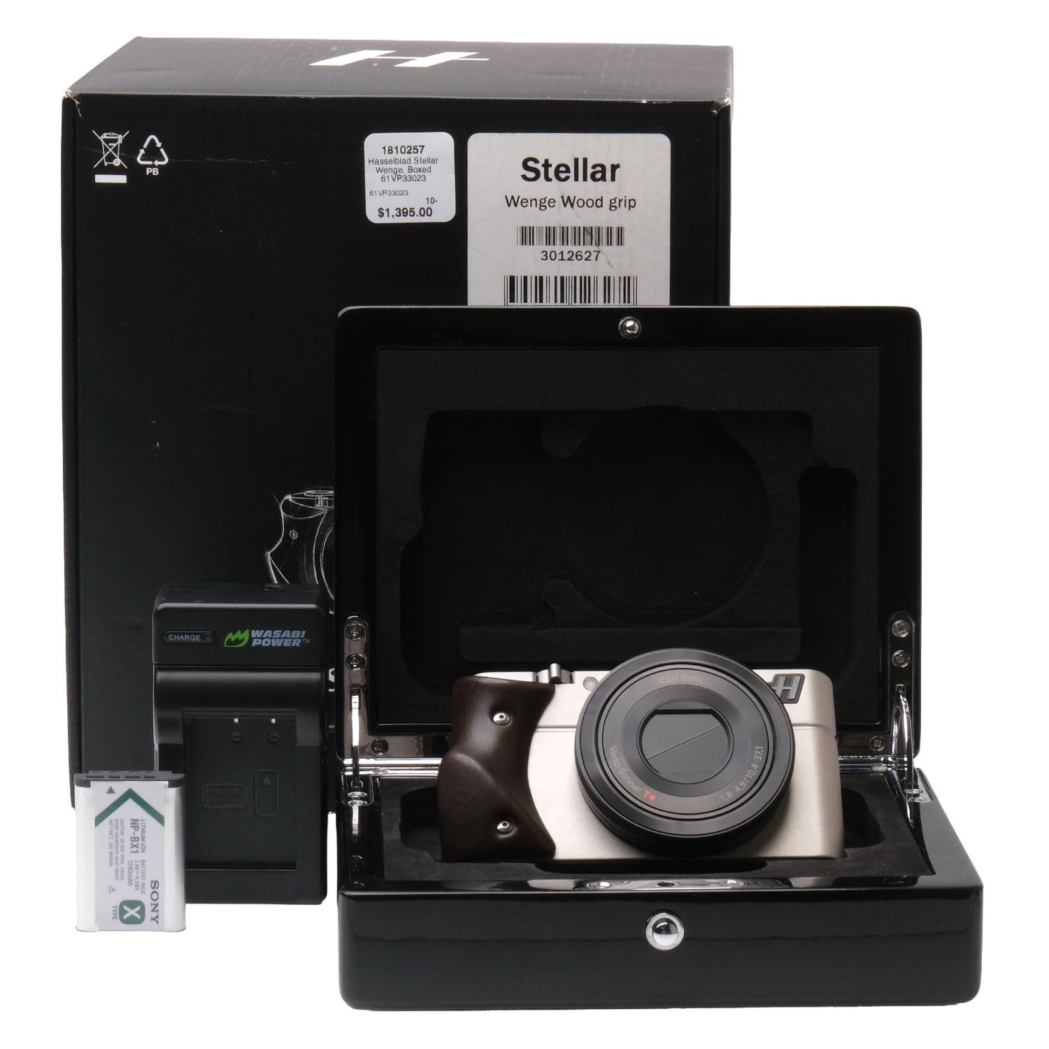 This Hasselblad Stellar (Wenge), #61VP33023, is in excellent condition with only faint handling wear. I rate it cosmetically a (10-). The camera is in proper working order; the sensor is unmarked, the memory card slot reads & writes, and the built-in flash opens, closes, and fires. The built-in Zeiss 28-100mm f1.8-4.9 zoom lens extends and retracts properly, has a smooth multifunction ring, and the glass is clean and clear with no haze, marks, or fungus. This camera includes a Sony battery, a third-party battery charger with a plug adapter, a USB cable, a Hasselblad neck strap, a Hasselblad wrist strap, software CD, anti-dust bag, and the original interior presentation case and outer box. Please refer to the photos for details.