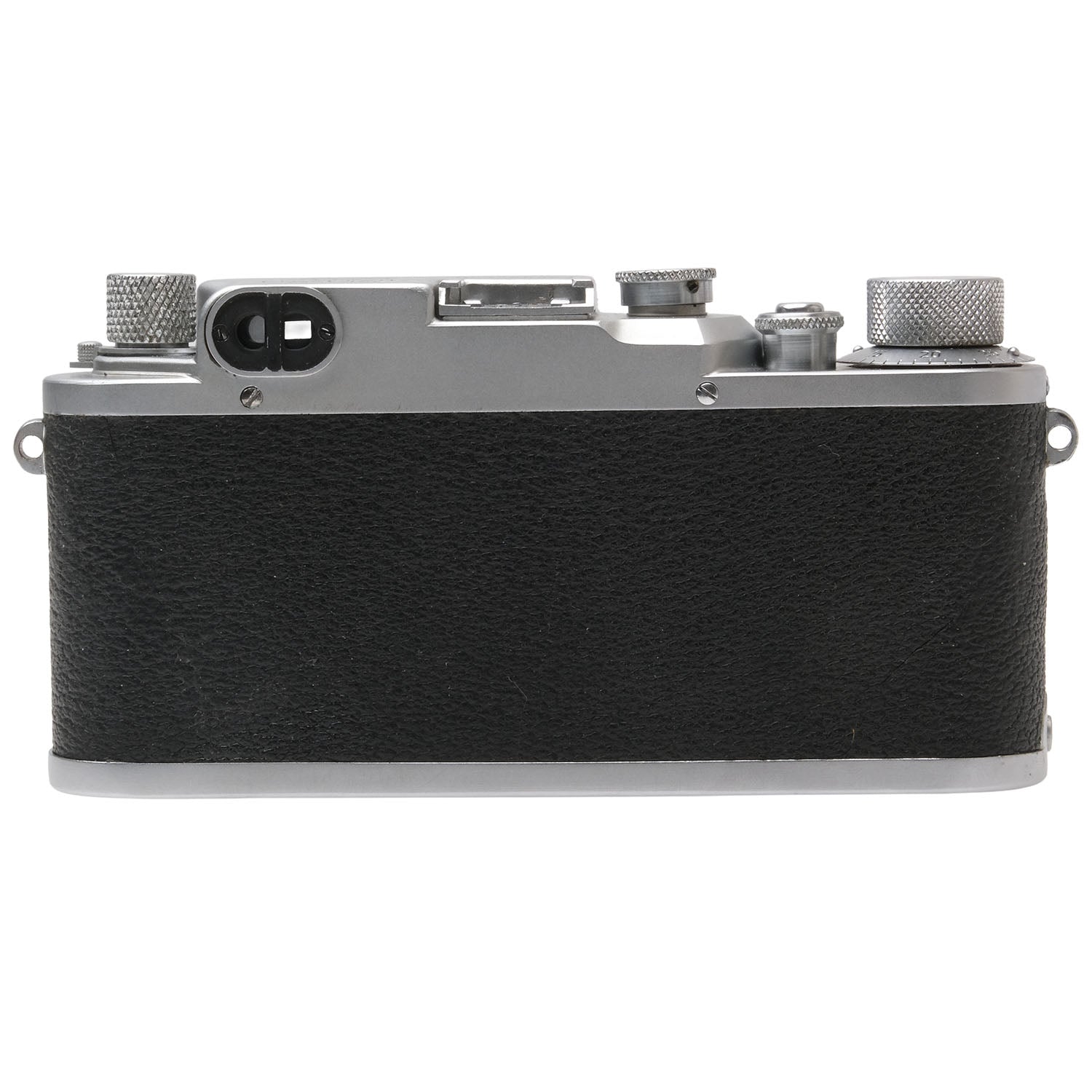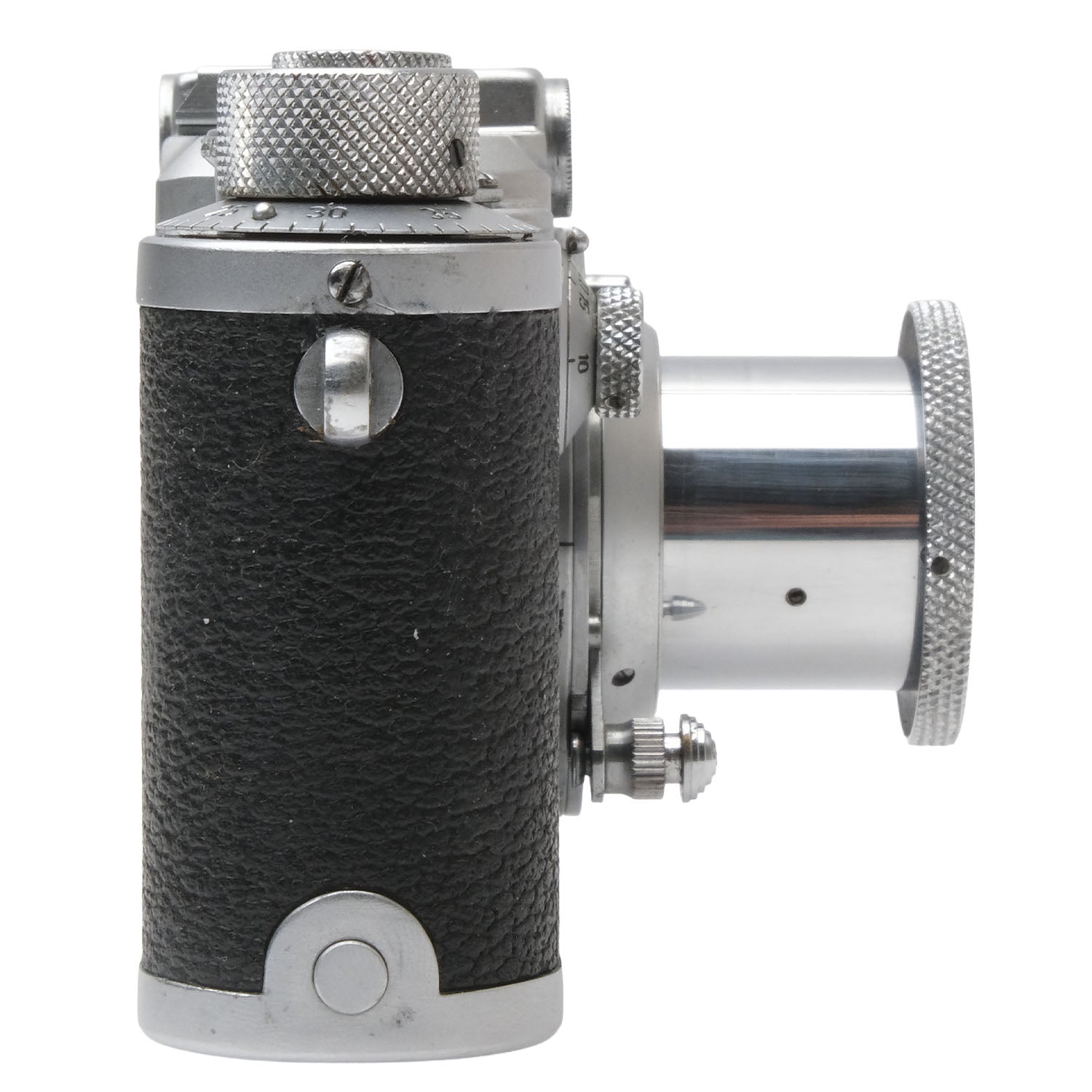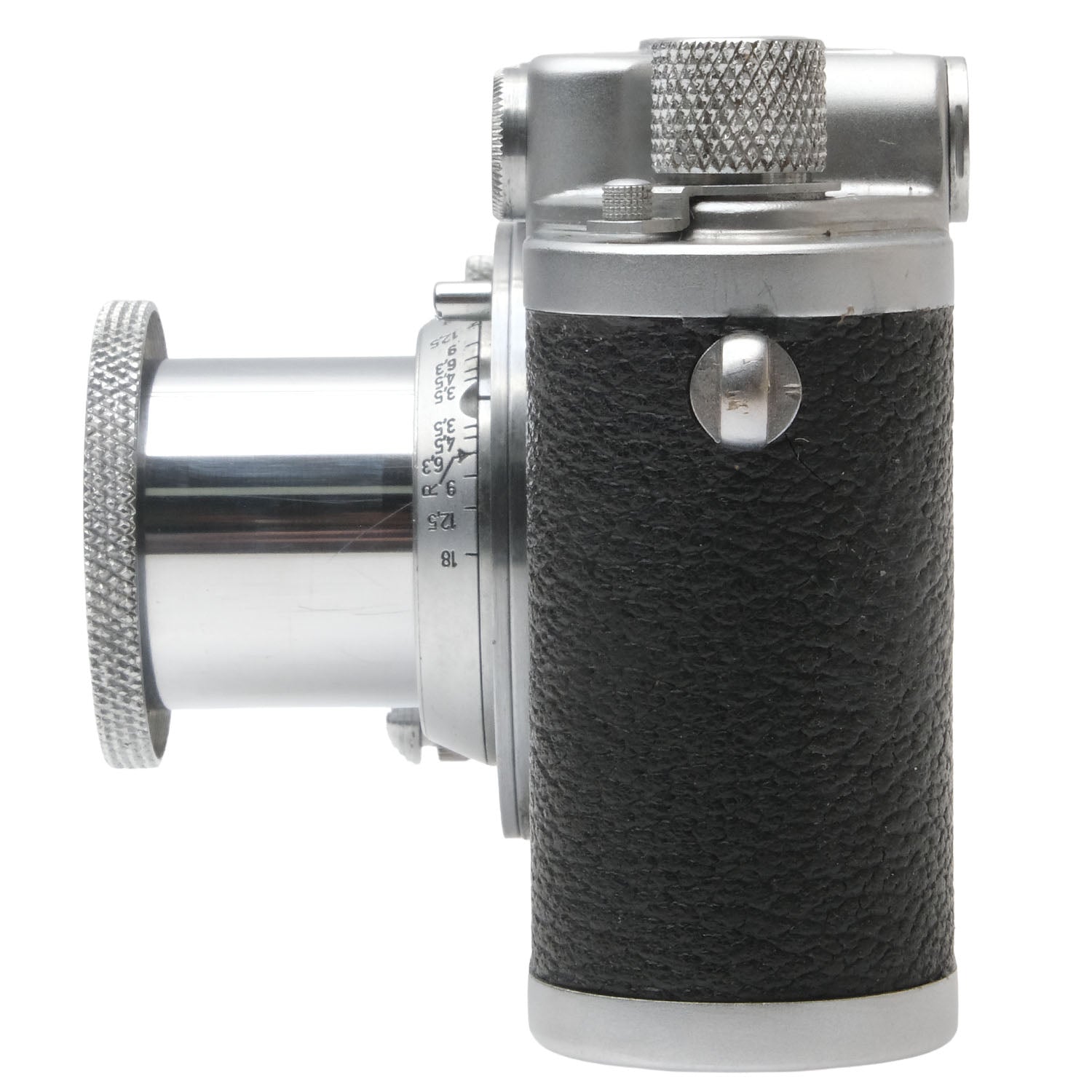This Leica IIIc #396032, with 5cm f3.5 Elmar is in excellent condition with only faint handling wear. I rate it cosmetically at (9+) condition. The camera was just returned to us from DAG where a full overhaul was performed. The advance is smooth and the finder is clean and clear, bright and accurate. The shutter curtains are not dry and the speeds are accurate at all settings. The focus is smooth and the aperture works properly. The glass is clean and clear with no haze, marks or fungus. The front cap is included. A great set ready to use!