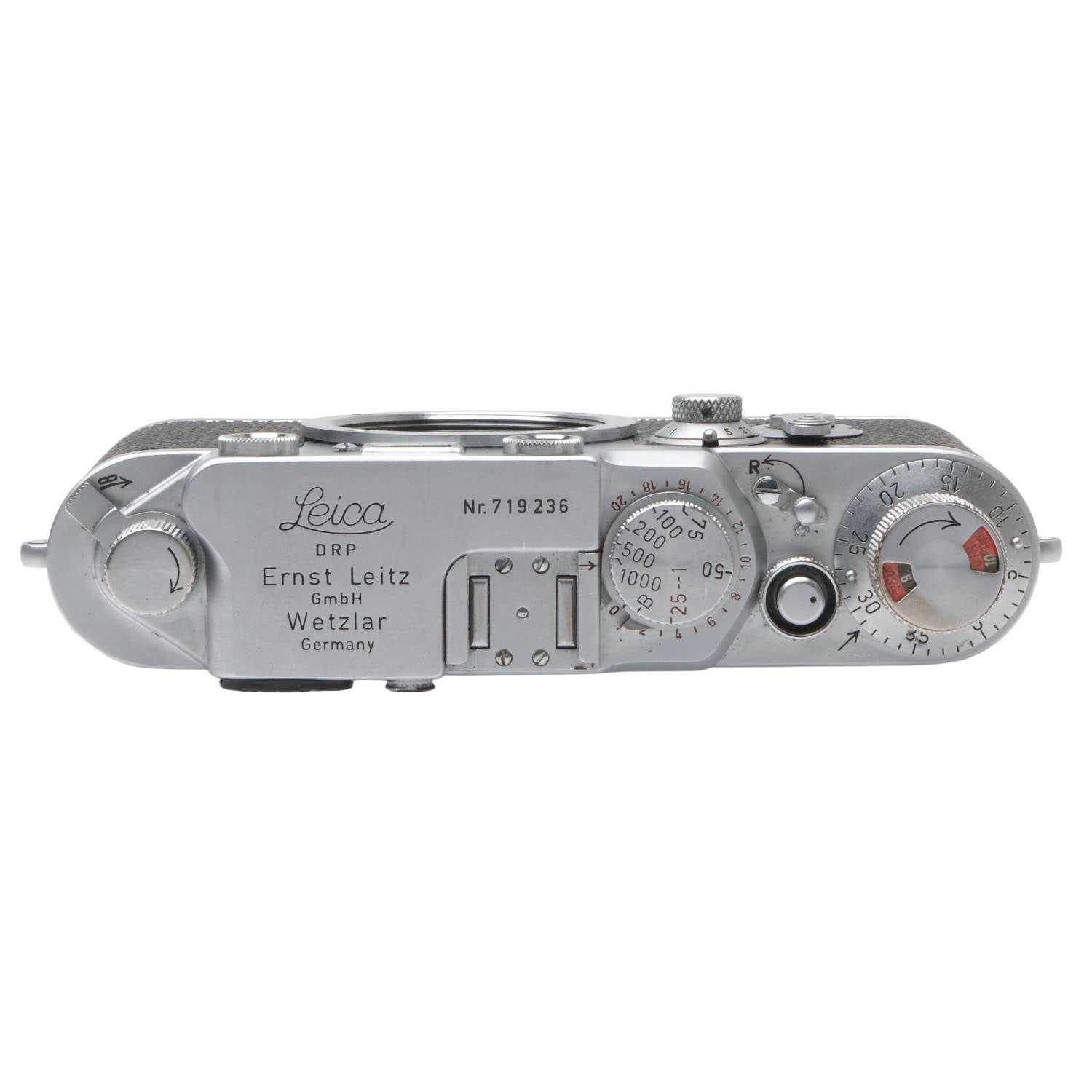 This Leica IIIf (Silver, Red Dial Dial), #719236, is in great condition with minor handling wear. I rate it cosmetically a (9). The camera is in proper working order; film advances properly, the viewfinder is clear, the shutter is accurate at all speeds, the self-timer functions, and the rangefinder is bright & accurate, although there is a bit of blue fringe on the right of the rangefinder window. It does not affect the alignment. This camera includes a body cap. It was overhauled by DAG in 2025. Please refer to the photos for details.