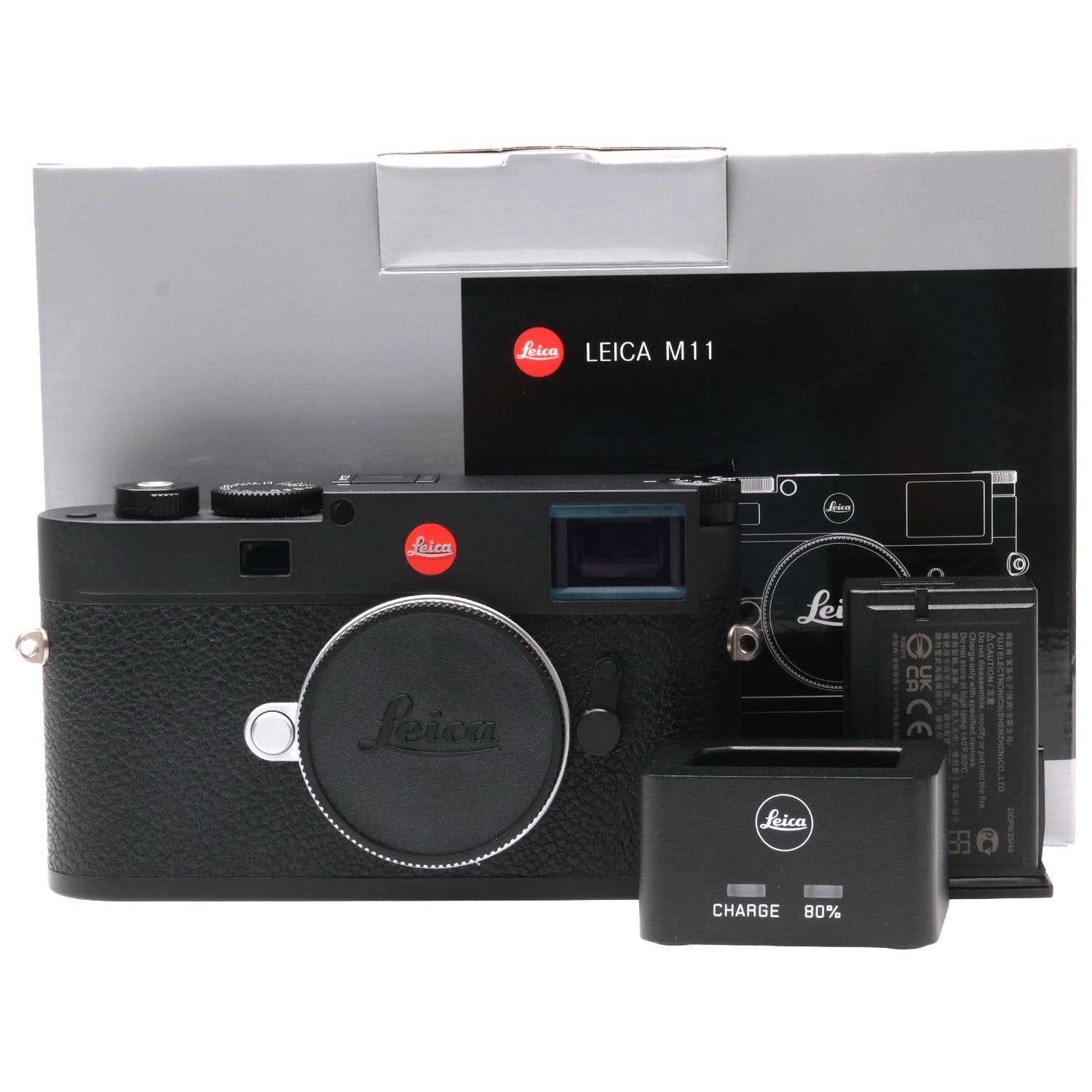 This Leica M11 (Black), #5670907, is in great condition with minor handling wear. I rate it cosmetically a (9+). The camera is in proper working order; the sensor is unmarked, the viewfinder is clear, the memory card slot reads & writes, and the rangefinder is bright & accurate. This camera includes a Leica battery, battery charger, AC adaptor with a US plug adapter, a USB-A to USB-C cable, neck strap, body cap, hot shoe cover, and the original box. Please refer to the photos for details.