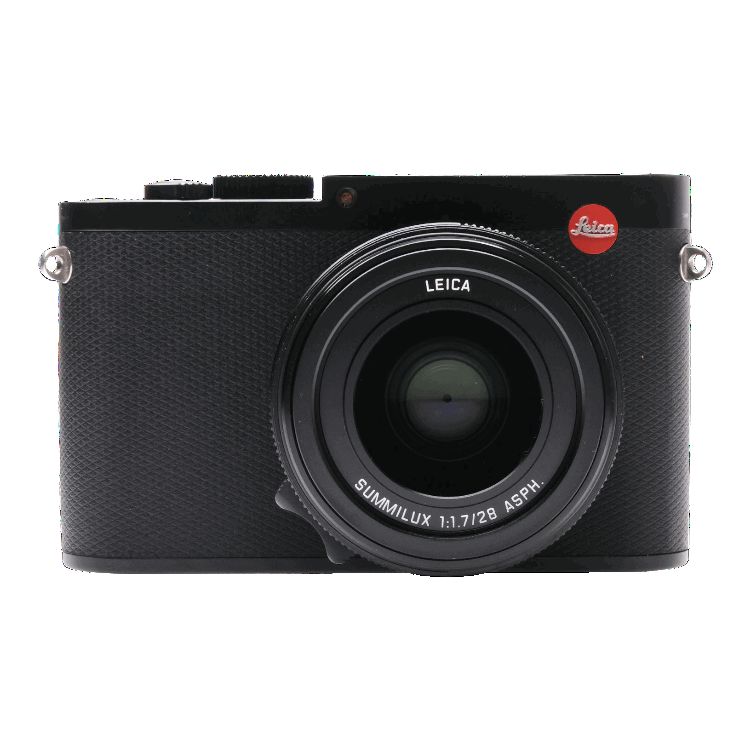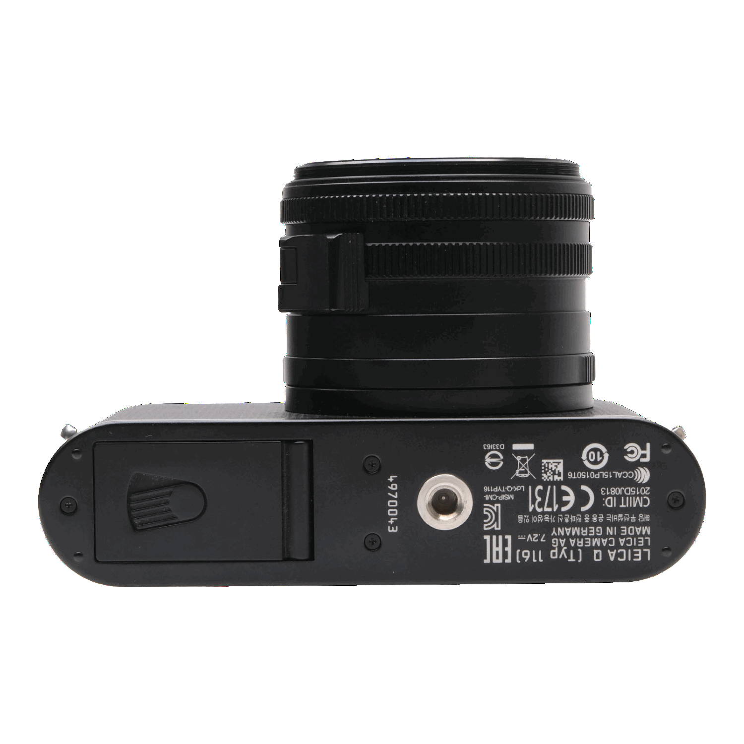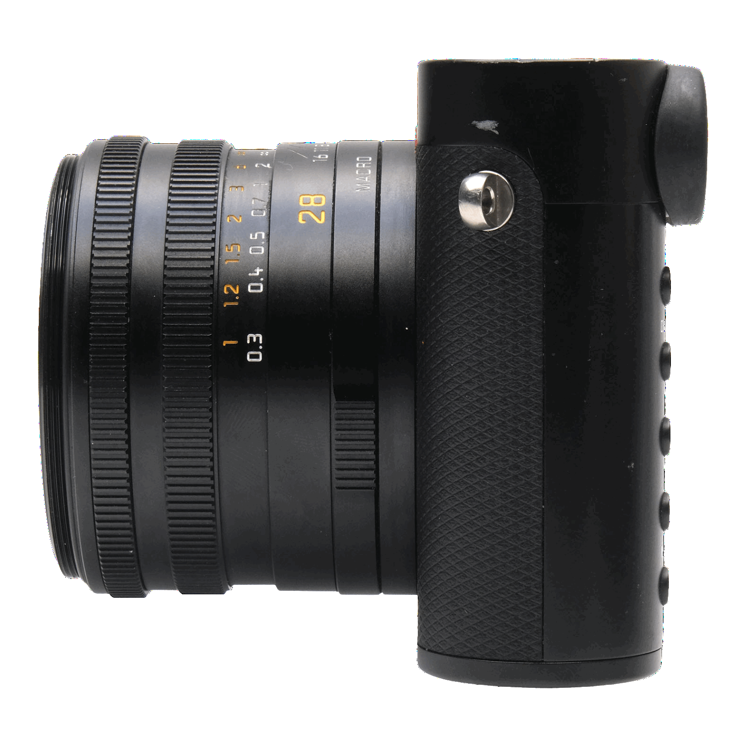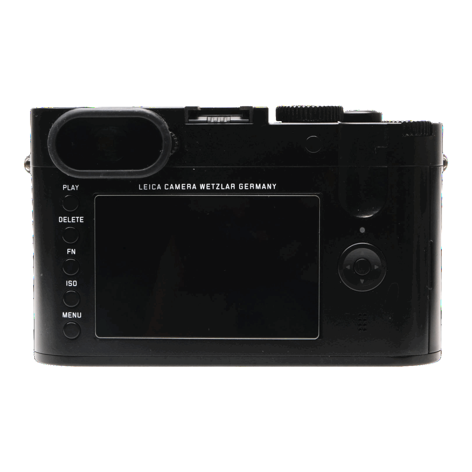 This Leica Q Typ 116 (Black), #4970043, is in good condition with some handling wear. I rate it cosmetically an (8+). The camera is in proper working order; the viewfinder is clear, the sensor is unmarked, and the memory card slot reads & writes. The built-in Leica 28mm f1.7 Summilux lens has a smooth aperture ring, but the focus ring is a bit stiff. The autofocus and aperture function properly and the glass is clean and clear with no haze, marks, or fungus. This camera includes a third-party faux leather half case, a MatchTechnical Thumbs Up EP-SQ thumb support, Leica battery, battery charger, charging cable, neck strap, and threaded lens hood. Please refer to the photos for details.