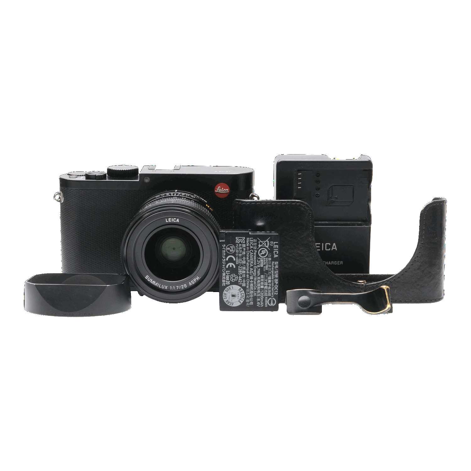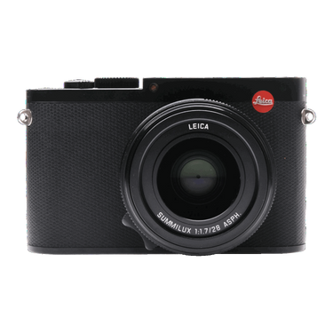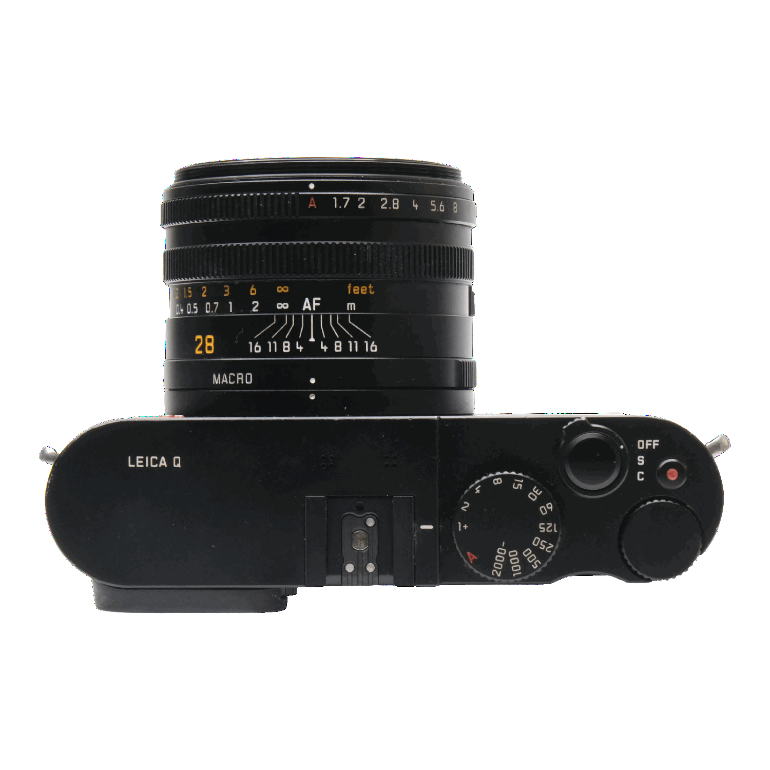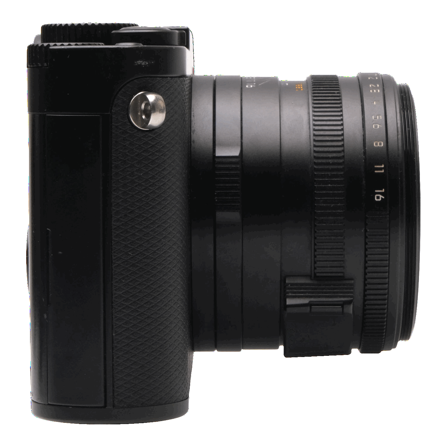 This Leica Q Typ 116 (Black), #4970043, is in good condition with some handling wear. I rate it cosmetically an (8+). The camera is in proper working order; the viewfinder is clear, the sensor is unmarked, and the memory card slot reads & writes. The built-in Leica 28mm f1.7 Summilux lens has a smooth aperture ring, but the focus ring is a bit stiff. The autofocus and aperture function properly and the glass is clean and clear with no haze, marks, or fungus. This camera includes a third-party faux leather half case, a MatchTechnical Thumbs Up EP-SQ thumb support, Leica battery, battery charger, charging cable, neck strap, and threaded lens hood. Please refer to the photos for details.