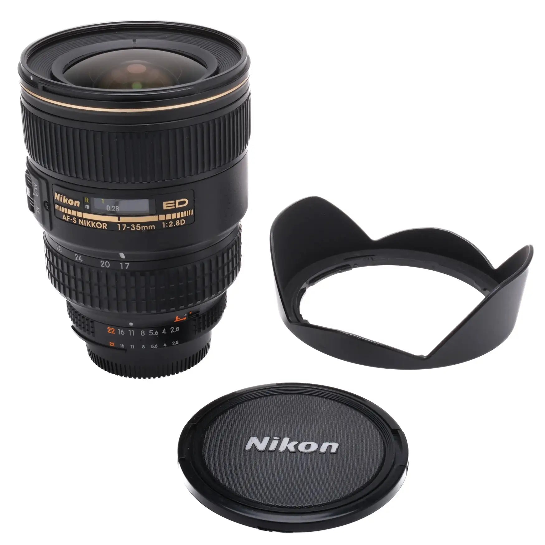 This Nikon AF-S Zoom-Nikkor 17-35mm f/2.8D IF-ED #US258289 is in excellent cosmetic condition with faint handling wear found throughout, please see photos for visual reference. Cosmetically, this lens has been rated at a (9+) condition. This lens is in proper working order; the zoom and the focus ring turn smoothly, the autofocus is accurate, and the glass is clean and clear with no signs of fungus, haze, or marks present. This lens includes front cap/rear caps and hood.