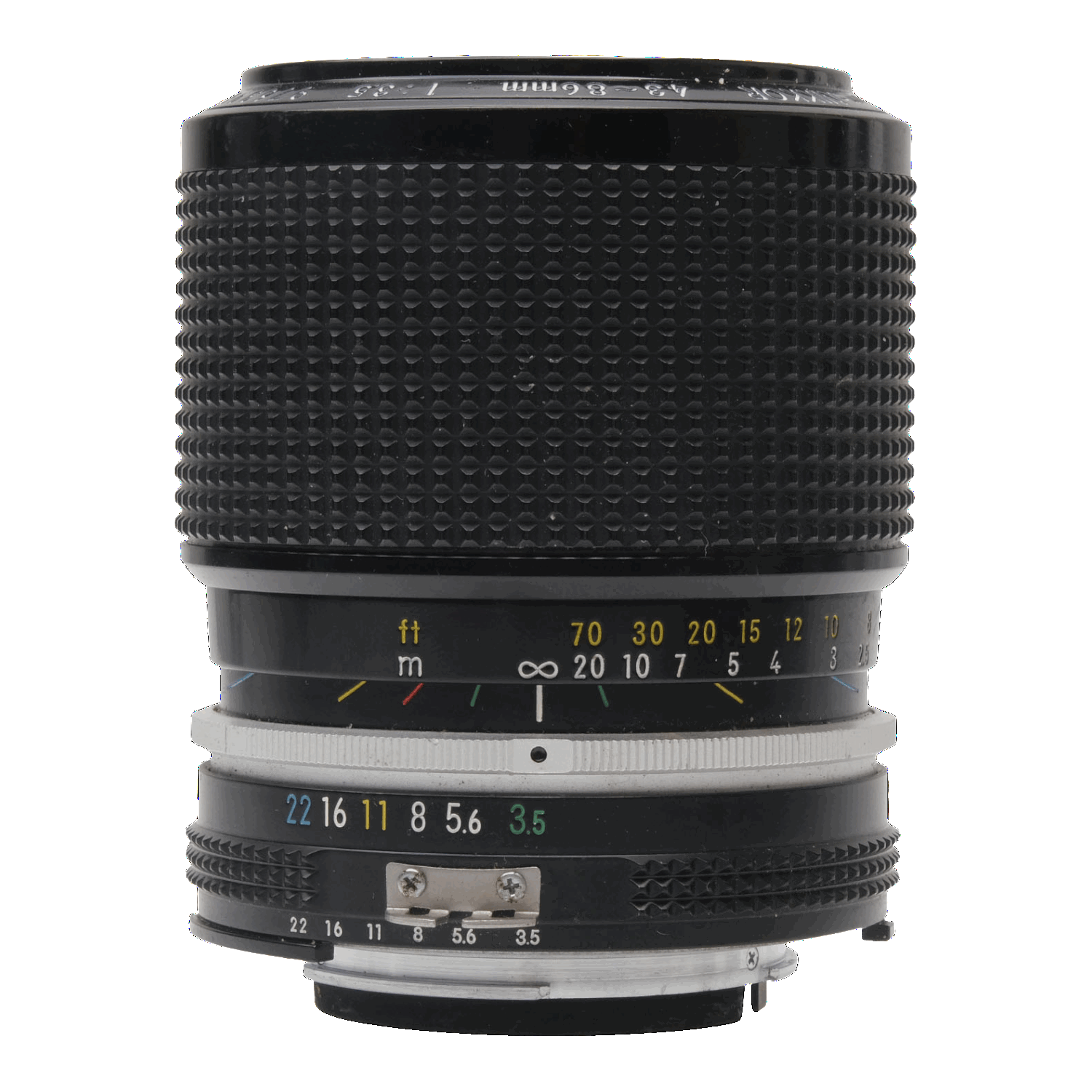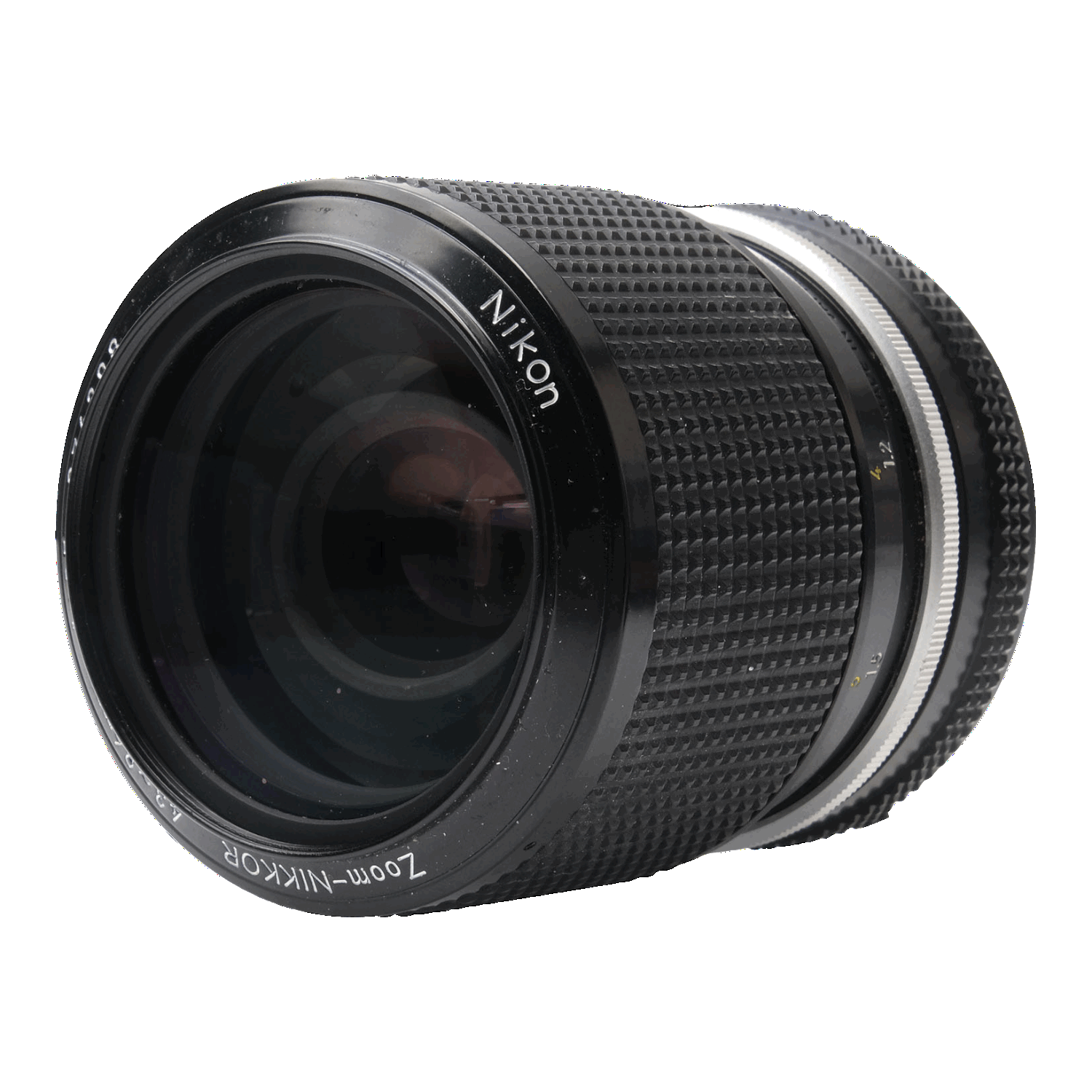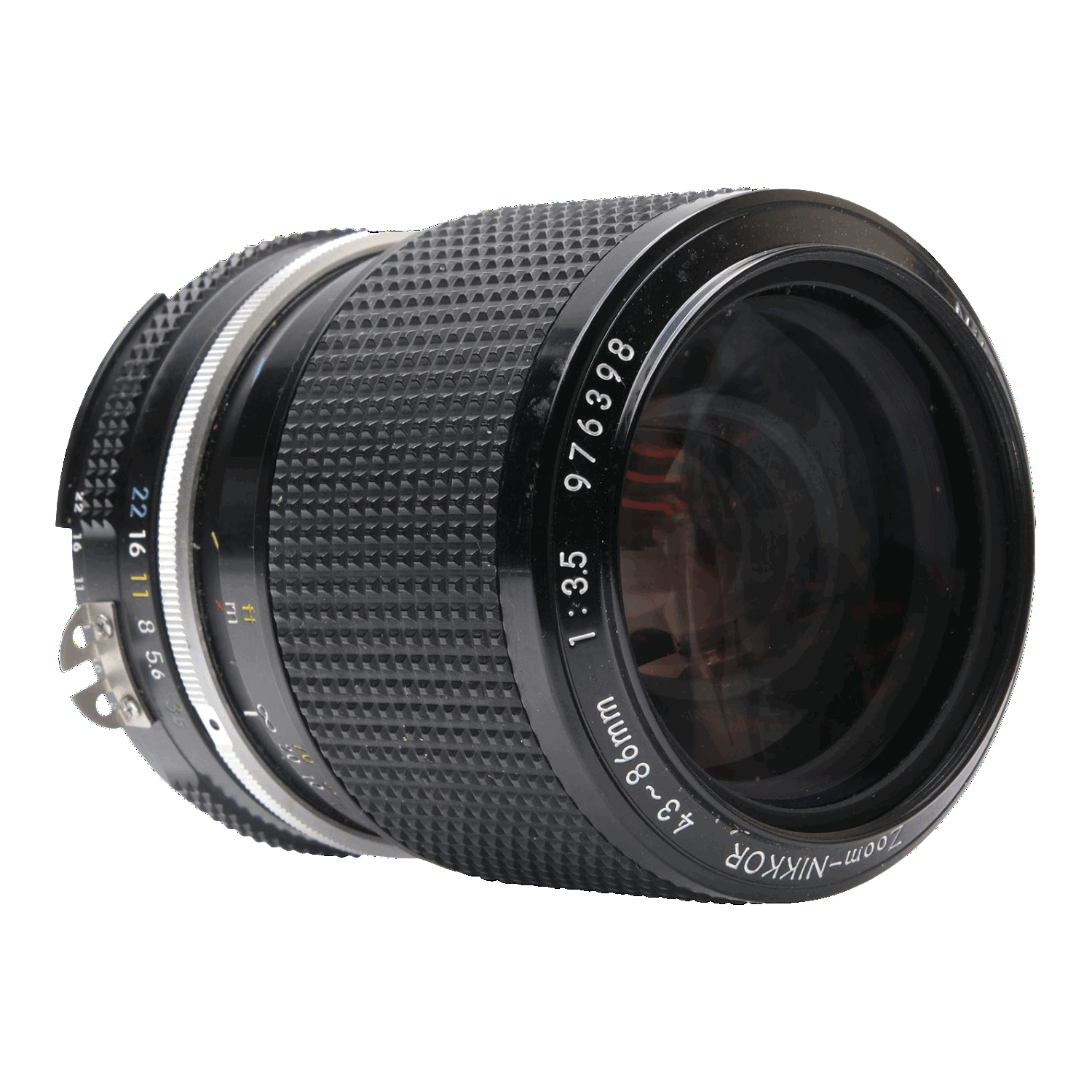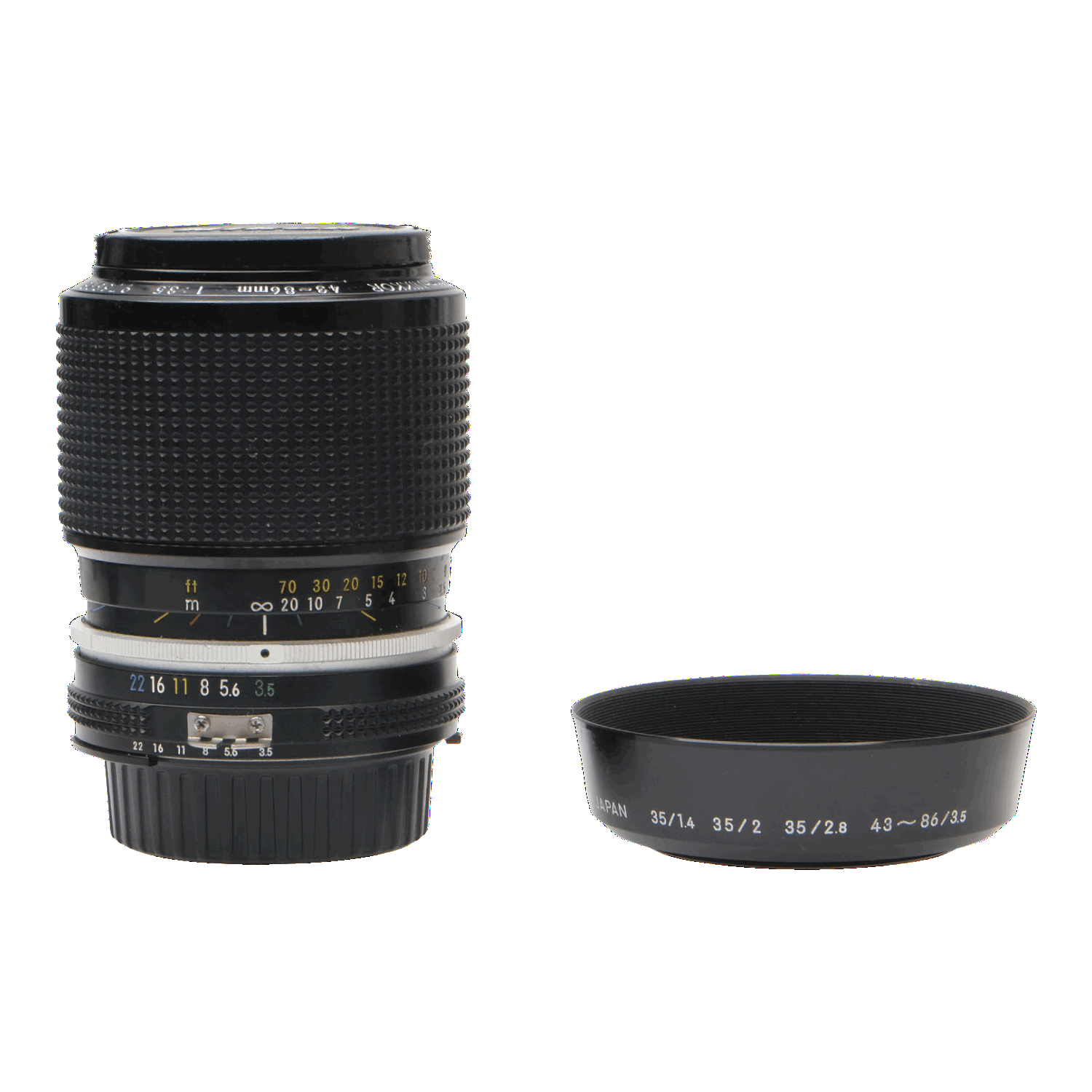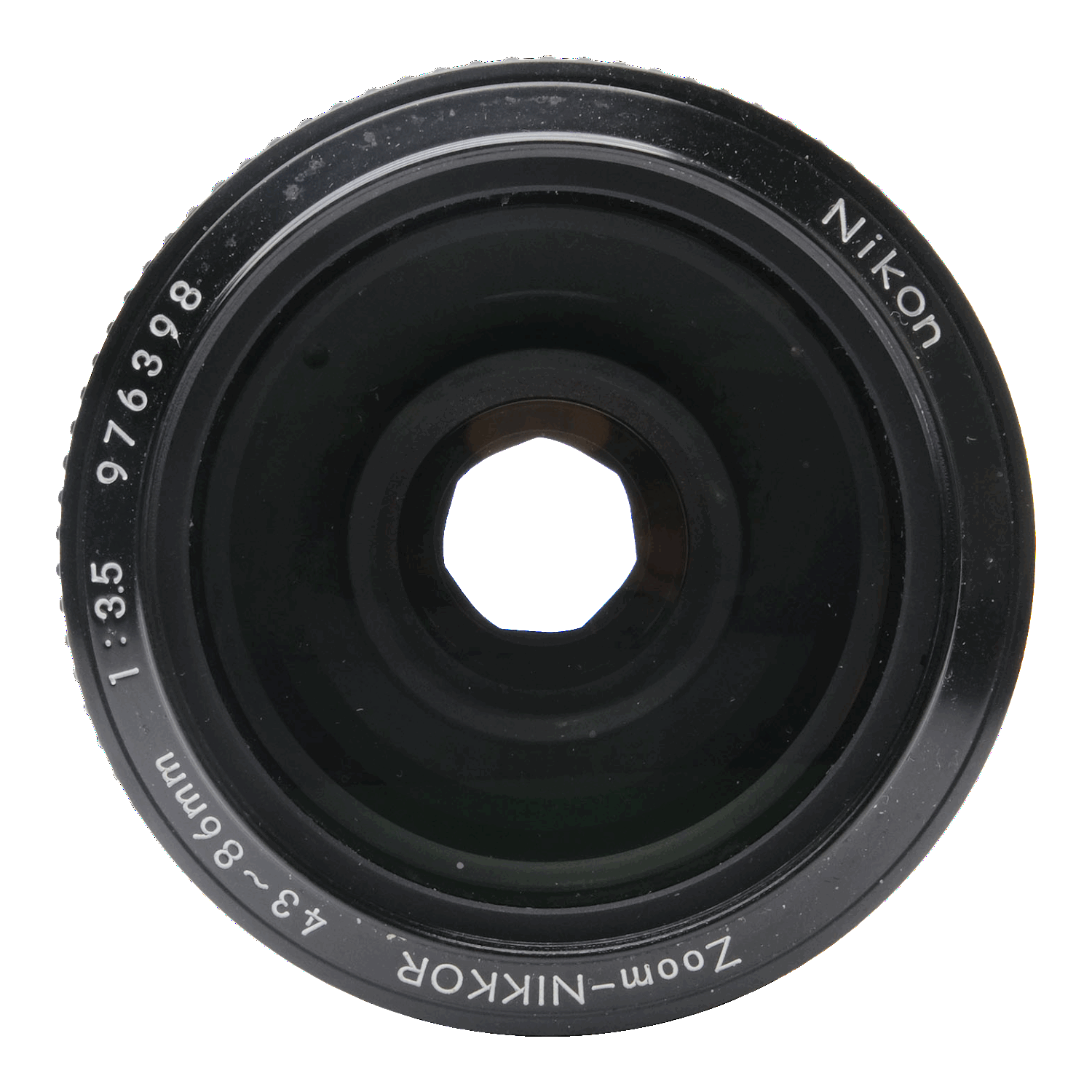 This Nikon AI 43-86mm f3.5 Nikkor Zoom Lens, #976398, is in good condition with some handling wear. I rate it cosmetically an (8+). The aperture ring is smooth, but the focus ring and zoom are a bit stiff. The aperture functions properly and the glass is clean and clear with no haze, marks, or fungus. There are a few faint specks of dust inside, but they do not affect image quality. This lens includes a Nikon lens hood and front & rear caps. Please refer to the photos for details.