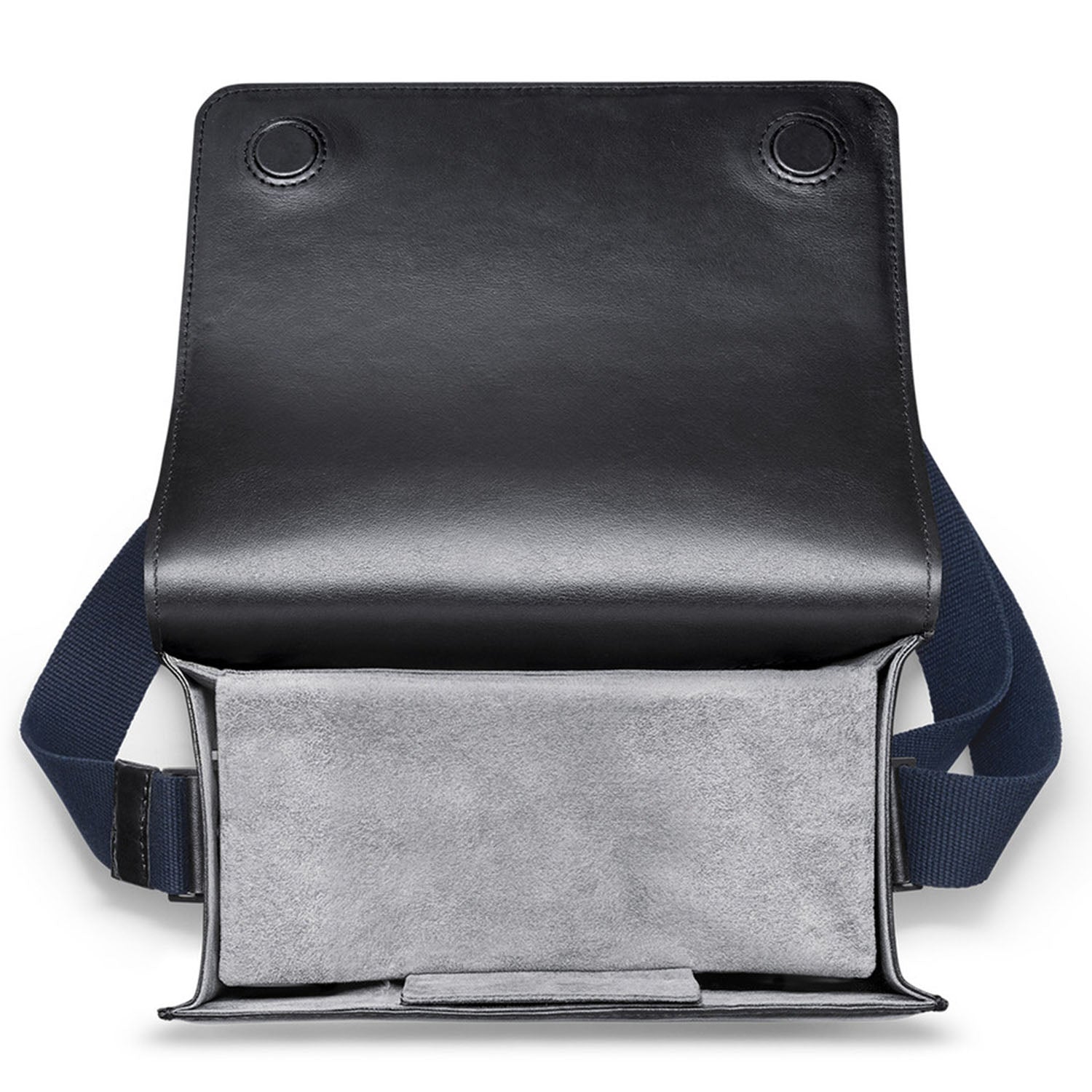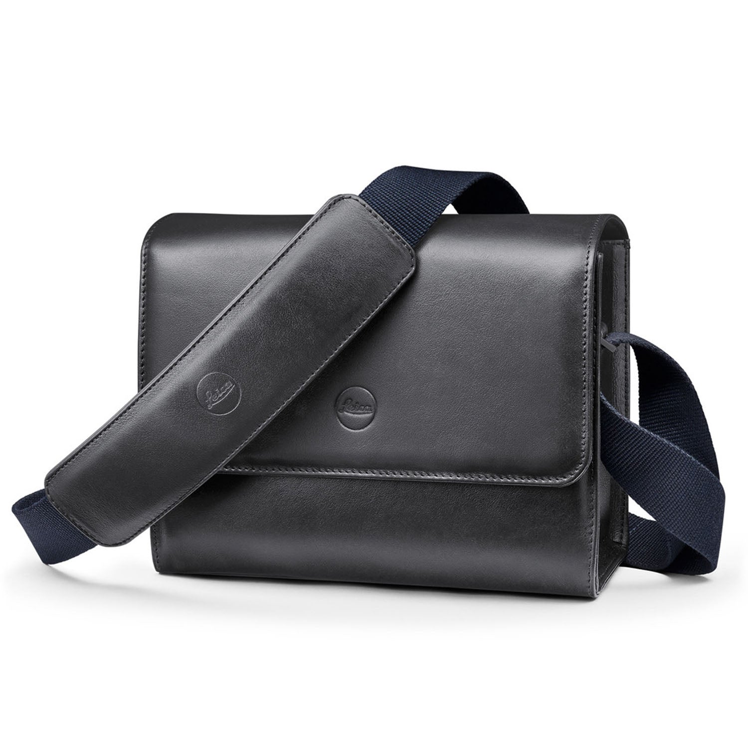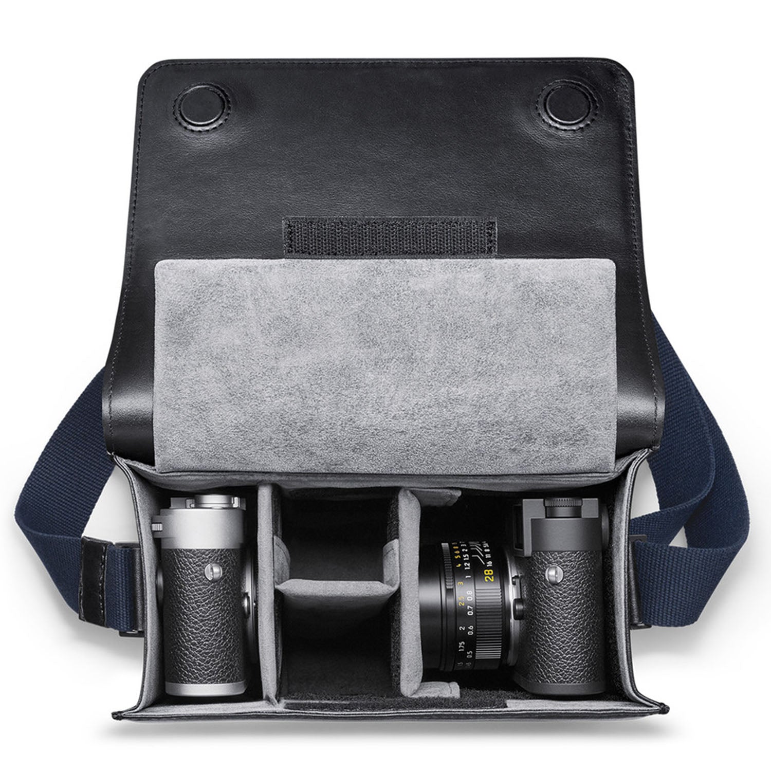 This elegant camera bag made of high-quality black cowhide is ideal for stowing an M camera and up to two lenses when out and about. Concealed magnetic closures on the flap lend it a stylish, discreet look, while shoulder padding on the navy-blue adjustable cotton strap ensures it’s comfortable to carry. The inside of the bag is made of grey micro suede and has an inner flap for additional protection of the equipment. Besides the camera and lenses, there is also room for a mini tablet at the back of the bag.