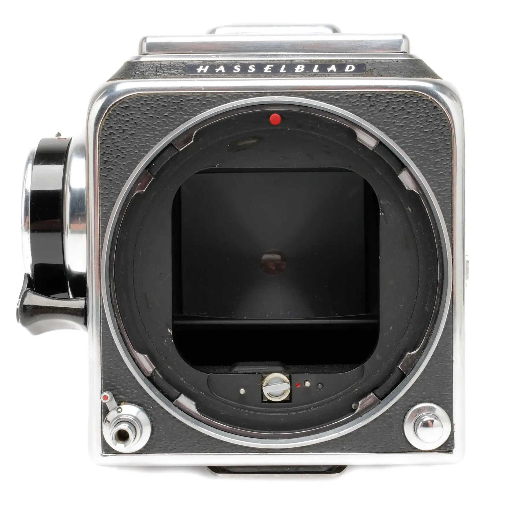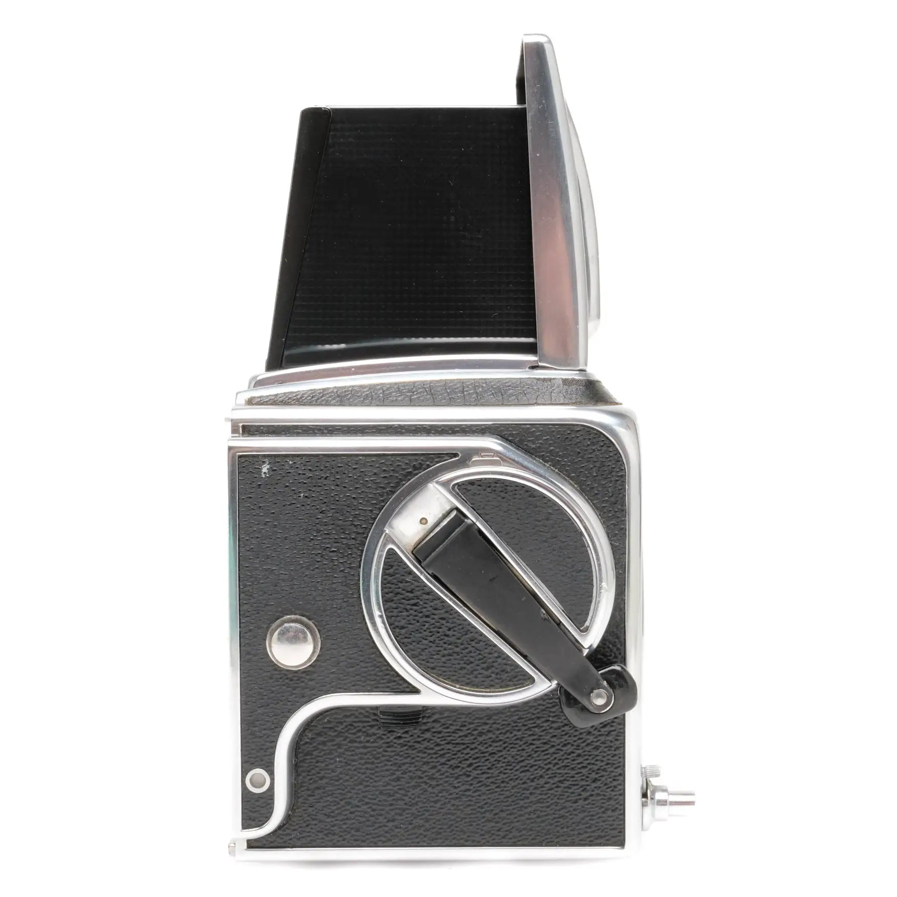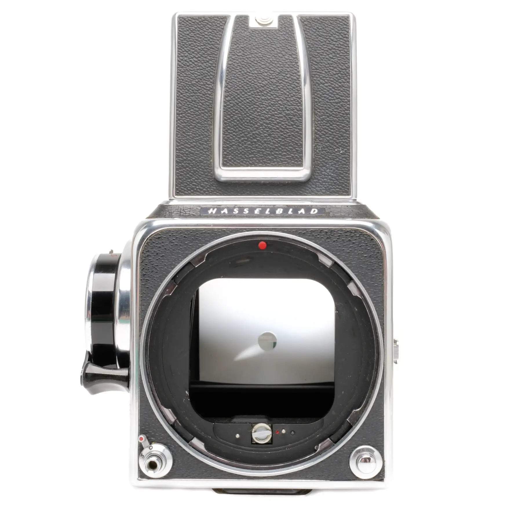 This Hasselblad 500C Camera Body, #TT65515, is in nice condition with minor edge and handling wear. I rate it cosmetically at (9) condition. The advance crank has been upgraded to the rapid wind version and the advance is smooth. The camera cycles properly and does not need to be serviced. It comes with a rear cap, waist level finder and installed, non removable, split image focusing screen.