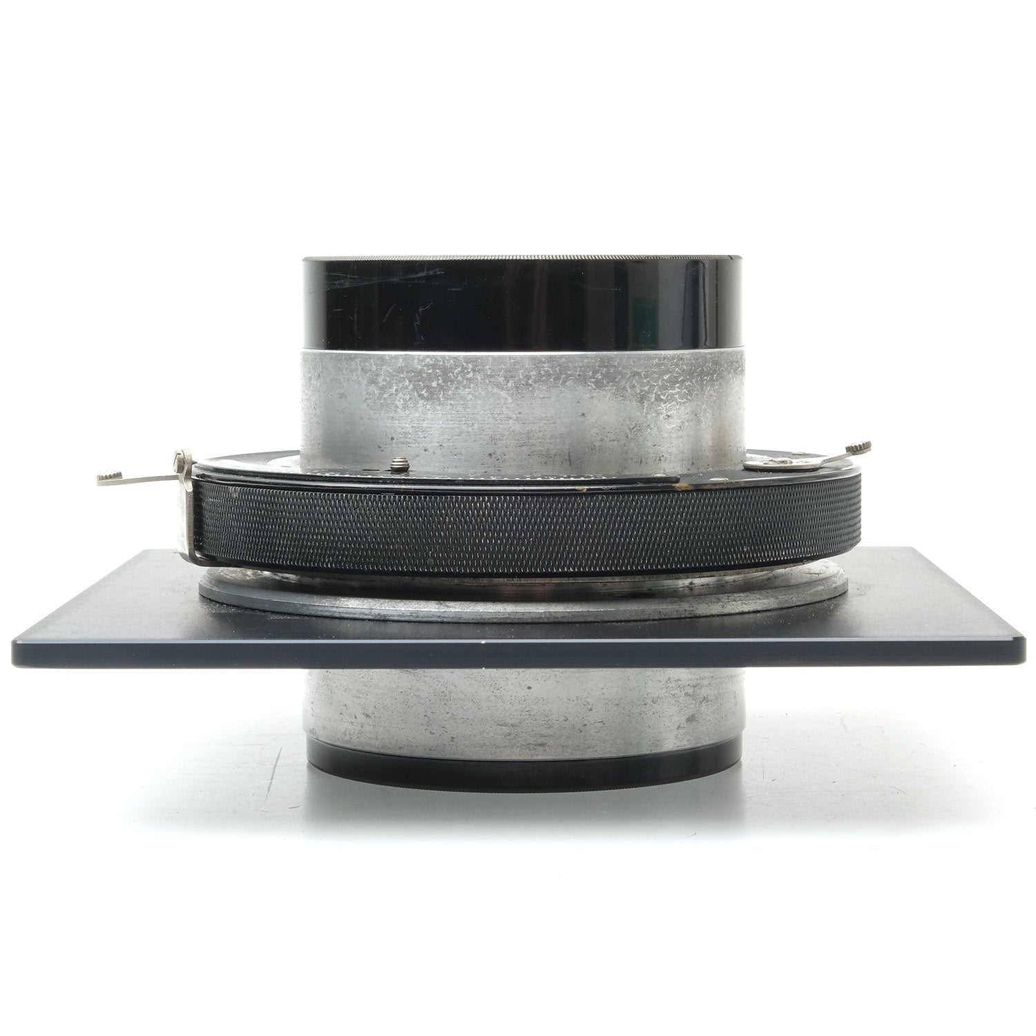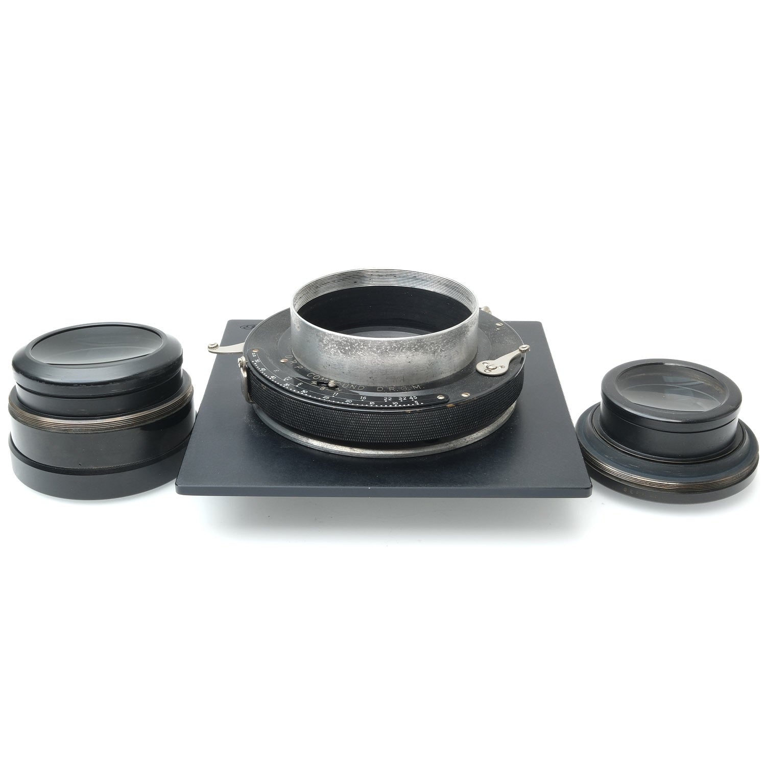 This Zeiss Protarlinse VII Triple Convertible Lens is in good condition with some handling wear. I rate it cosmetically an (8+). The front element, #798856, is 59cm (590mm) and the glass is clean and clear with no haze, marks, or fungus. There's some faint dust inside. The rear element, #160377, is 48cm (480mm) and the glass has no haze or fungus, but there are some faint marks and dust. Due to the front & rear elements not being matching serial numbers, we cannot determine the combined focal length. Used individually, each element has coverage up to 11x14", but the combined coverage is likely only 8x10". The included Compound shutter has an f-stop range from f7.2 to f45, but since the elements are mismatched, the shutter is also mismatched and we cannot determine the exact aperture of the lens in any of the three configurations. The shutter speed wheel and aperture lever are extremely stiff, and the shutter is inaccurate at speeds below 1/75. The shutter functions in B & T mode. This lens includes an SK Grimes lens board and front & rear caps.