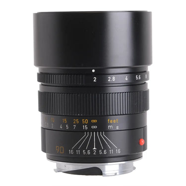 This Leica 90mm f2 Summicron-M Lens #3264428, is in very good cosmetic condition with minor signs of handling wear found throughout, please see photos for visual reference. Cosmetically, this lens has been rated at a (9) condition. This lens is in proper working order; the aperture and focus turn smoothly, and the glass is clean with no signs of fungus or haze present. This lens comes with a front cap and a rear cap only. This lens is ready for use!