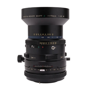 This Mamiya 75mm f/4.5 Shift lens for RZ is in average cosmetic condition with normal handling and edge wear found throughout; please see photos for visual reference. Cosmetically, this lens has been rated at a (8) condition. This lens is in proper working order; the shift mechanism operates smoothly, and the aperture and focus function properly. The glass has no marks or fungus. Please note, there is moderate internal dust and minor haze. This lens includes front/rear caps.