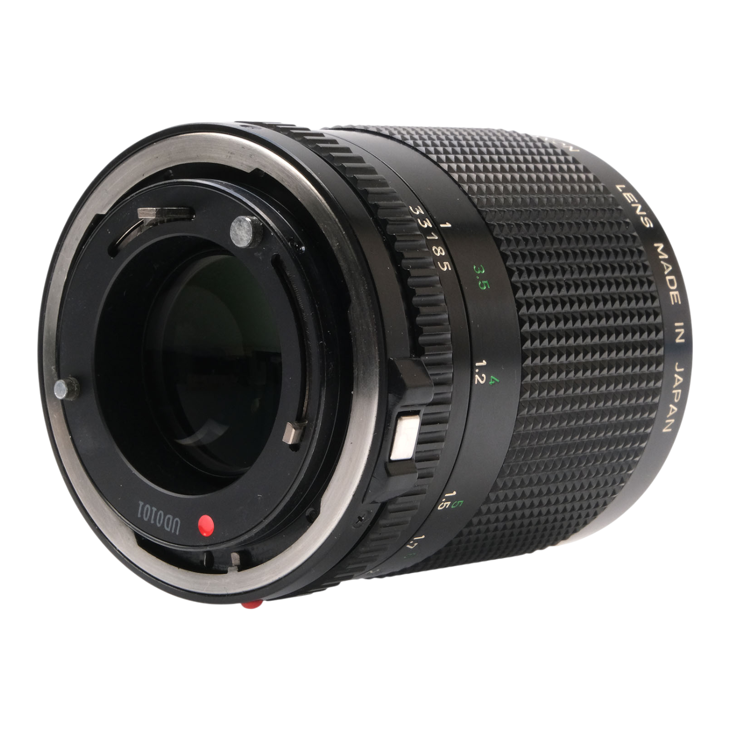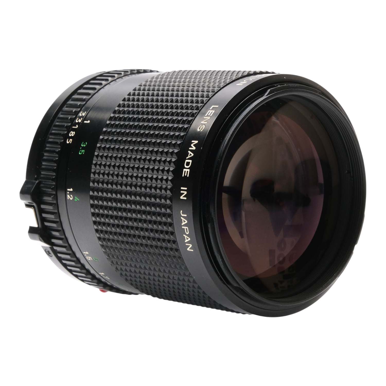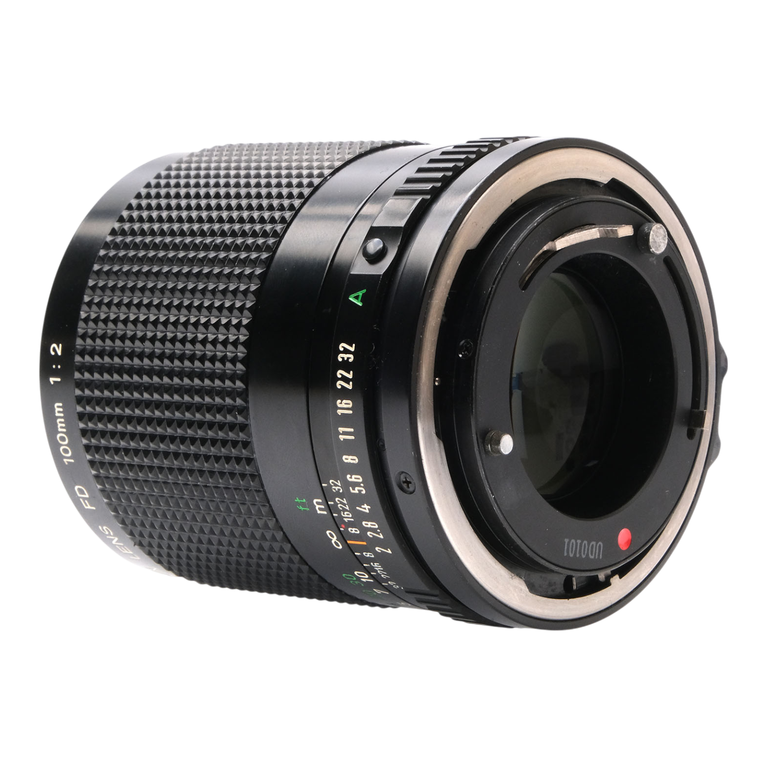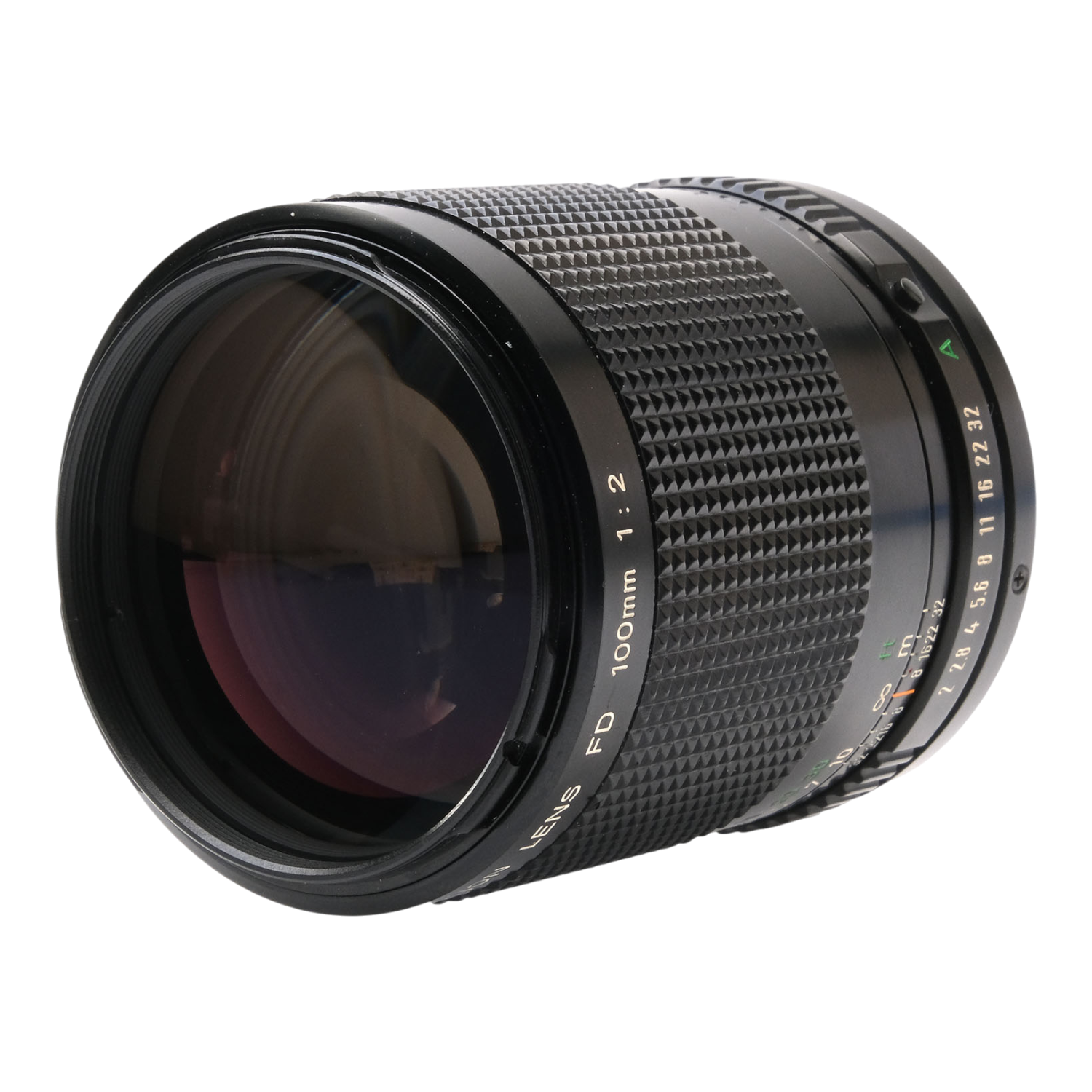 This Canon FD 100mm f2 Lens, #33185, is in great condition with minor handling wear. I rate it cosmetically a (9+). The focus ring is smooth, but the aperture ring is a bit stiff. The aperture functions properly and the glass has no marks or fungus, but there's some faint haze and dust inside. This lens includes front & rear caps. Please refer to the photos for details.