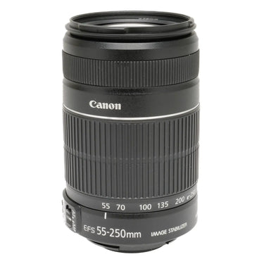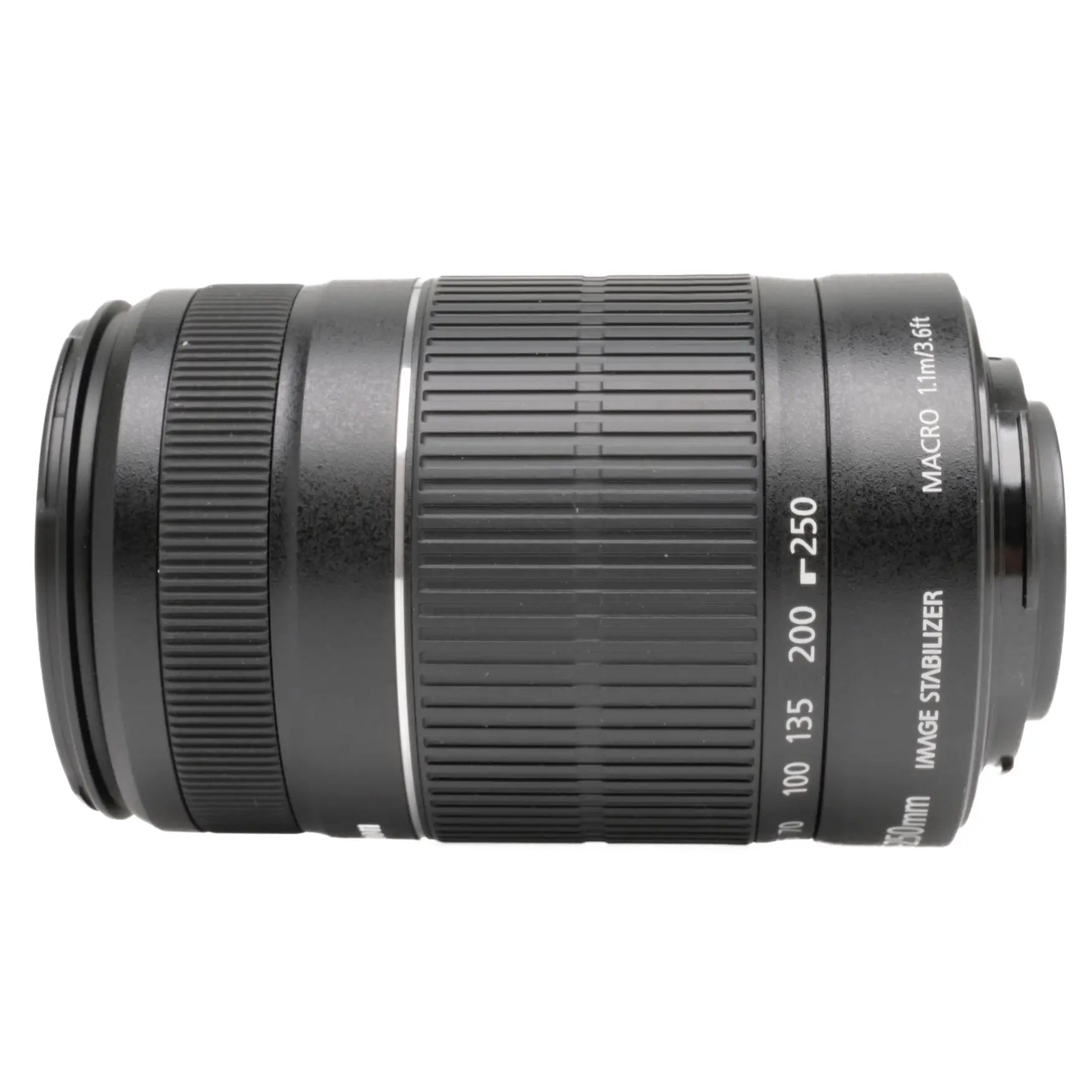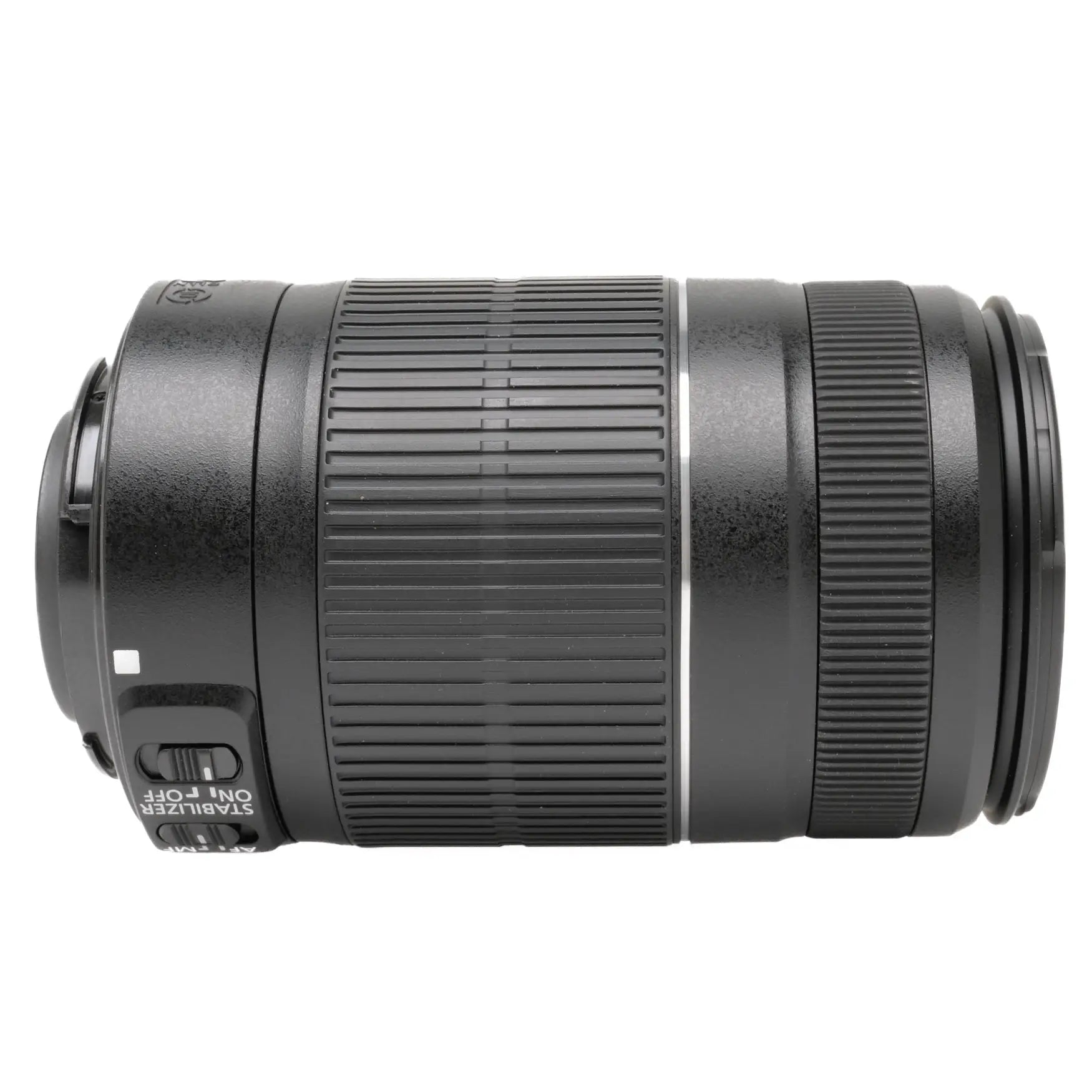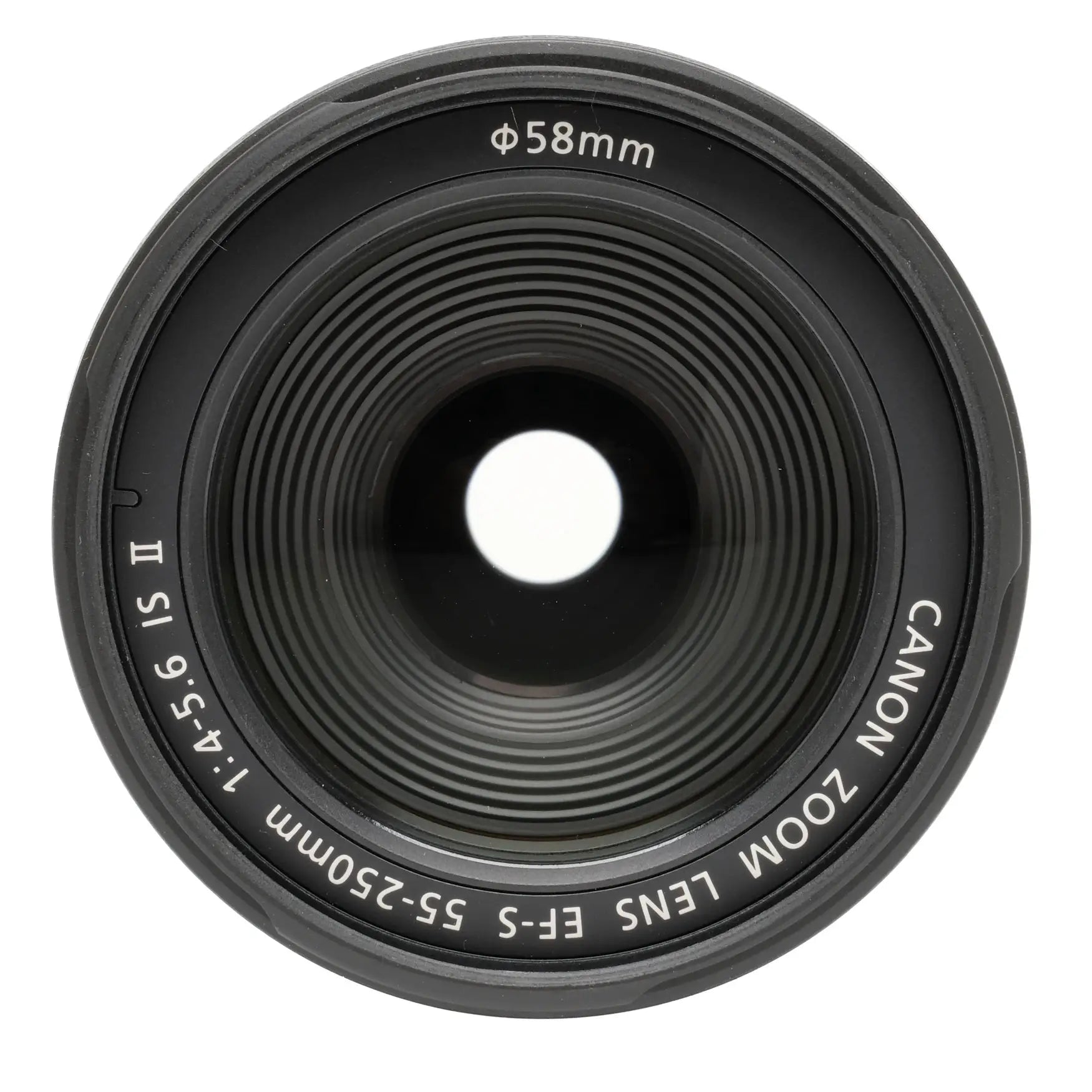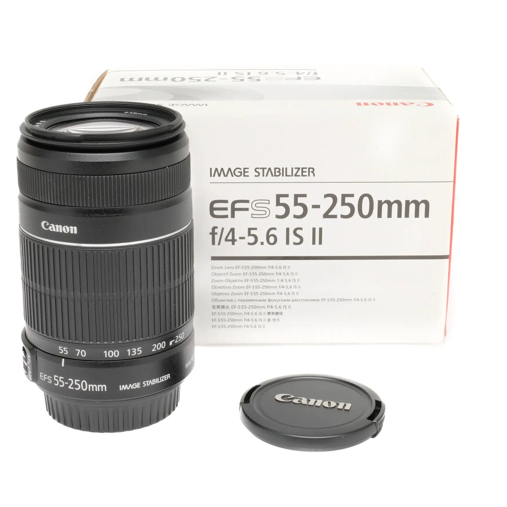 This Canon 55-200mm f4-5.6 IS II Zoom Lens, #8202069164, is in nice condition with minor handling wear. I rate it cosmetically at (9) condition. The focus and zoom are smooth and the aperture works properly. The glass is clean and clear with no haze, marks or fungus. This lens comes with both caps and original box