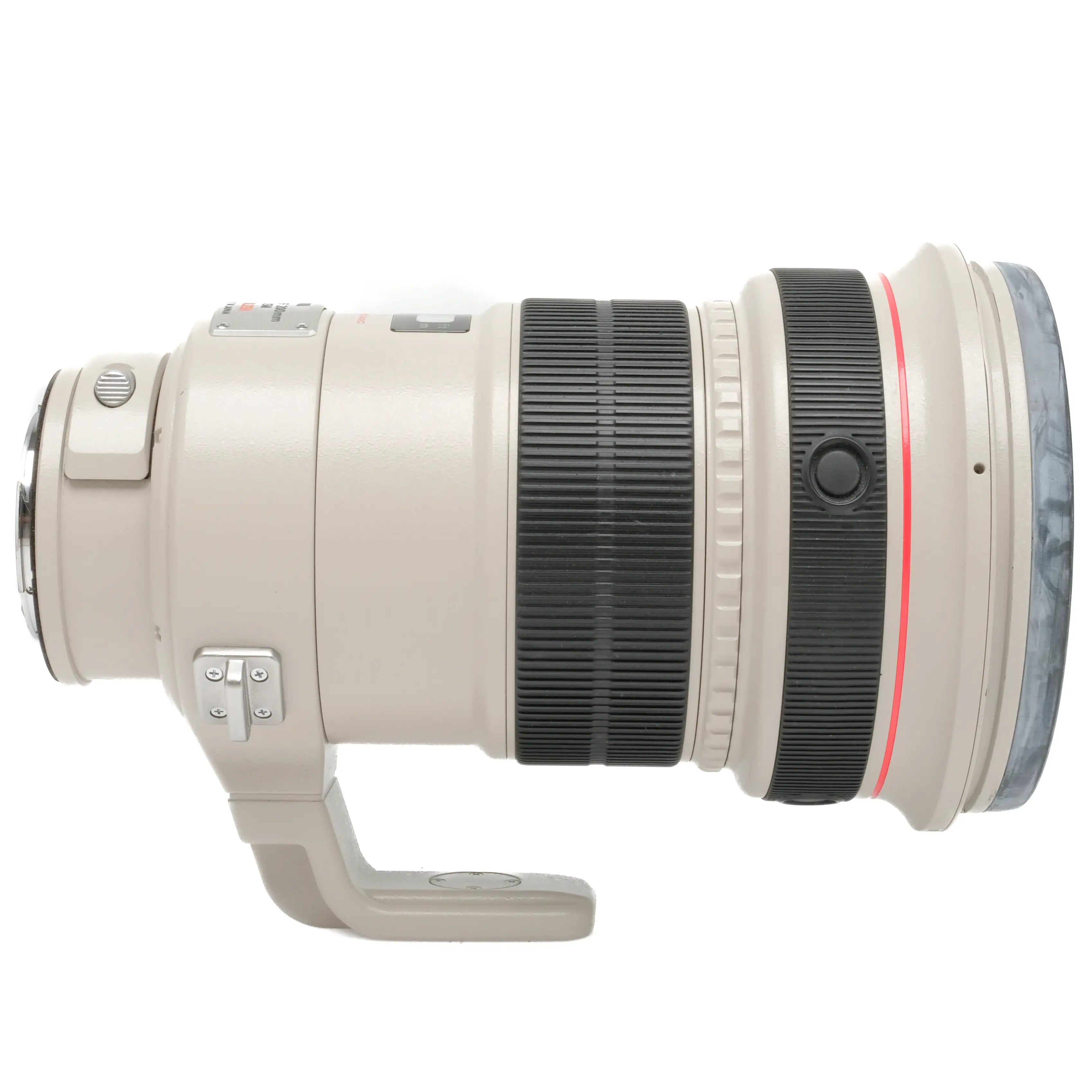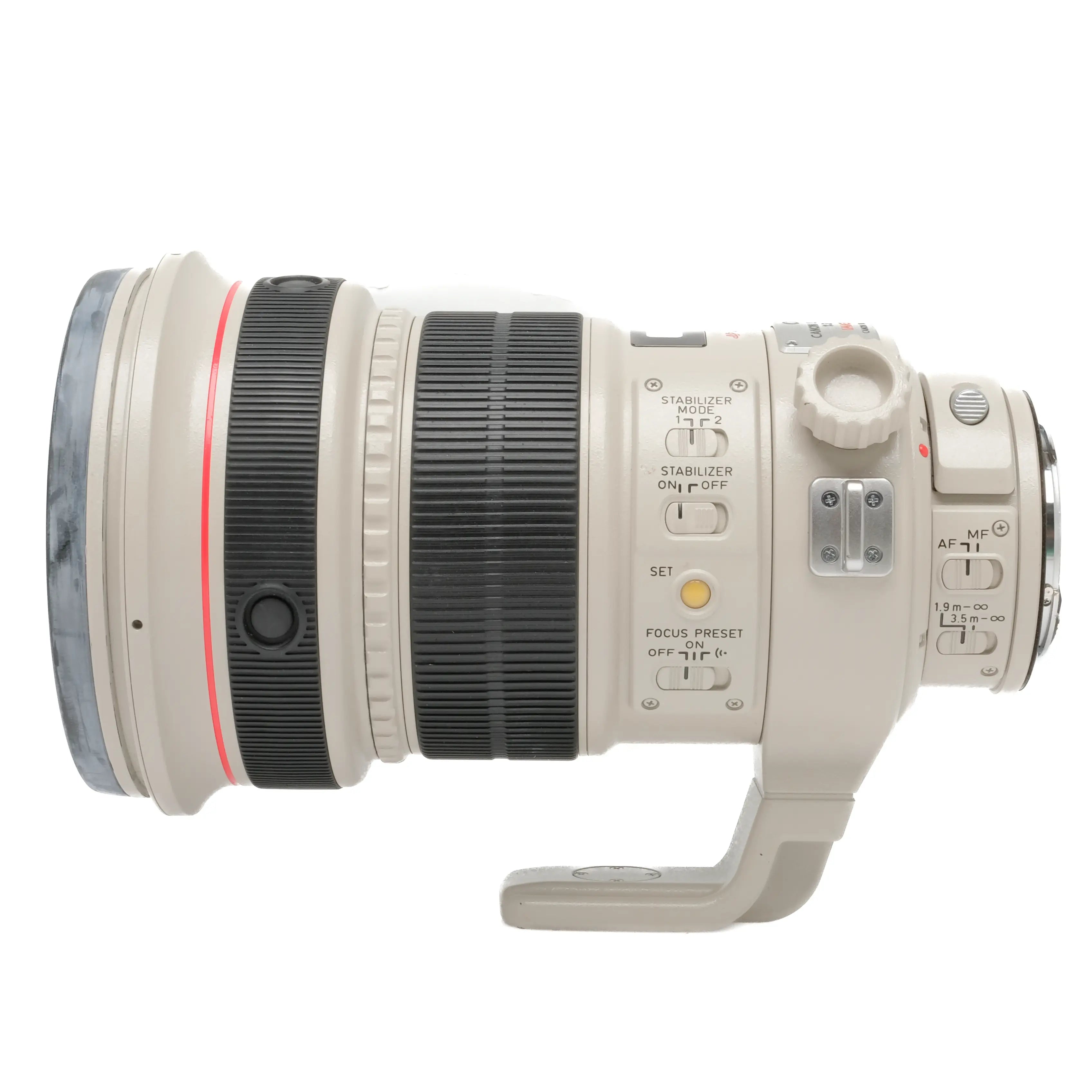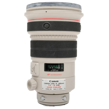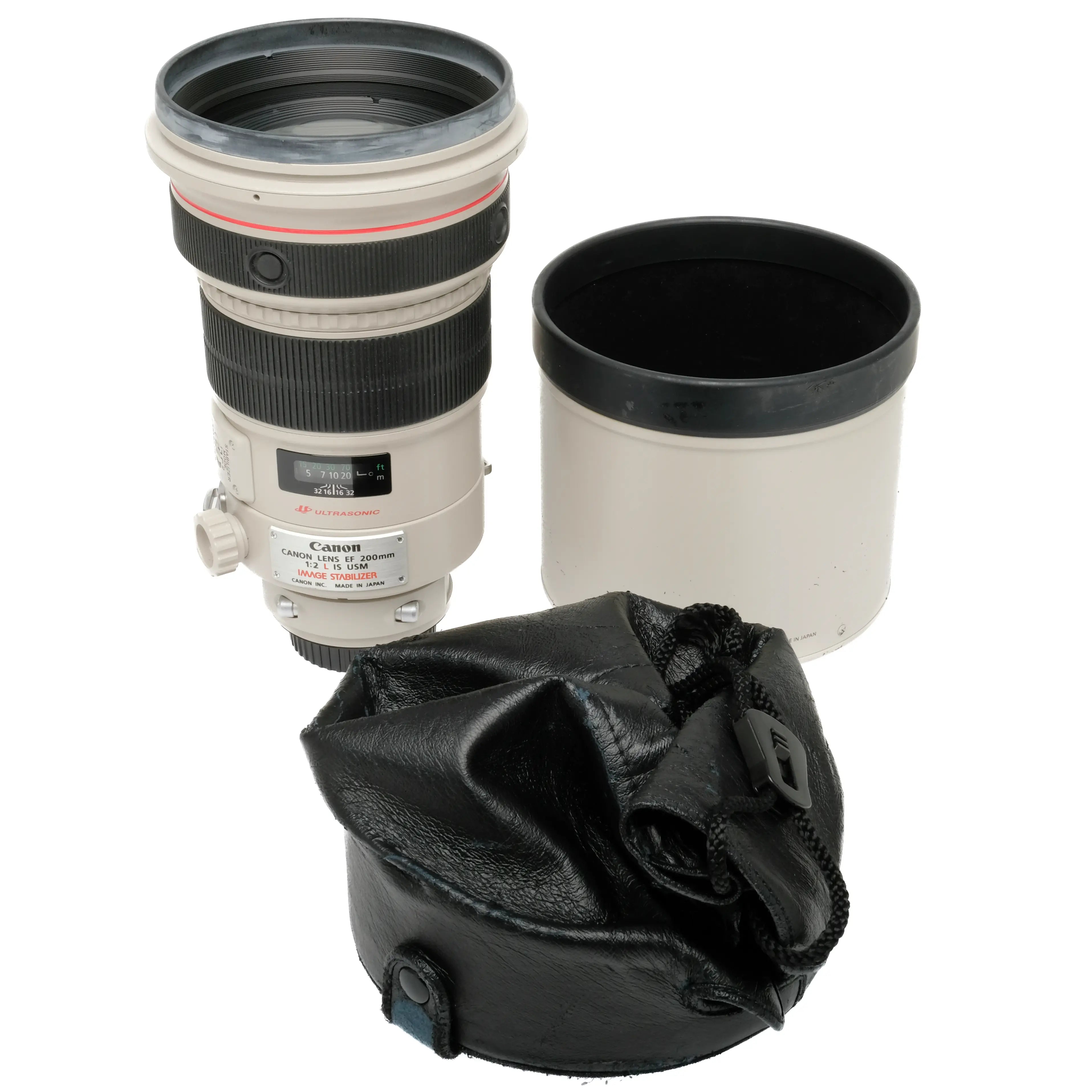 This Canon 200mm f2 L IS #11249 is in great cosmetic condition with minor handling wear throughout. Cosmetically, it is rated (9). It is in proper working order; autofocus is accurate and focus is smooth. The glass is clean and clear with no marks fungus or haze. This lens includes a rear cap, hood and soft cover. Please note the soft cover shows age-related deterioration.