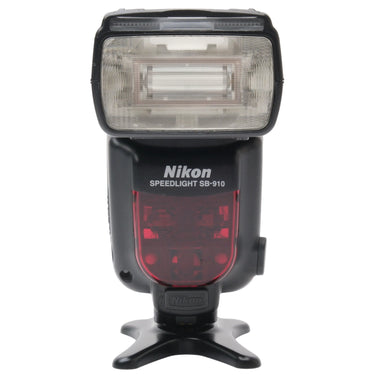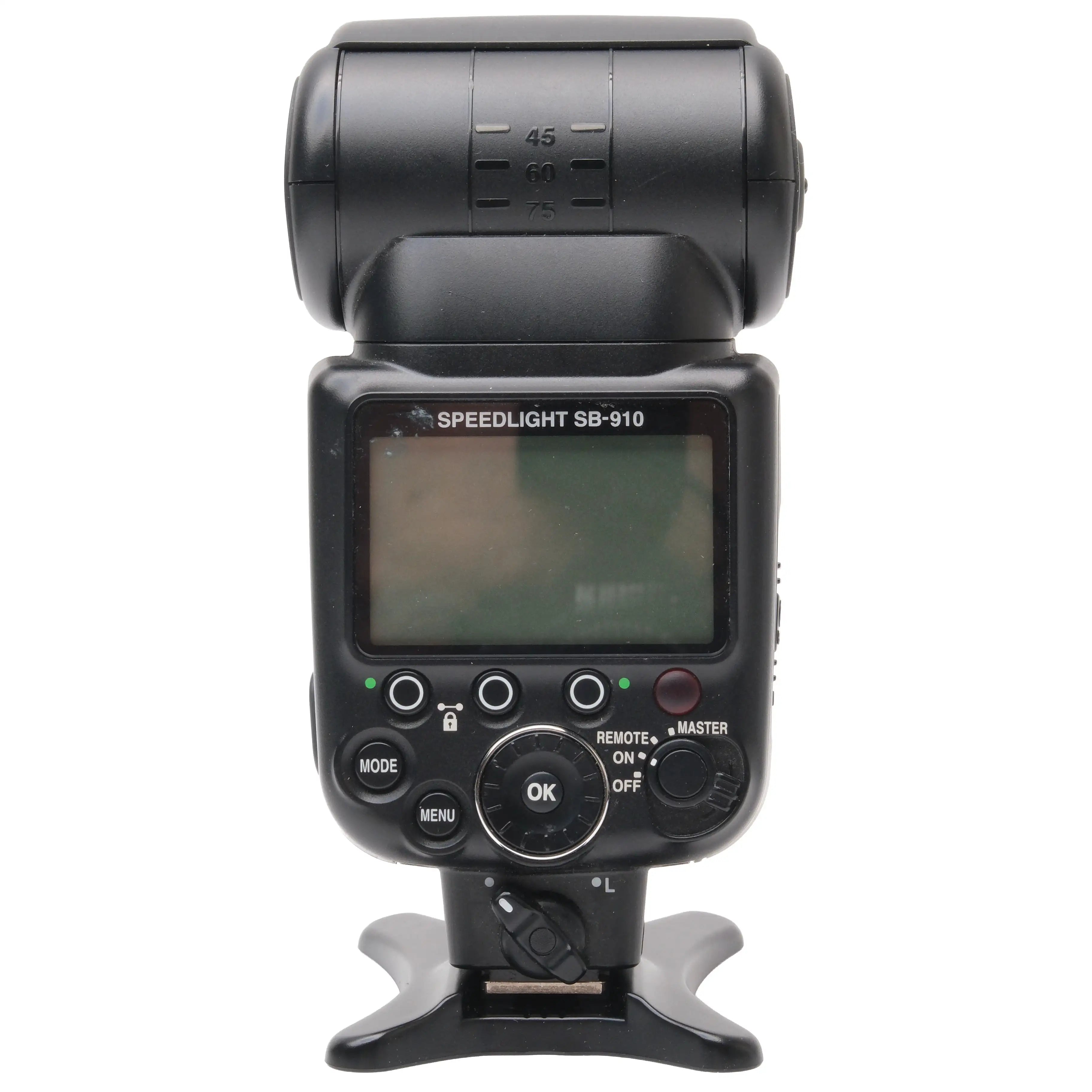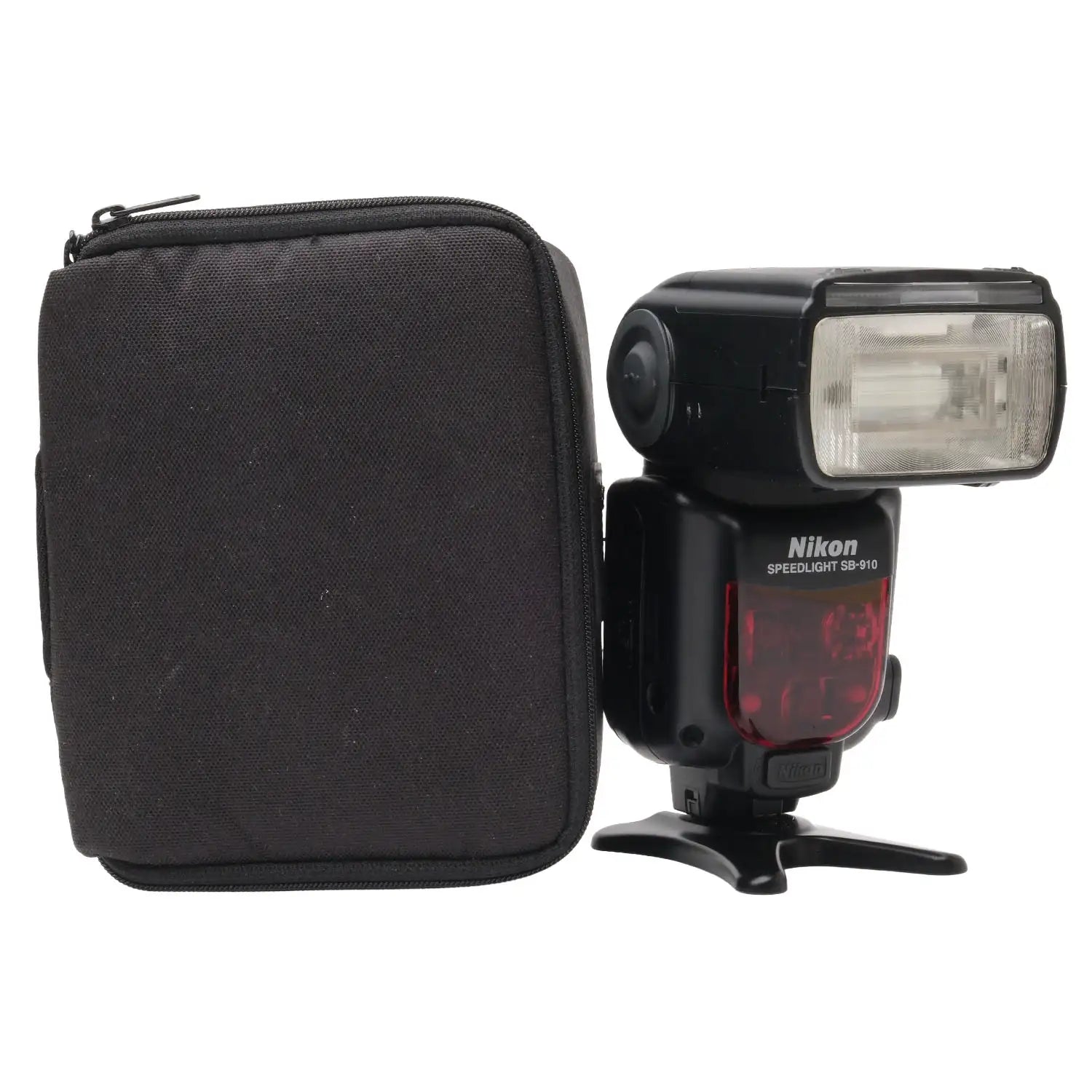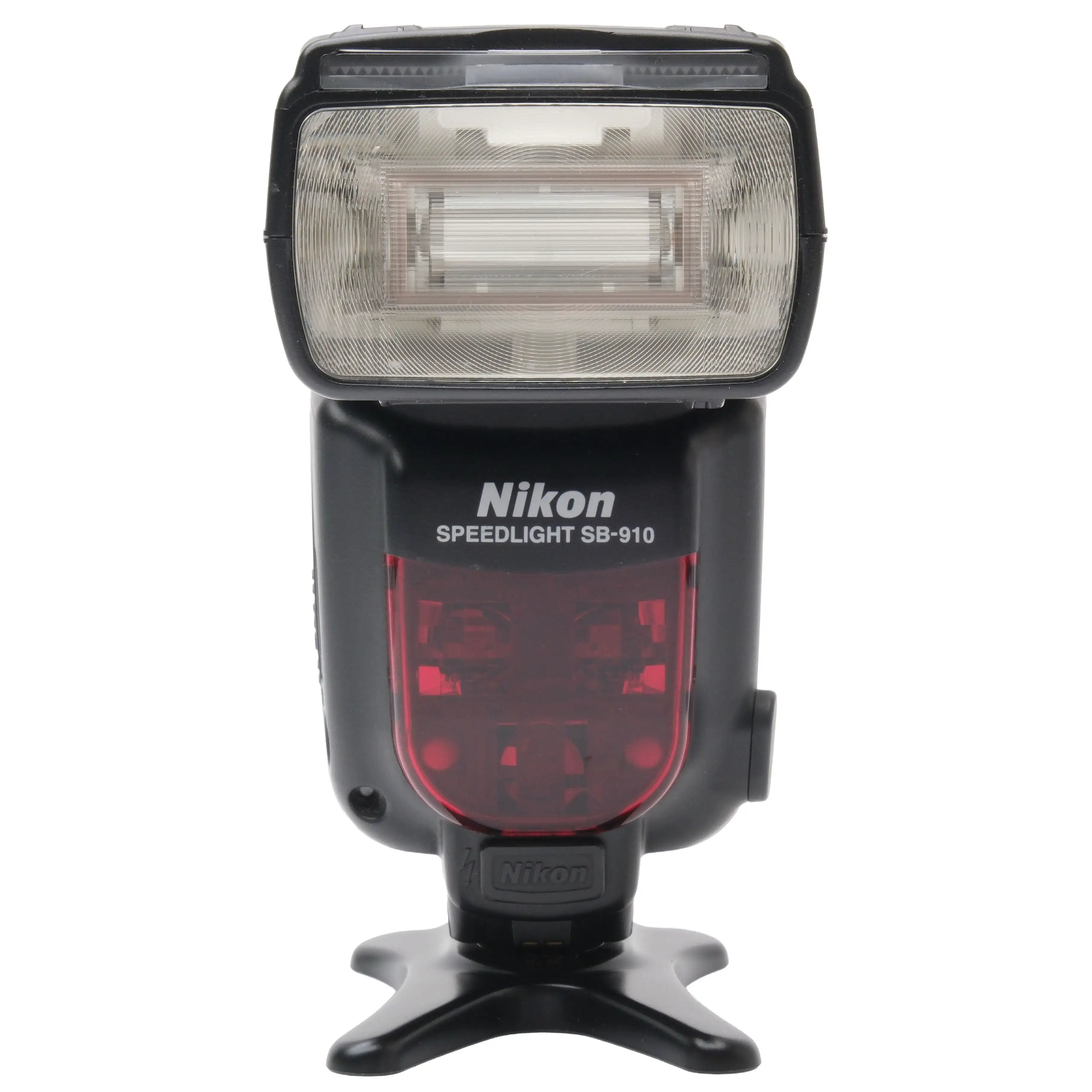 This Nikon Speedlight SB-910 Flash, #2034369, is in good condition with some handling wear. I rate it cosmetically an (8+). The flash is in proper working order and ready to be used; it fires and the battery compartment is corrosion-free. This flash includes a Nikon case and a tabletop stand. It uses four (4) AA batteries (not included). Please refer to the photos for details.