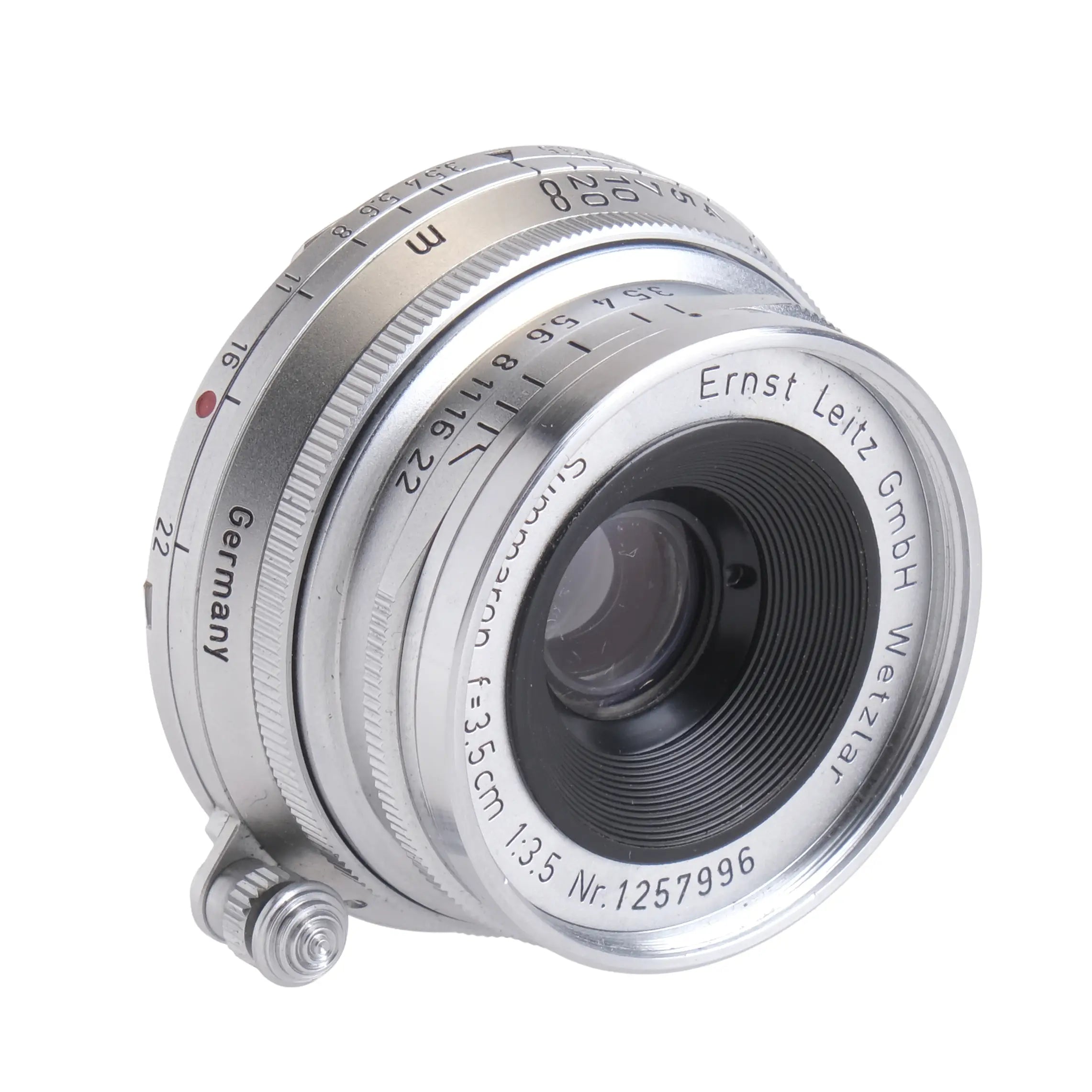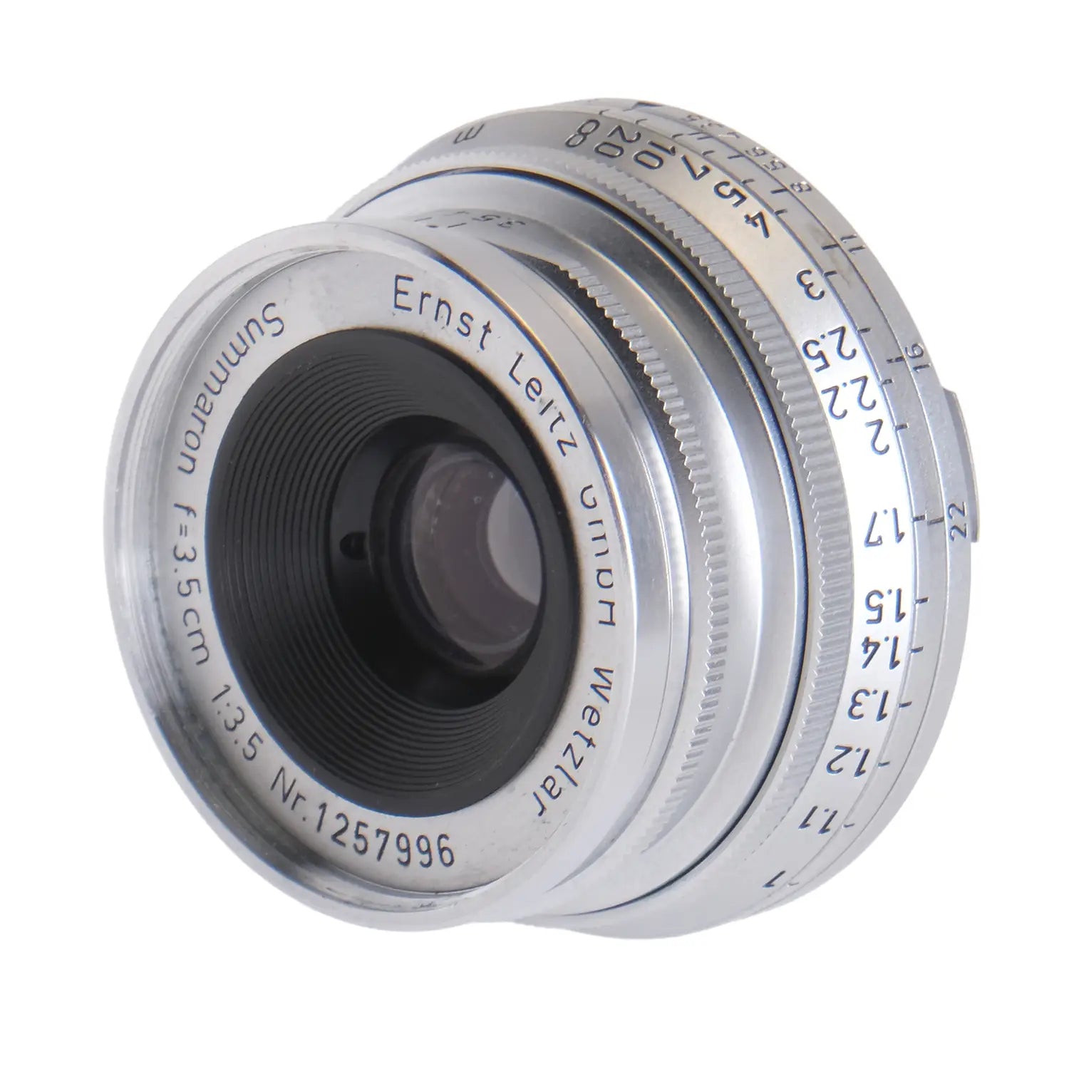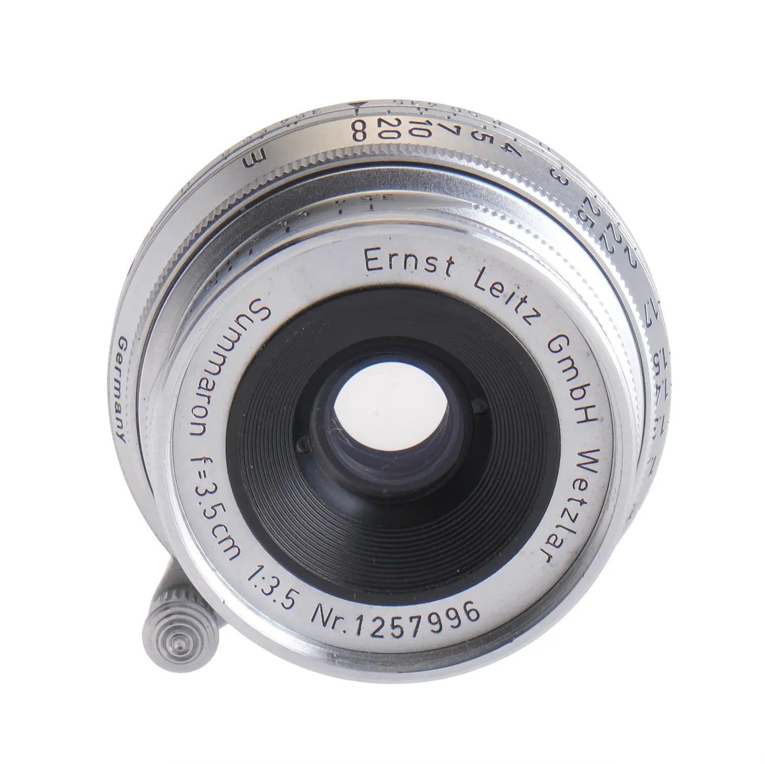 This Leica 3.5cm f3.5 Summaron Lens #1257996, is in very good cosmetic condition with minor signs of handling wear found throughout, please see photos for visual reference. Cosmetically, this lens has been rated at a (9) condition. This lens is in proper working order; the aperture and focus turn smoothly, and the glass is clean with no signs of fungus or haze present. This lens comes with a front cap and lens bubble only. This lens is ready for use!