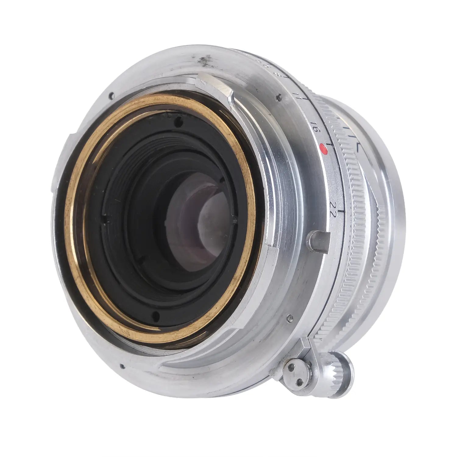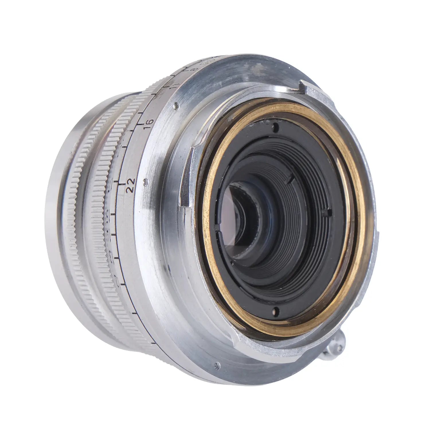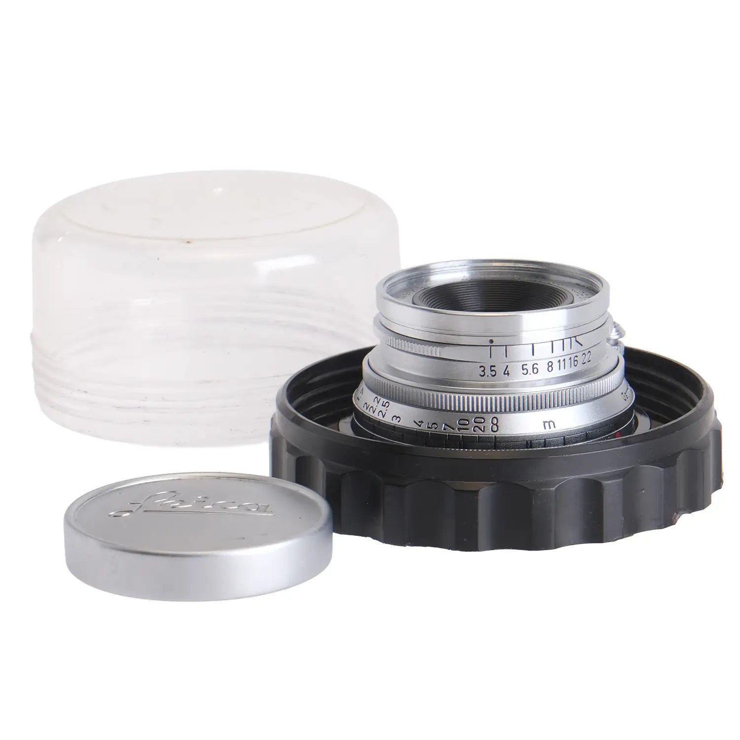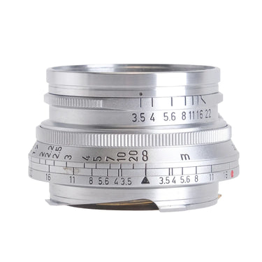 This Leica 3.5cm f3.5 Summaron Lens #1257996, is in very good cosmetic condition with minor signs of handling wear found throughout, please see photos for visual reference. Cosmetically, this lens has been rated at a (9) condition. This lens is in proper working order; the aperture and focus turn smoothly, and the glass is clean with no signs of fungus or haze present. This lens comes with a front cap and lens bubble only. This lens is ready for use!