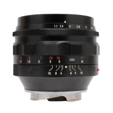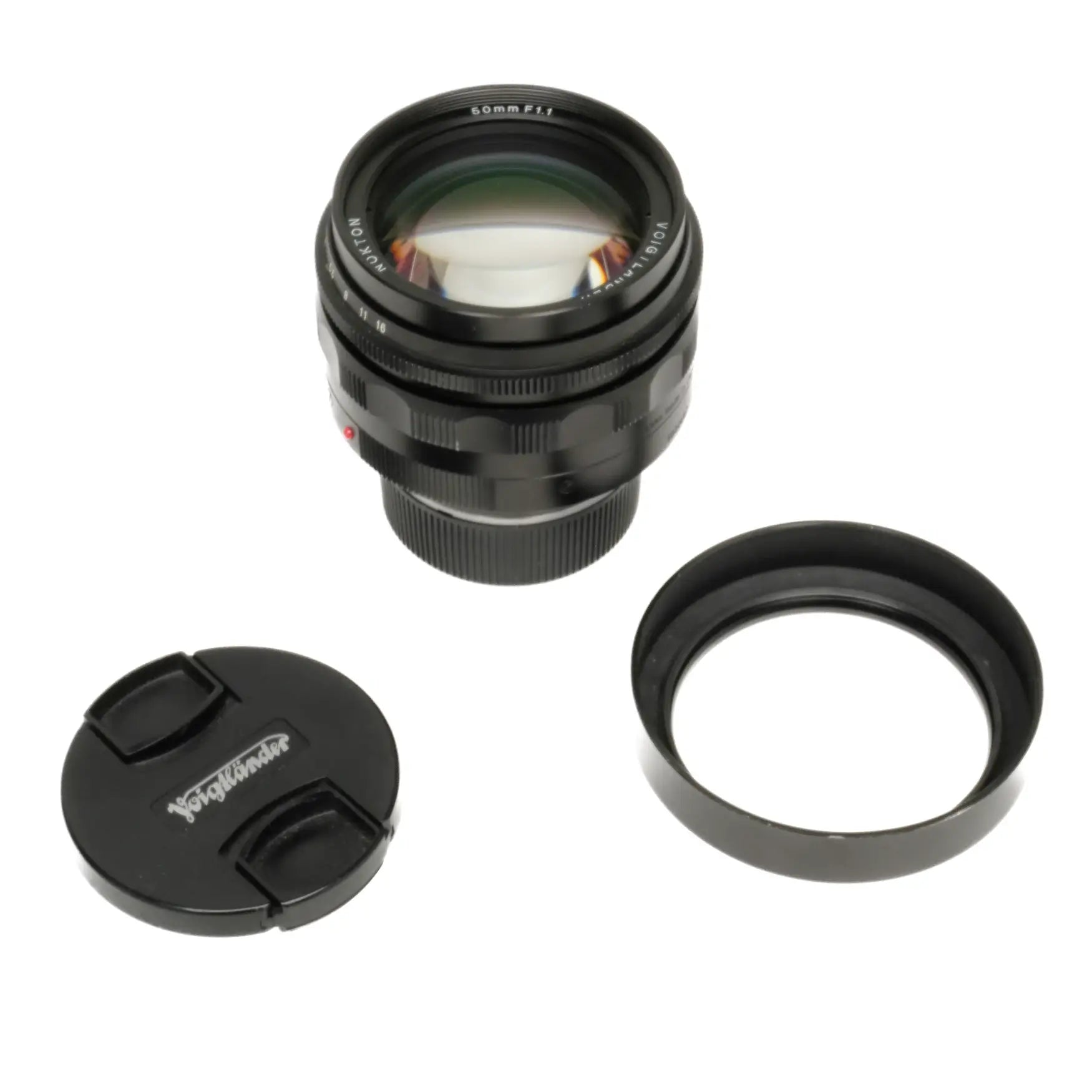This Voigtlander 50mm f1.1 Nokton #9930697 is in good cosmetic condition with minor handling/edge wear found throughout, please see photos for visual reference. Cosmetically, this lens has been rated at a (8+) condition. This lens is in proper working order; the aperture and focus are smooth, and the glass is clean and clear with no signs of fungus, haze, or marks present. This lens includes front/rear caps and hood.