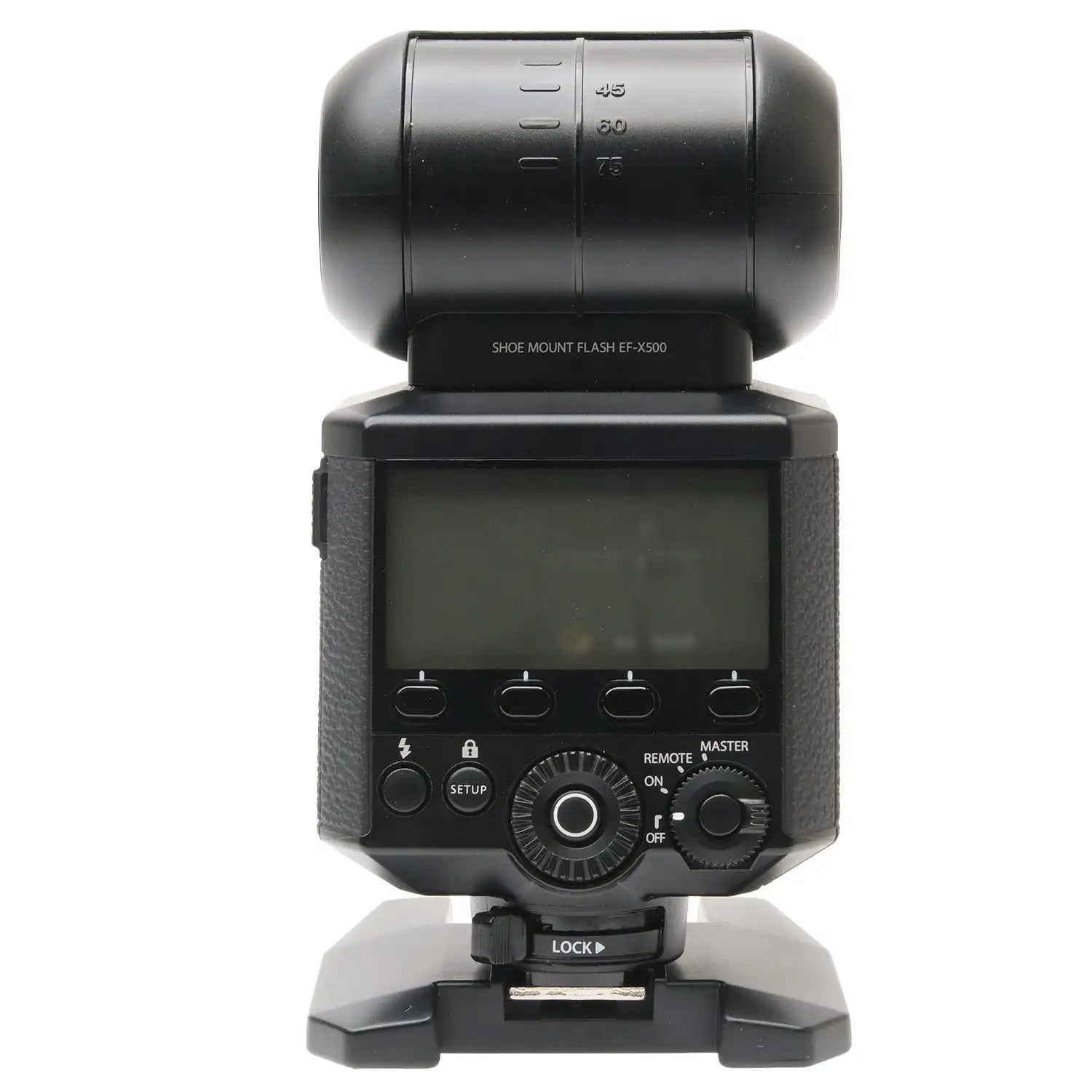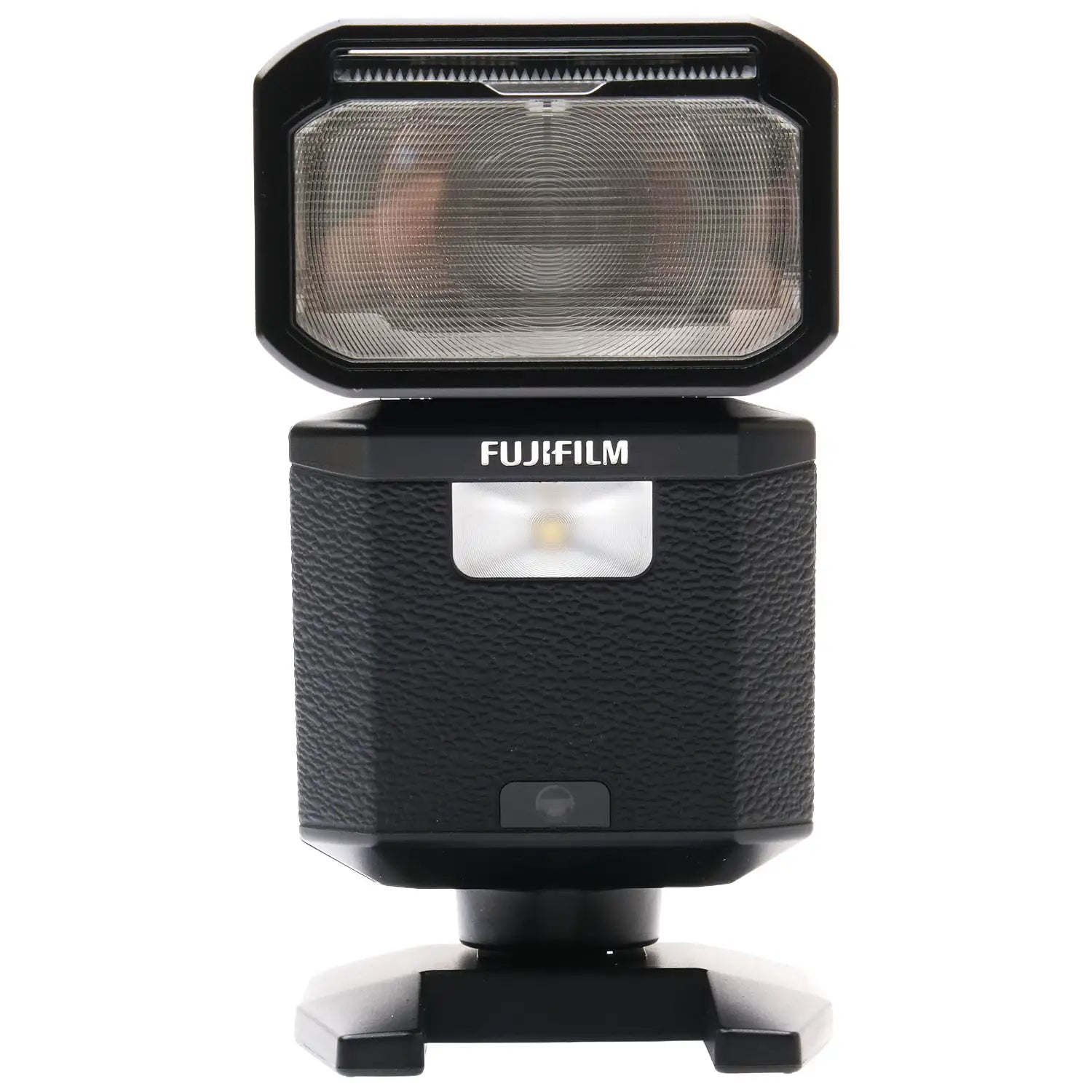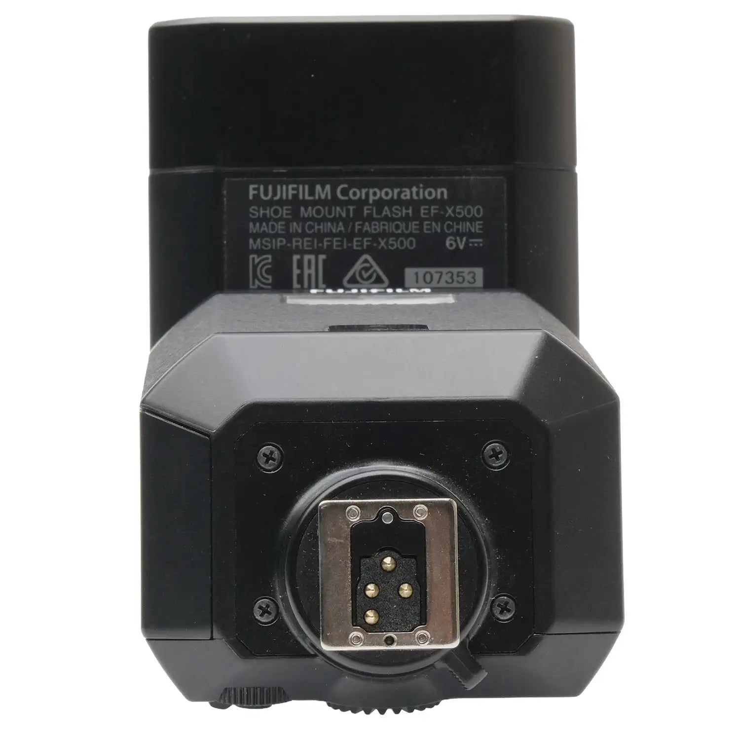 This Fujifilm EF-X500 Flash, #107353, is in great condition with minor handling wear. I rate it cosmeticaly a (9+). The flash is in proper working order; it fires and the battery compartment is corrosion-free. It includes a padded Fuji case, tabletop stand, slip-on diffuser, and the original instructions & box. It uses four (4) AA batteries (not included). Please refer to the photos for details.