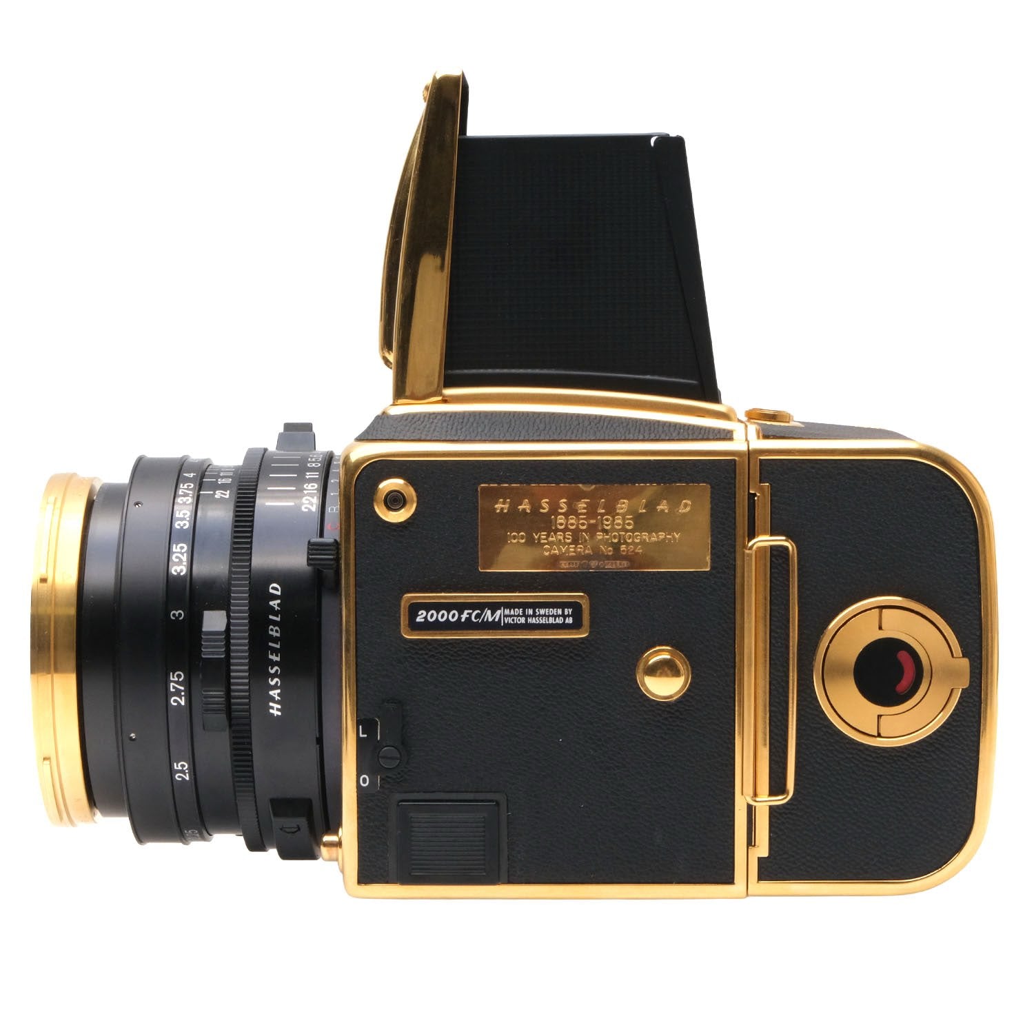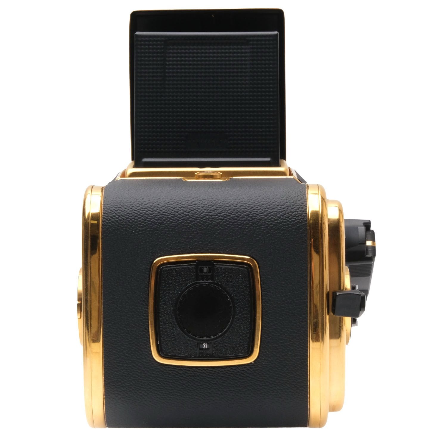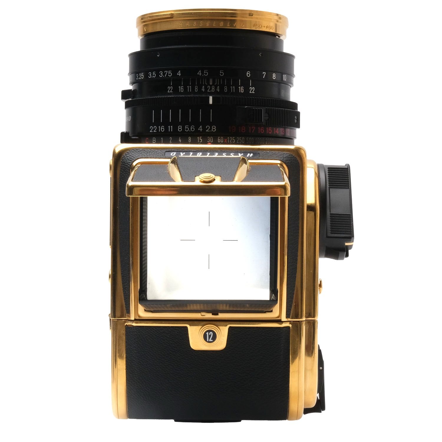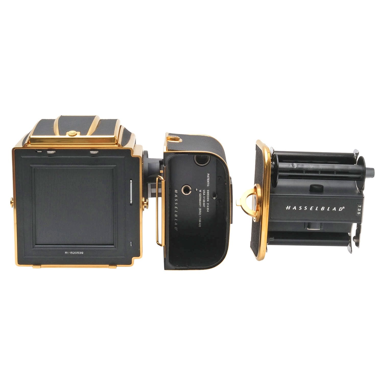 This Hasselblad 2000 FC/M (Gold), #RI1520539, is in excellent condition with only faint handling wear. I rate it cosmetically a (10-). The camera is in proper working order; the shutter fires, the electronics function, the Acute Matte Crosshair focusing screen is clear, and the battery compartment is corrosion-free. The included Hasselblad 80mm f2.8 Planar T* lens, #5872706, is in similar condition, also rated a (10-). The focus, aperture, and shutter speed rings are smooth, the shutter is accurate at all speeds, the aperture functions properly, and the glass is clean and clear with no haze, marks, or fungus. The included Hasselblad A12 Type II Film Back (Gold), #RI3264735, is also rated a (10-); film advances properly and the film holder has a matching serial number. The included waist-level finder opens & closes and the magnifier is clear, but sometimes the sides don't open up. This listing also includes a gold bayonet front ring, a gold darkslide, and the original wooden presentation case. No front cap or body caps are included. This camera uses one (1) 4LR44 battery (not included). Please refer to the photos for details.