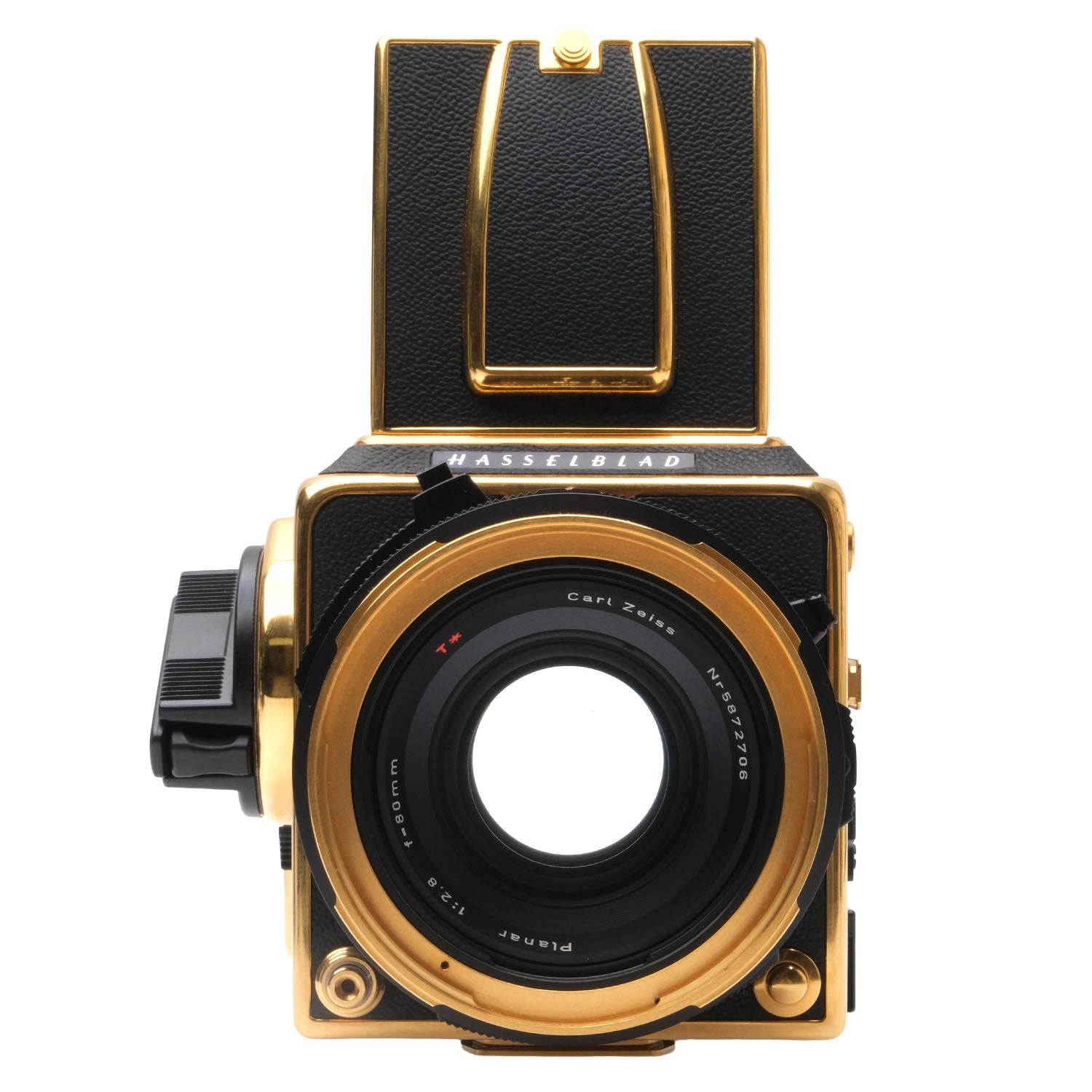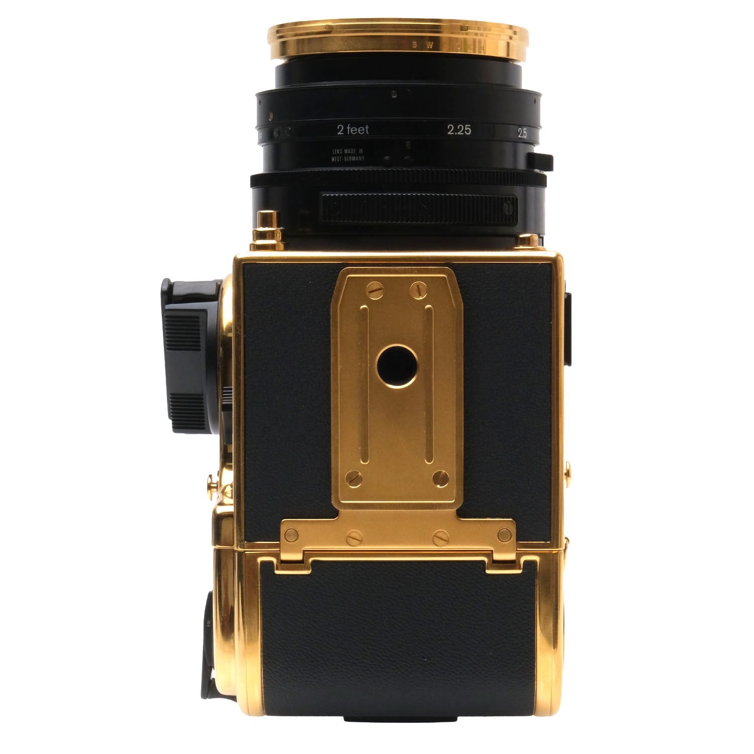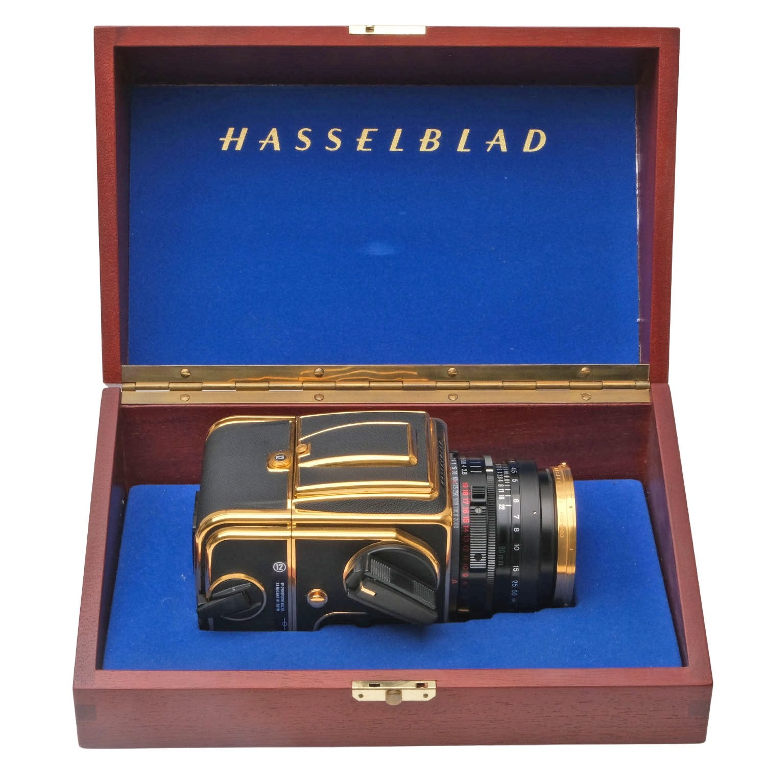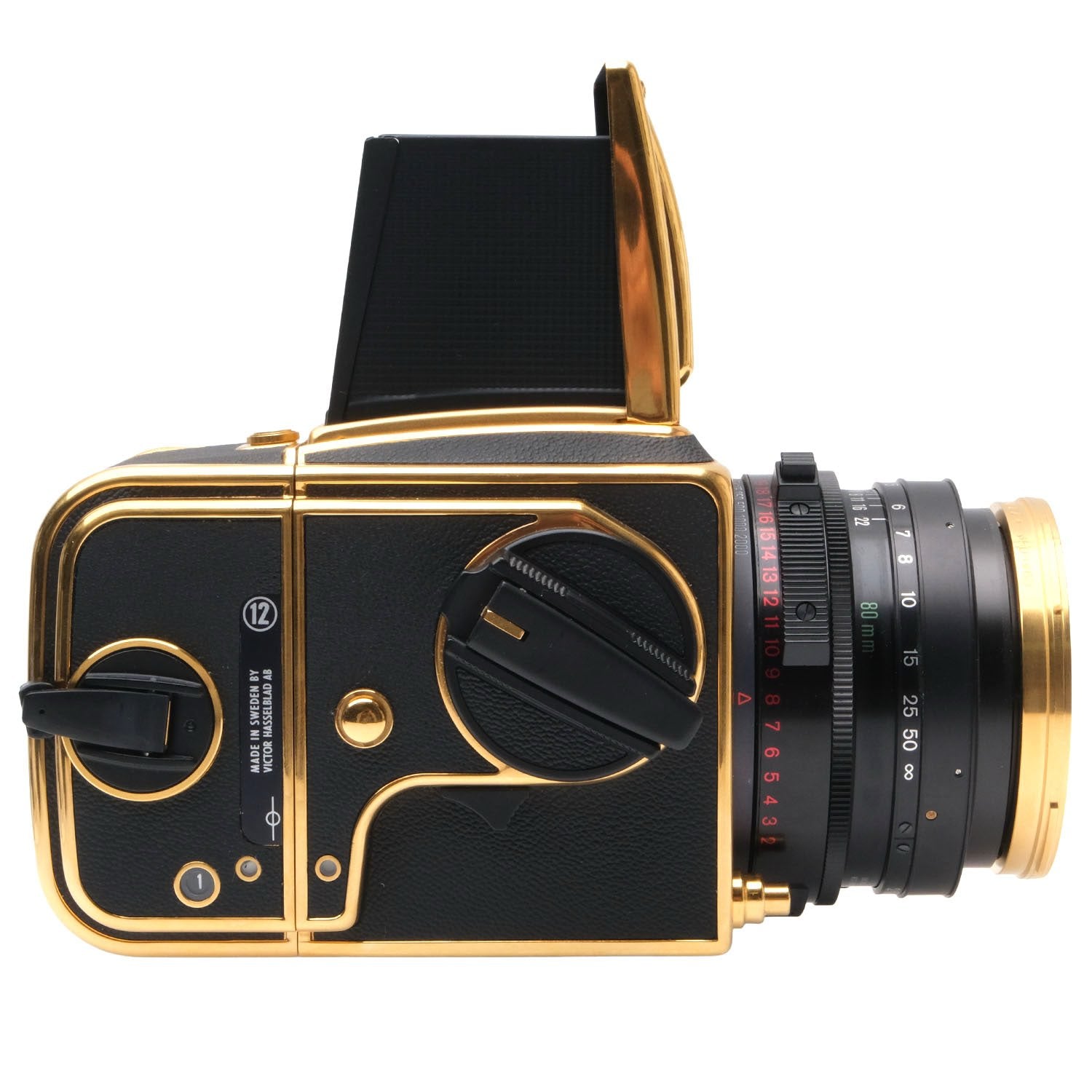 This Hasselblad 2000 FC/M (Gold), #RI1520539, is in excellent condition with only faint handling wear. I rate it cosmetically a (10-). The camera is in proper working order; the shutter fires, the electronics function, the Acute Matte Crosshair focusing screen is clear, and the battery compartment is corrosion-free. The included Hasselblad 80mm f2.8 Planar T* lens, #5872706, is in similar condition, also rated a (10-). The focus, aperture, and shutter speed rings are smooth, the shutter is accurate at all speeds, the aperture functions properly, and the glass is clean and clear with no haze, marks, or fungus. The included Hasselblad A12 Type II Film Back (Gold), #RI3264735, is also rated a (10-); film advances properly and the film holder has a matching serial number. The included waist-level finder opens & closes and the magnifier is clear, but sometimes the sides don't open up. This listing also includes a gold bayonet front ring, a gold darkslide, and the original wooden presentation case. No front cap or body caps are included. This camera uses one (1) 4LR44 battery (not included). Please refer to the photos for details.