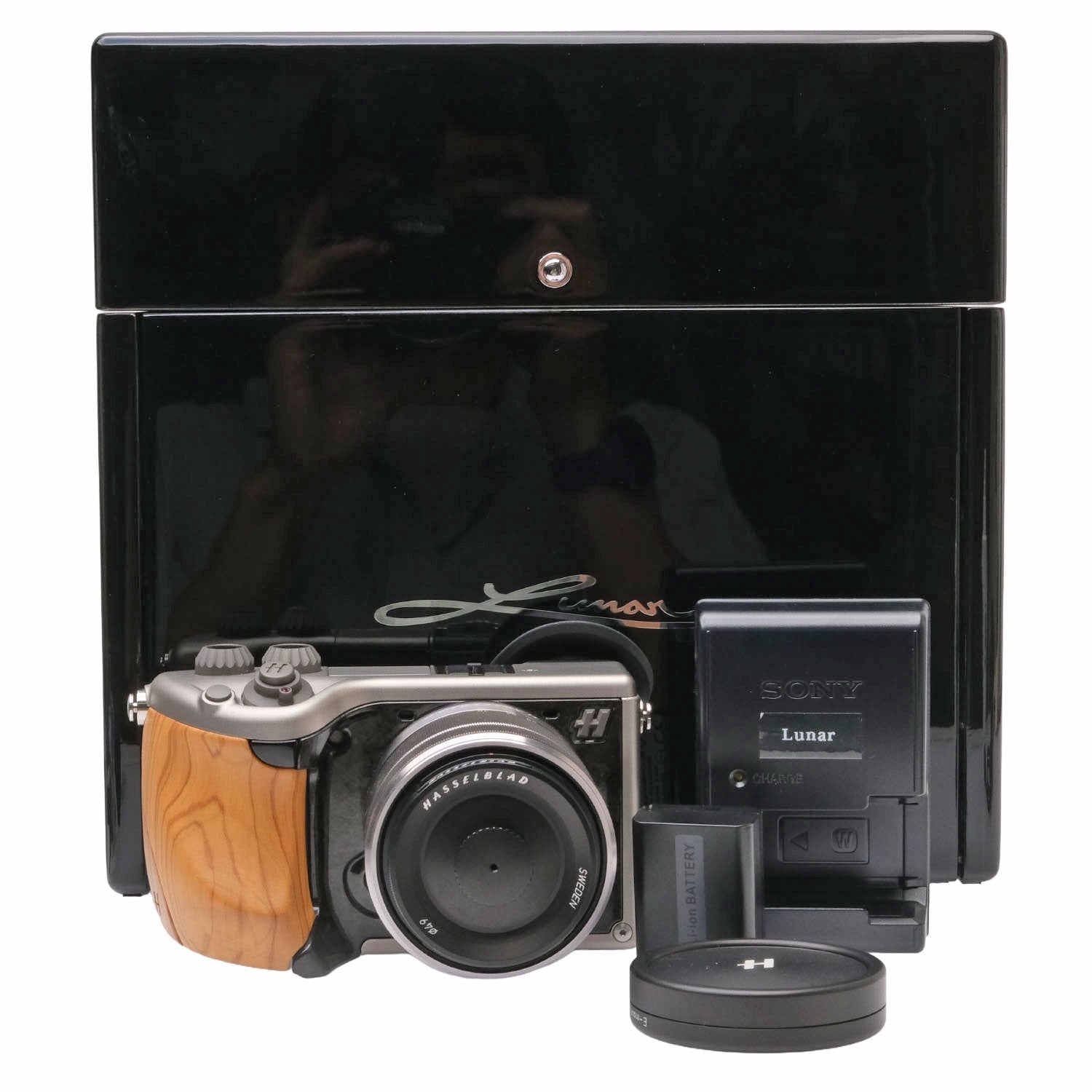 This Hasselblad Lunar (Olive), #60VP10951, is in excellent condition with only faint handling wear. I rate it cosmetically a (10-). The camera is in proper working order; the viewfinder is clear, the sensor is unmarked, and the memory card slot reads & writes. The included Hasselblad E 18-55mm f3.5-5.6 OSS Zoom Lens, #50VP10160, is in similar condition, also rated a (10-). The focus and zoom rings are smooth, the autofocus and aperture function properly, and the glass is clean and clear with no haze, marks, or fungus. There are a few faint specks of dust inside, but they do not affect image quality. This camera also includes one Sony battery, one third-party battery, a Sony battery charger, a Hasselblad Lunar neck strap, a spare Hasselblad Lunar eyecup, a Hasselblad Lunar lens hood, body cap, front & rear lens caps, hot shoe cover, an HDMI cable, a USB cable, software CD's, anti-dust bags, and the original instructions, interior presentation box, and outer box. Please refer to the photos for details.