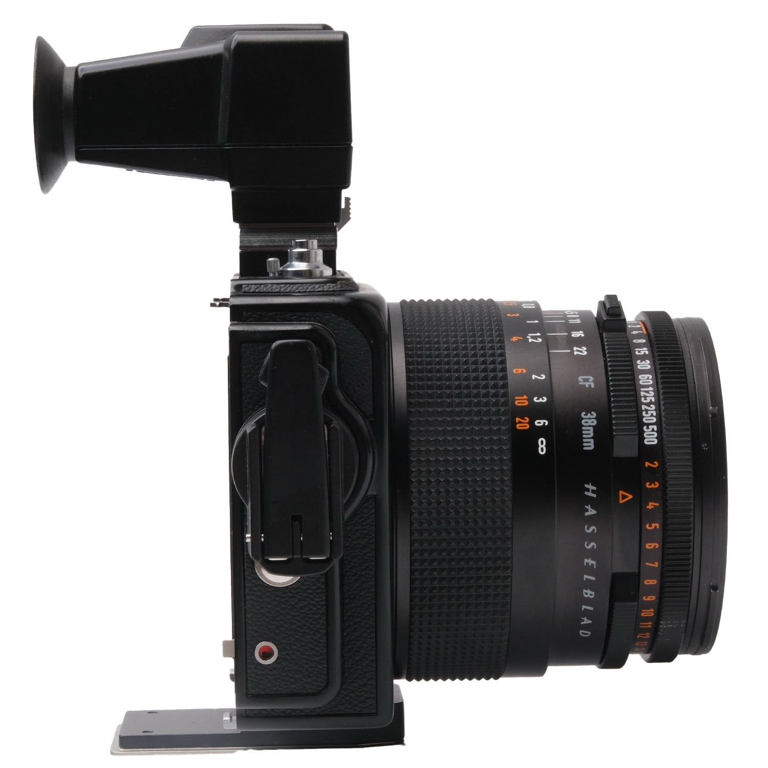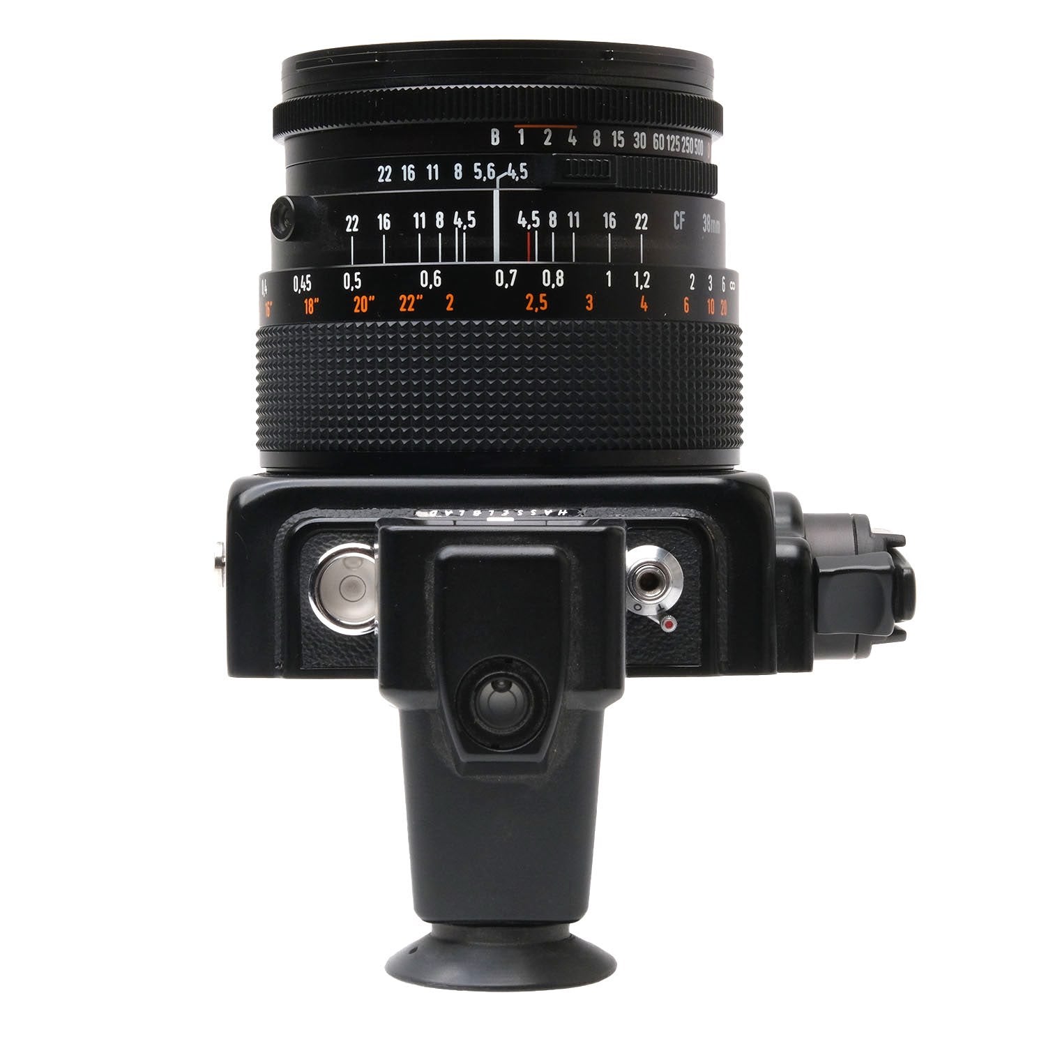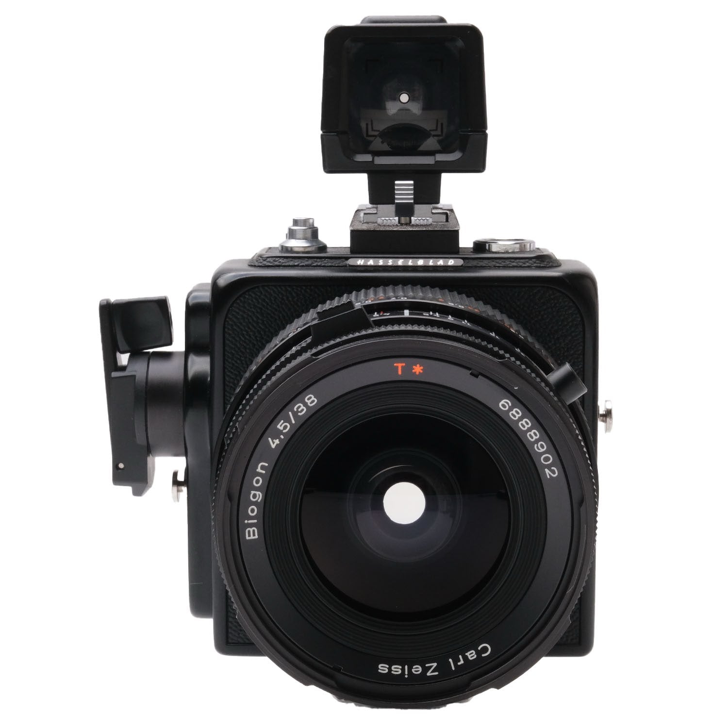 This Hasselblad SWC/M (Black), #RU148163, is in great condition with minor handling wear. I rate it cosmetically a (9+). The camera is in proper working order; the winder functions. The built-in Zeiss 38mm f4.5 Biogon lens, #6888902, is in similar condition, also rated a (9+). The aperture and shutter speed rings are smooth, but the focus ring is quite stiff. The shutter is accurate at all speeds and the aperture functions properly. The glass is clean and clear with no haze, marks, or fungus. There are a few faint specks of dust inside, but they do not affect image quality. The included viewfinder is clear. This camera also includes a front lens cap, rear cover, and the original box. Please refer to the photos for details.