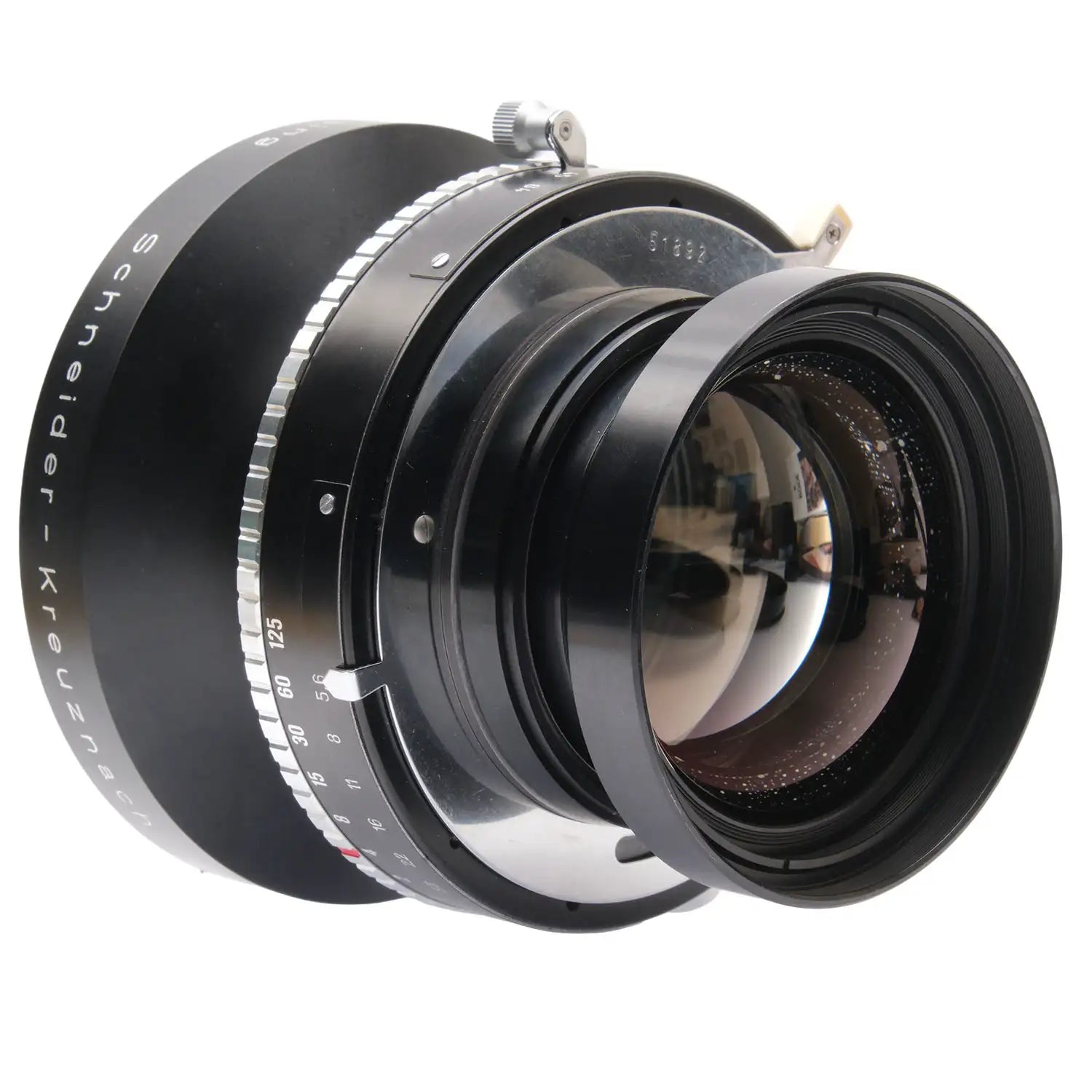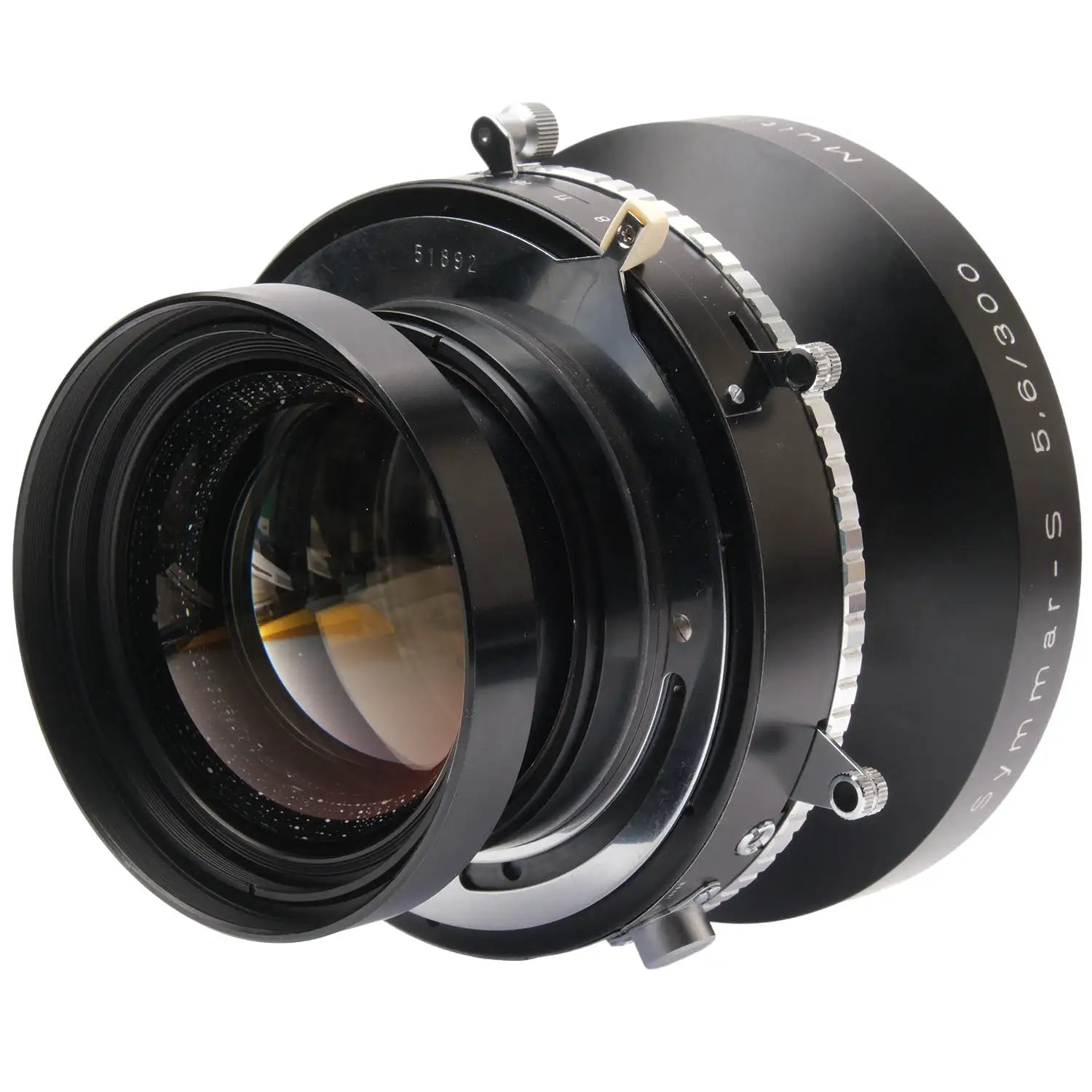 This Schneider-Kreuznach 300mm f5.6 Symmar-S MC Lens, #13421855, is in great condition with minor handling wear. I rate it cosmetically a (9+). The glass is clean and clear with no haze, marks, or fungus. There are a few faint specks of dust inside, but they do not affect image quality. It has coverage up to 10x12", a 70-degree angle of view, and a 411mm image circle at f22. The included Compur No. 3 shutter, #51892, is in similar condition, also rated a (9+). The aperture lever is smooth, but the shutter speed ring is a bit stiff. The shutter is accurate at all speeds and the aperture functions properly. This lens includes a retaining ring and front & rear caps. Please refer to the photos for details.