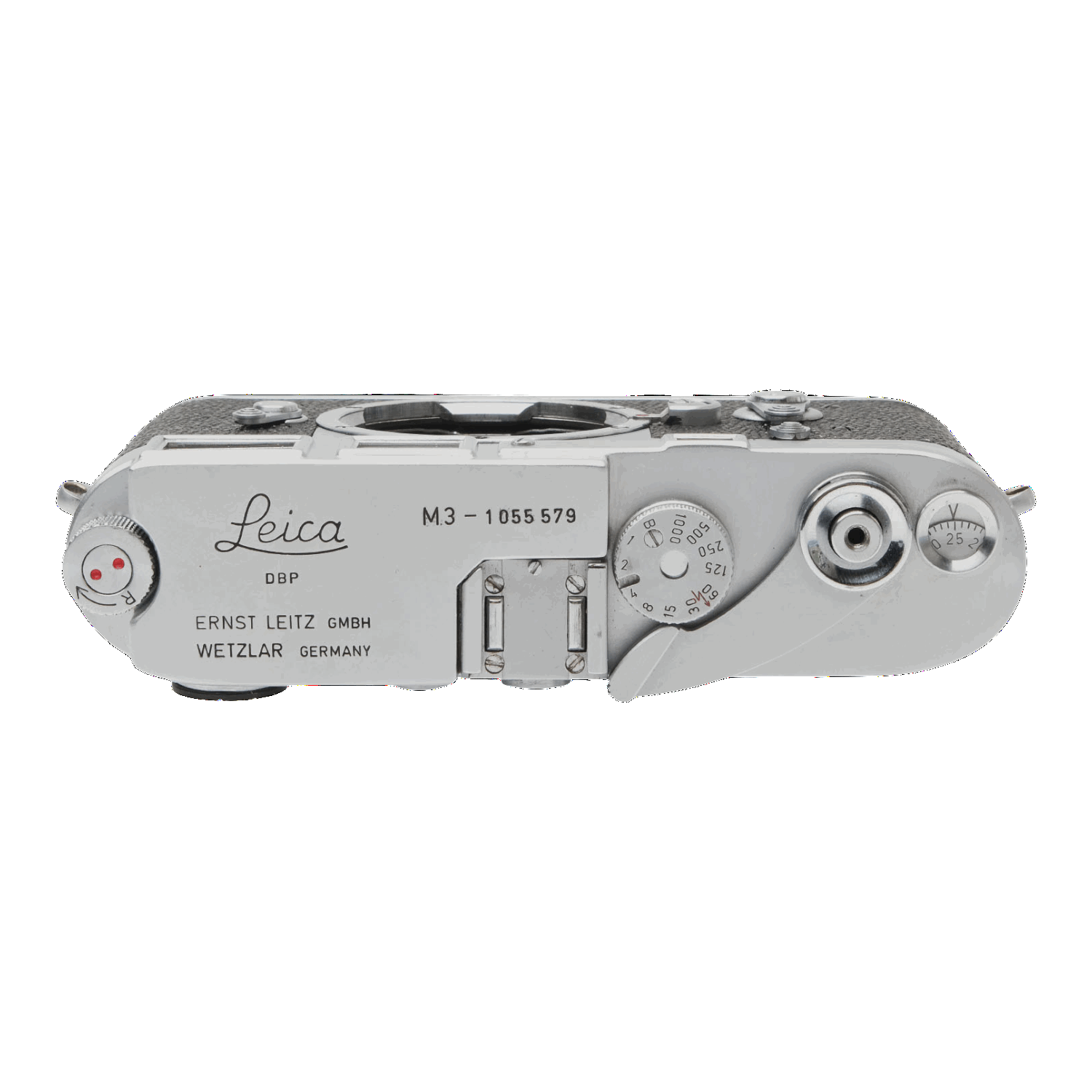 This Leica M3 SS (Silver), #1055579, is in great condition with minor handling wear. I rate it cosmetically a (9). The camera is in proper working order; film advances properly, the viewfinder is clear, the shutter is accurate at all speeds, the self-timer functions, and the rangefinder is accurate, although it is a bit dim. This camera includes a body cap. It was overhauled by DAG in 2025. Please refer to the photos for details.
