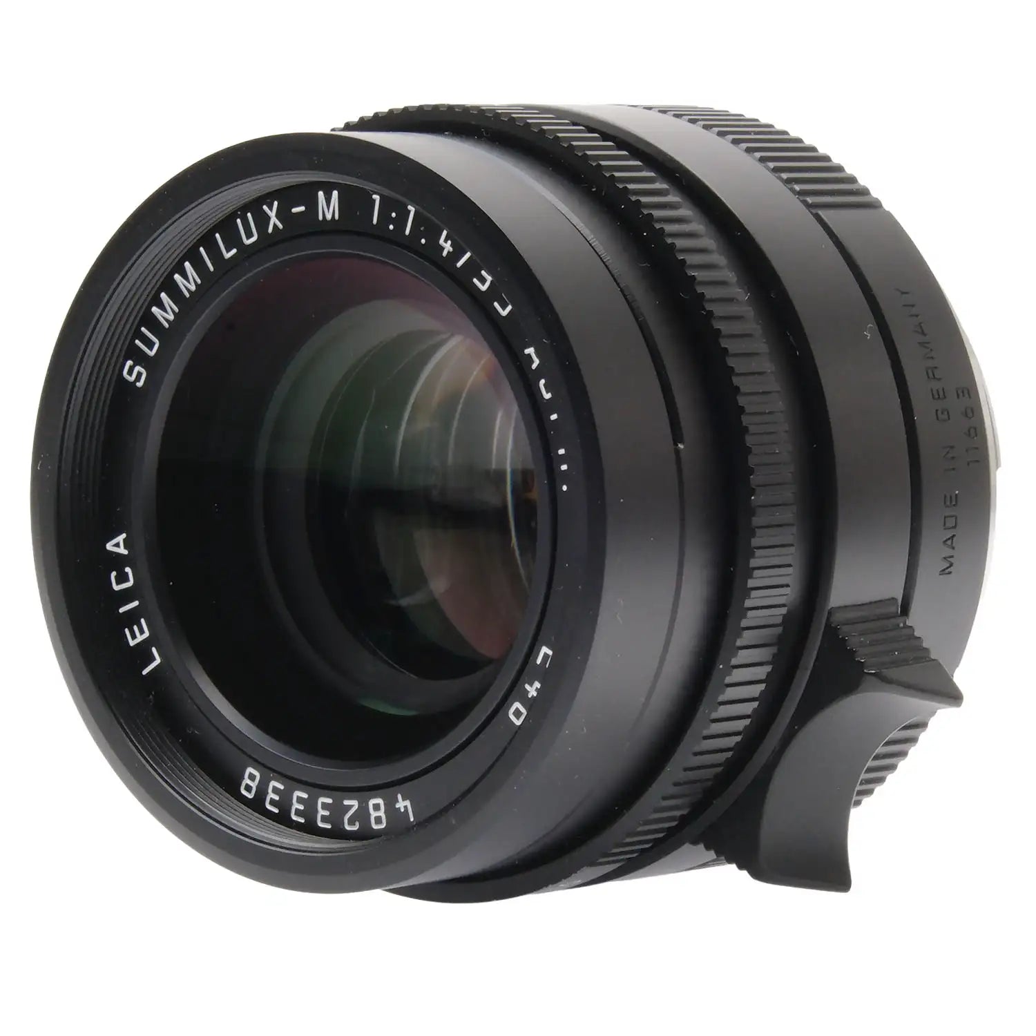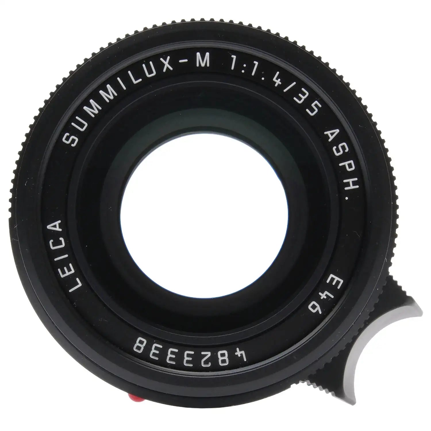 This Leica 35mm f1.4 Summilux-M Asph II Lens (Black), #4823338, is in great condition with minor handling wear. I rate it cosmetically a (9+). The aperture ring is smooth, but the focus ring is a bit stiff. The aperture functions properly and the glass is clean and clear with no haze, marks, or fungus. There are a few faint specks of dust inside, but they do not affect image quality. This lens includes a leather Leica lens case, a threaded Leica lens hood with a front cover, a threaded front ring (which must be removed to mount the lens hood), standard front & rear lens caps, and the original instructions & box. Please refer to the photos for details.