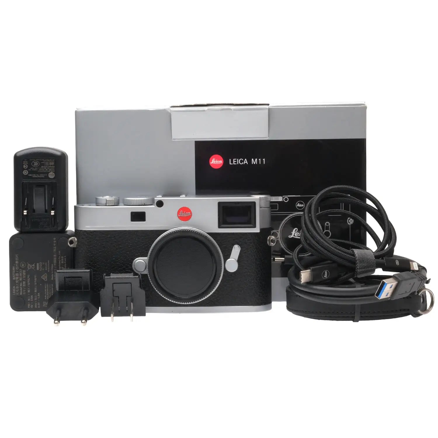 This Leica M11 (Silver), #5596992, is in great condition with minor handling wear. I rate it cosmetically a (9+). The camera is in proper working order; the sensor is unmarked, the viewfinder is clear, the memory card slot reads & writes, and the rangefinder is bright & accurate. This camera includes a Leica battery, battery charger, AC adaptor, a set of plug adapters, a USB-A to USB-C cable, a USB-C to Apple Lightning cable, neck strap, body cap, hot shoe cover, and the original instructions & box. Please refer to the photos for details.