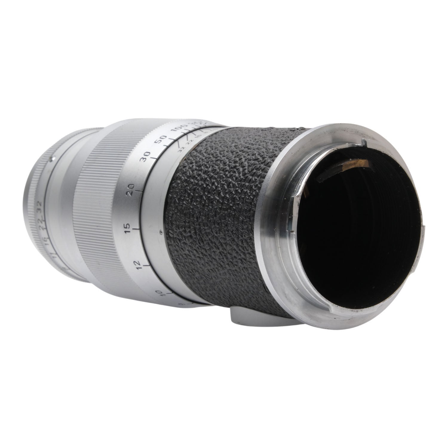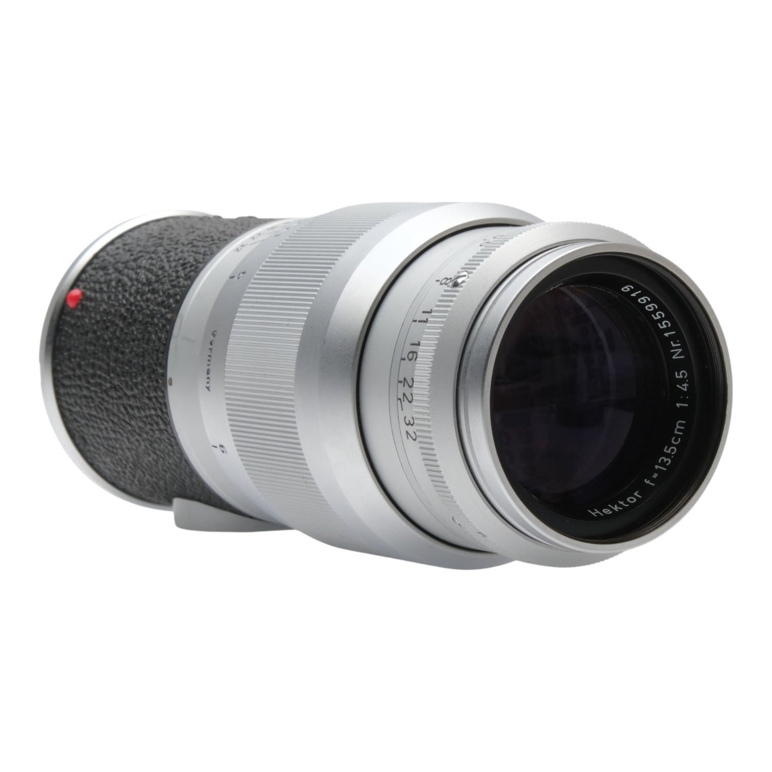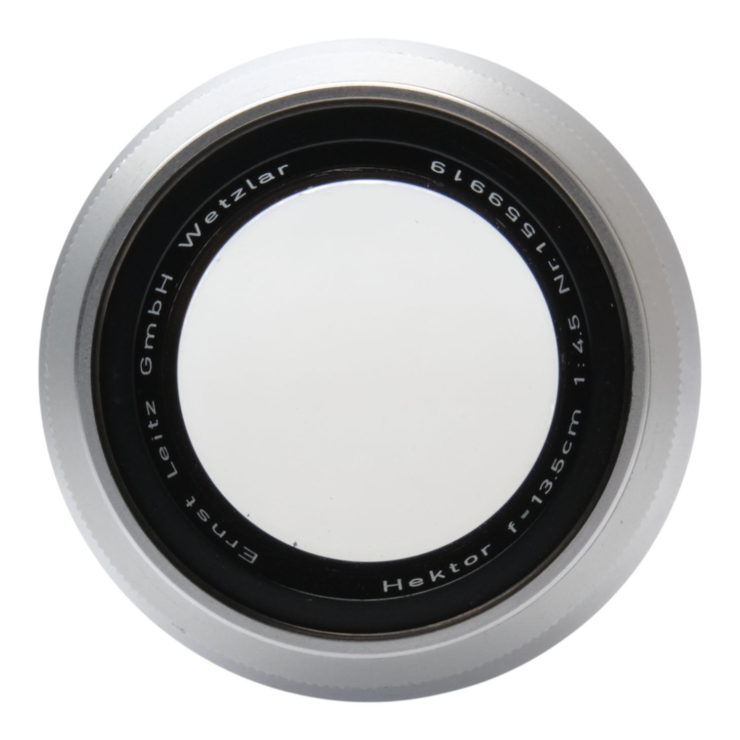 This Leica 13.5cm f4.5 Hektor M Lens (Silver), #1559919, is in good condition with some handling wear. I rate it cosmetically an (8+). The aperture ring is smooth, the aperture functions properly, and the glass has no marks or fungus, but there's some haze and dust inside. The focusing helicoid is smooth. This lens includes front & rear caps. Please refer to the photos for details.