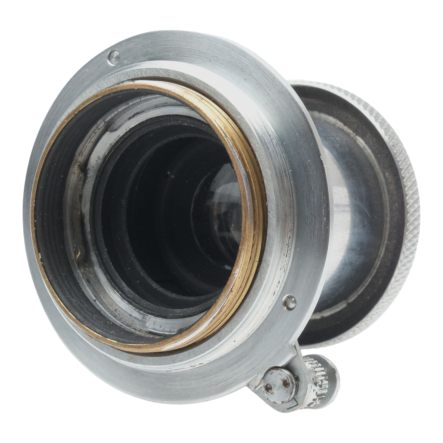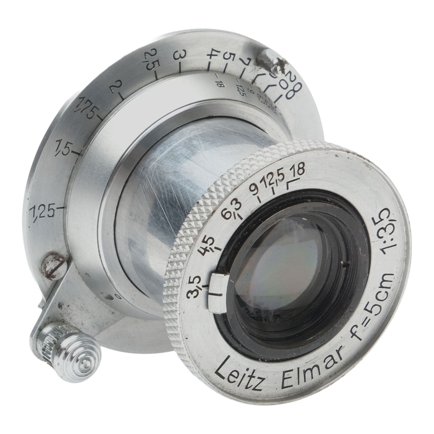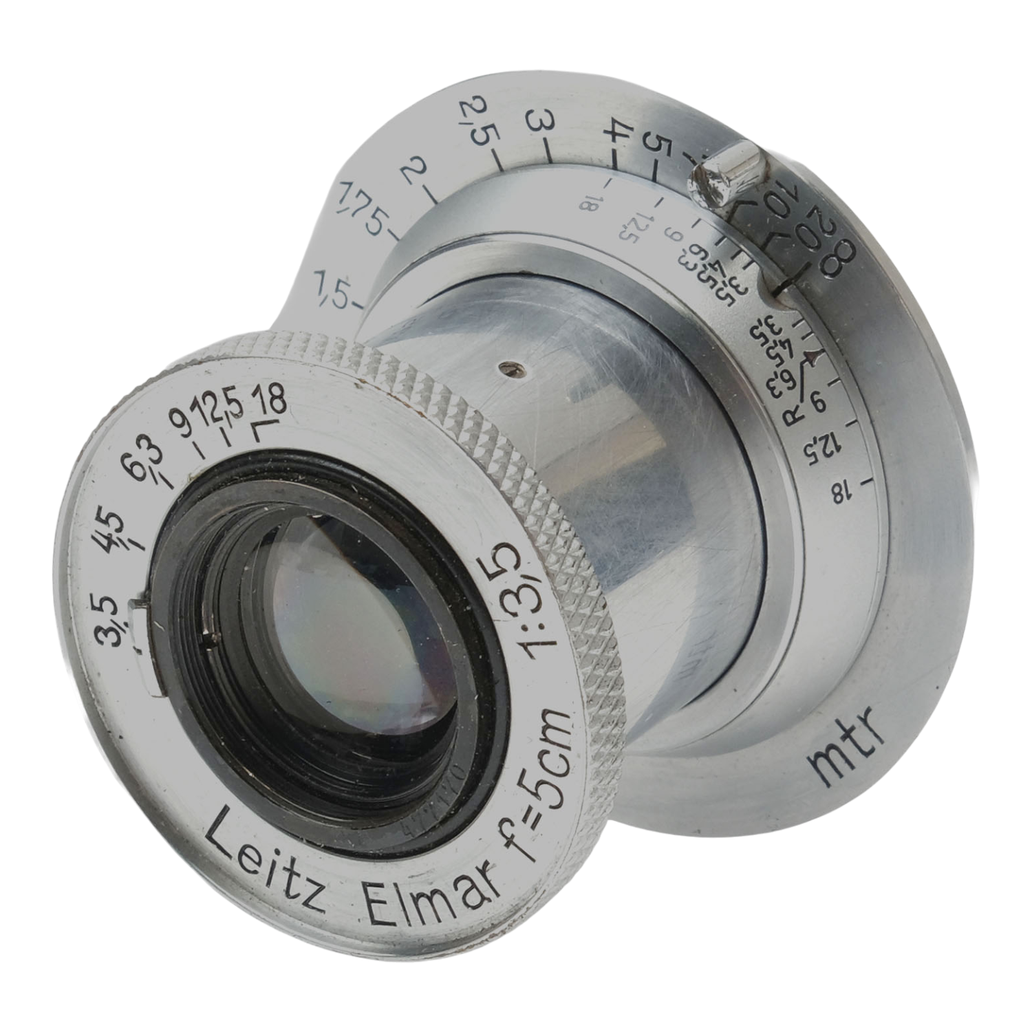 This Leica 5cm f3.5 Elmar Lens (Silver), #477170, is in good condition with some handling wear. I rate it cosmetically an (8+). The lens extends and retracts properly. The aperture tab is a bit stiff and the focus ring is quite stiff, but the aperture functions properly and the glass is clean and clear with no haze, marks, or fungus. There are a few faint specks of dust inside, but they do not affect image quality. This lens includes a rear cap, but no front cap. It is for Leica screw mount/thread mount (LTM) and other E39 bodies. Please refer to the photos for details.