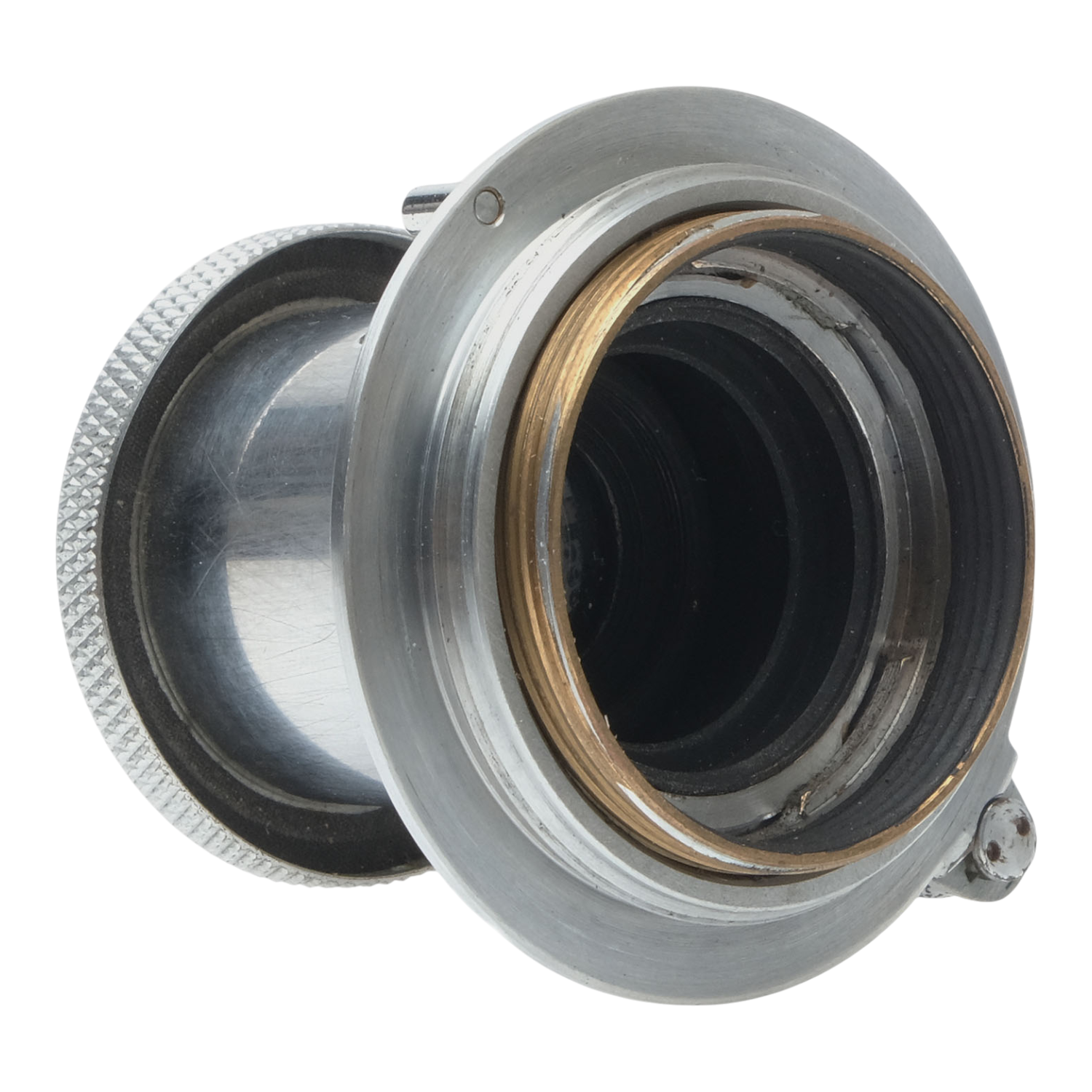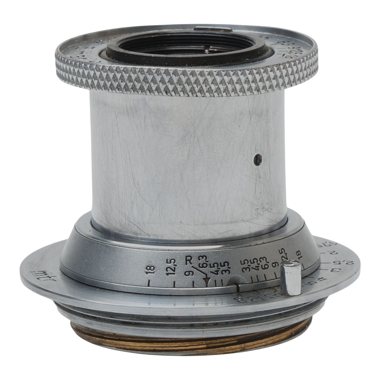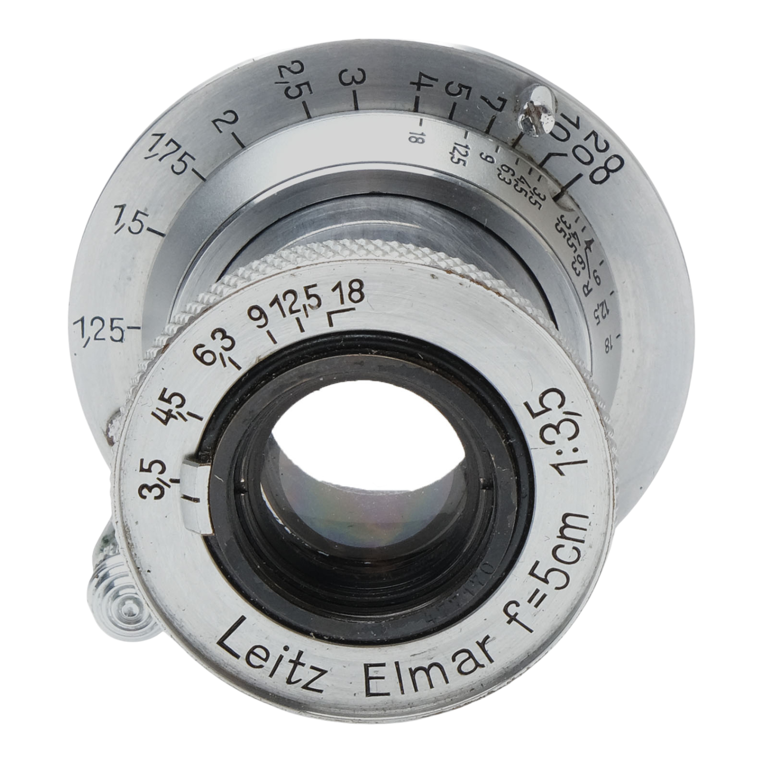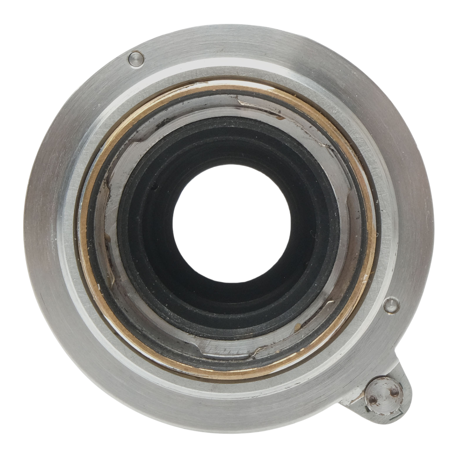 This Leica 5cm f3.5 Elmar Lens (Silver), #477170, is in good condition with some handling wear. I rate it cosmetically an (8+). The lens extends and retracts properly. The aperture tab is a bit stiff and the focus ring is quite stiff, but the aperture functions properly and the glass is clean and clear with no haze, marks, or fungus. There are a few faint specks of dust inside, but they do not affect image quality. This lens includes a rear cap, but no front cap. It is for Leica screw mount/thread mount (LTM) and other E39 bodies. Please refer to the photos for details.