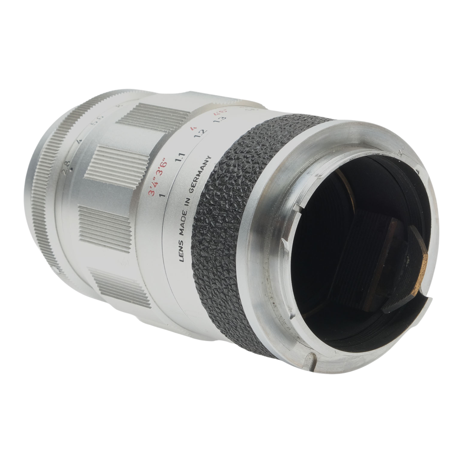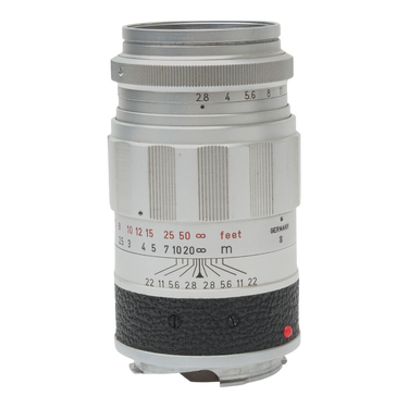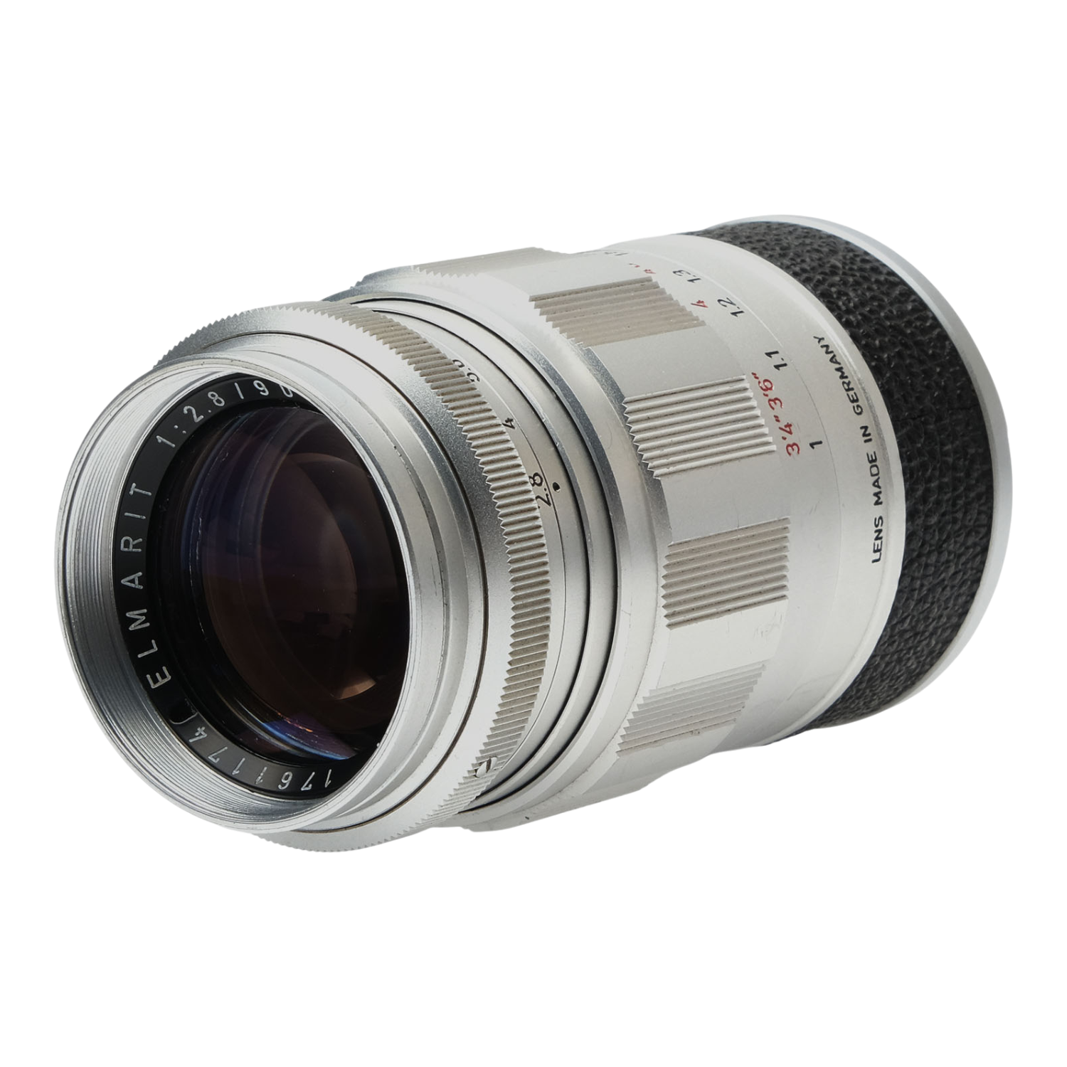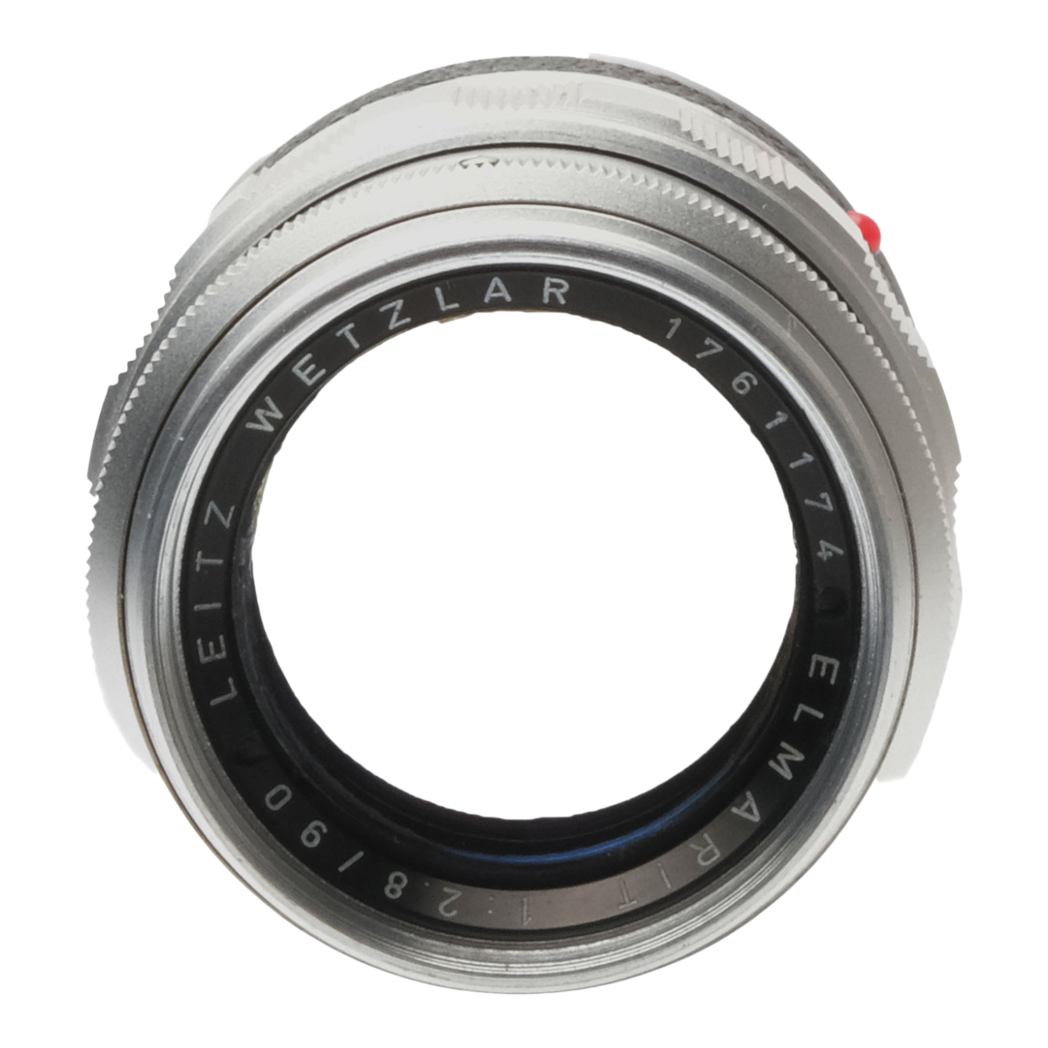 This Leica 90mm f2.8 Elmarit M Lens (Silver), #1761174, is in great condition with minor handling wear. I rate it cosmetically a (9). The aperture ring is smooth, the aperture functions properly, and the glass is clean and clear with no haze, marks, or fungus. There are a few faint specks of dust inside, but they do not affect image quality. The focusing helicoid is a bit stiff. This lens includes a Leica UVa filter and a rear lens cap, but no front cap. Please refer to the photos for details.