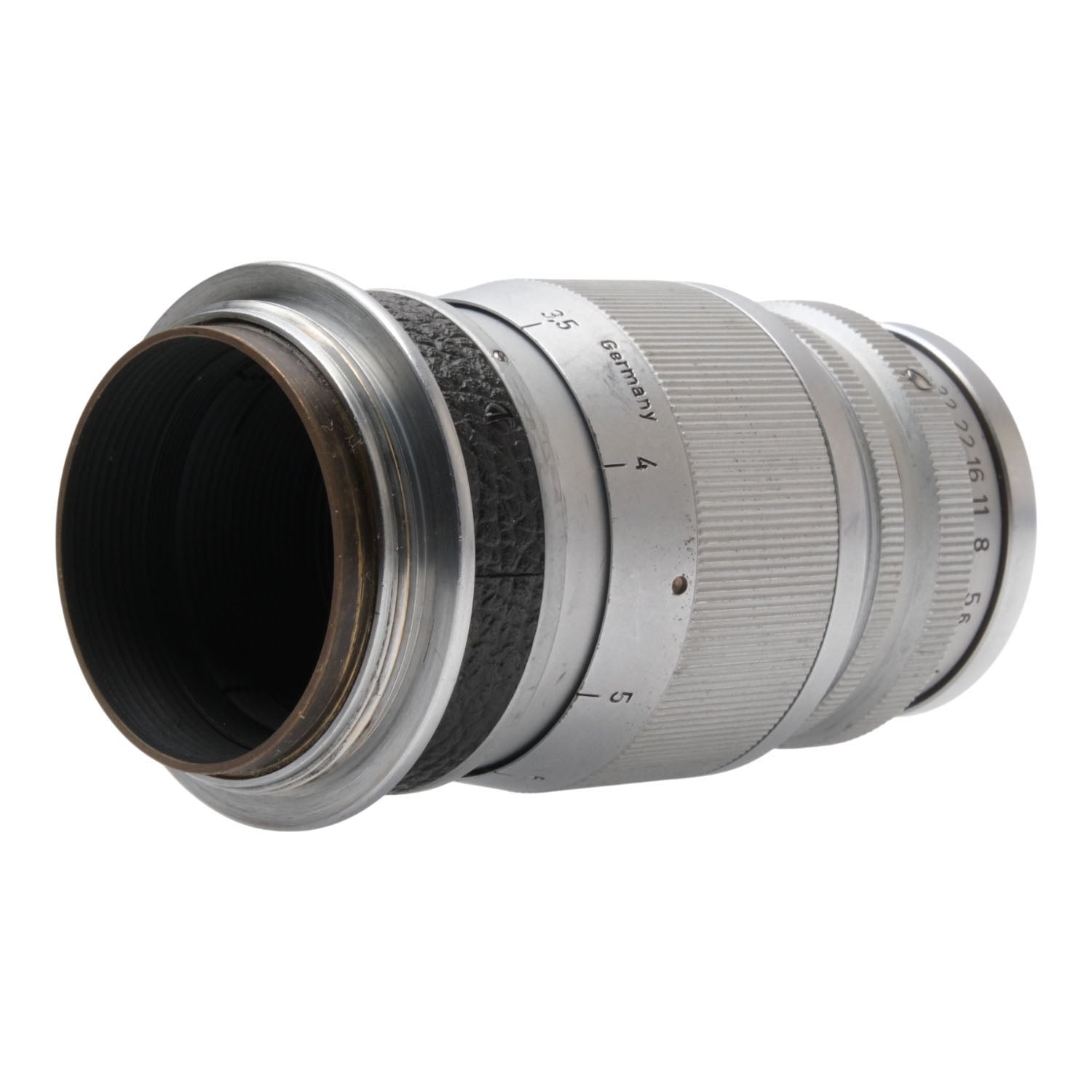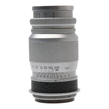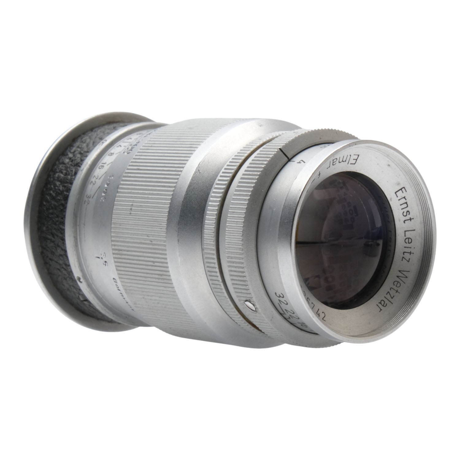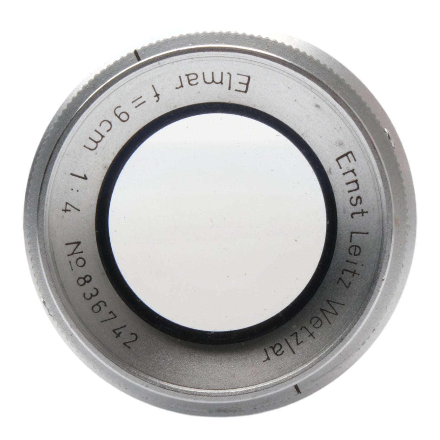 This Leica 9cm f4 Elmar Lens (Silver), #836742, is in good condition with some handling wear. I rate it cosmetically an (8). The aperture ring is a bit loose, but the aperture functions properly. The glass is clean and clear with no haze, marks, or fungus. There are a few faint specks of dust inside, but they do not affect image quality. The focusing helicoid is a bit stiff. This lens is for Leica screw mount/thread mount (LTM) and other E39 bodies. It includes front & rear caps. Please refer to the photos for details.