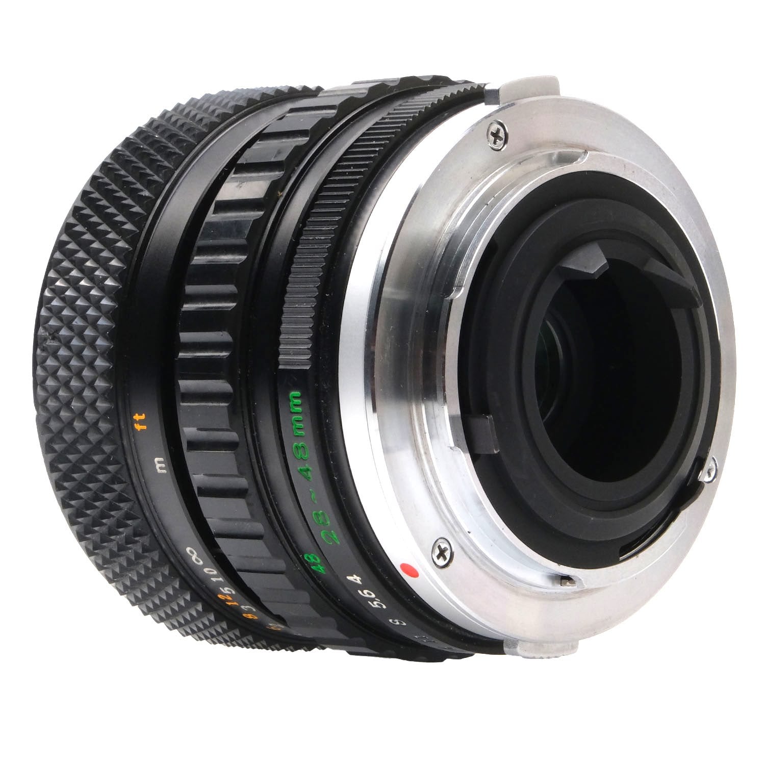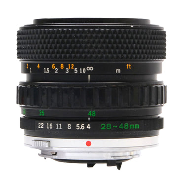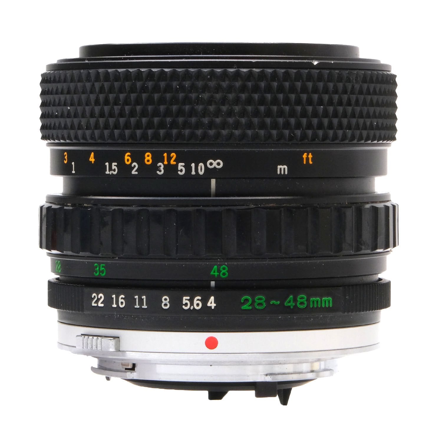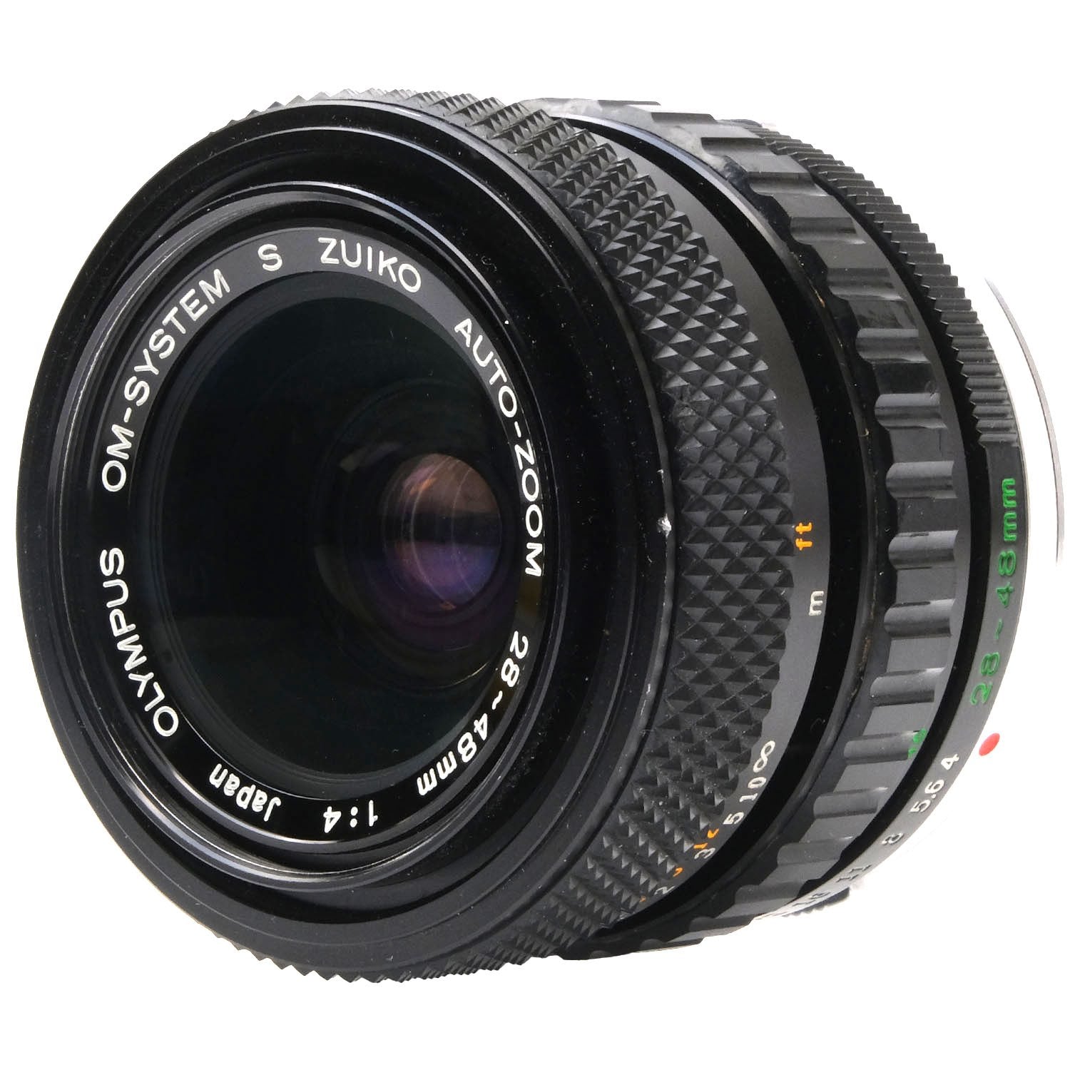 This Olympus OM 28-48mm f4 S Zuiko Auto-Zoom Lens, #107127, is in great condition with minor handling wear. I rate it cosmetically a (9+). The aperture and zoom rings are smooth, but the focus ring is a bit stiff. The aperture functions properly and the glass is clean and clear with no haze, marks, or fungus. There are a few faint specks of dust inside, but they do not affect image quality. This lens includes front & rear caps. Please refer to the photos for details.