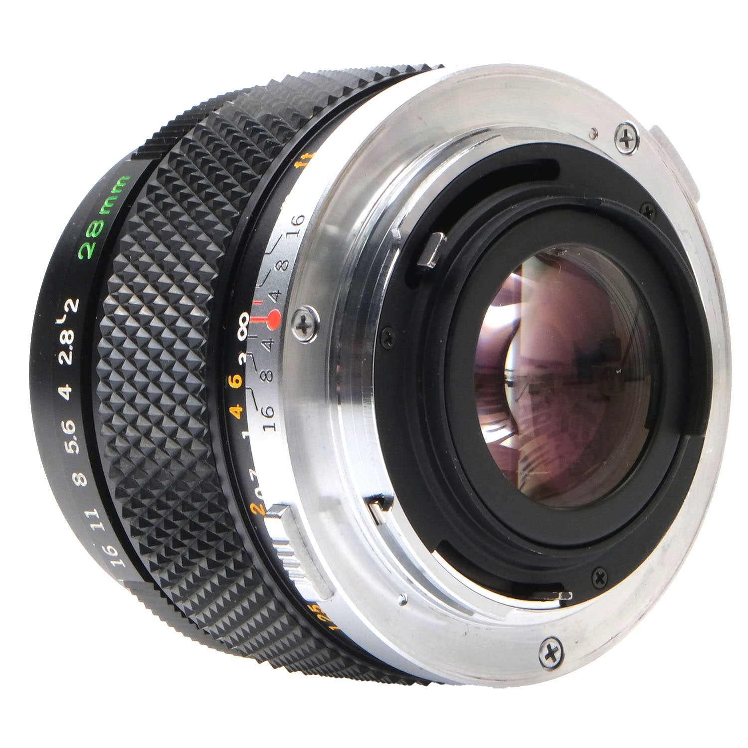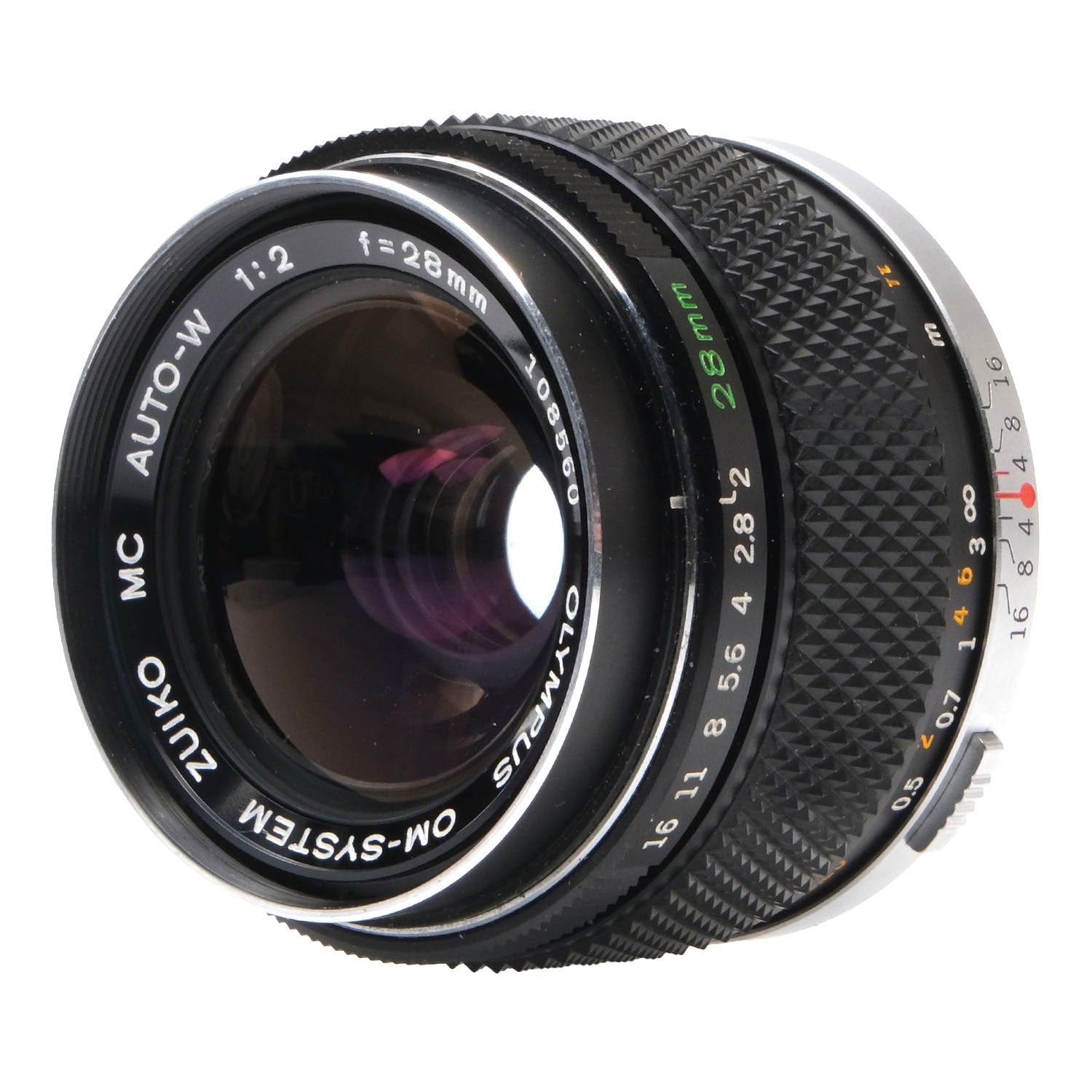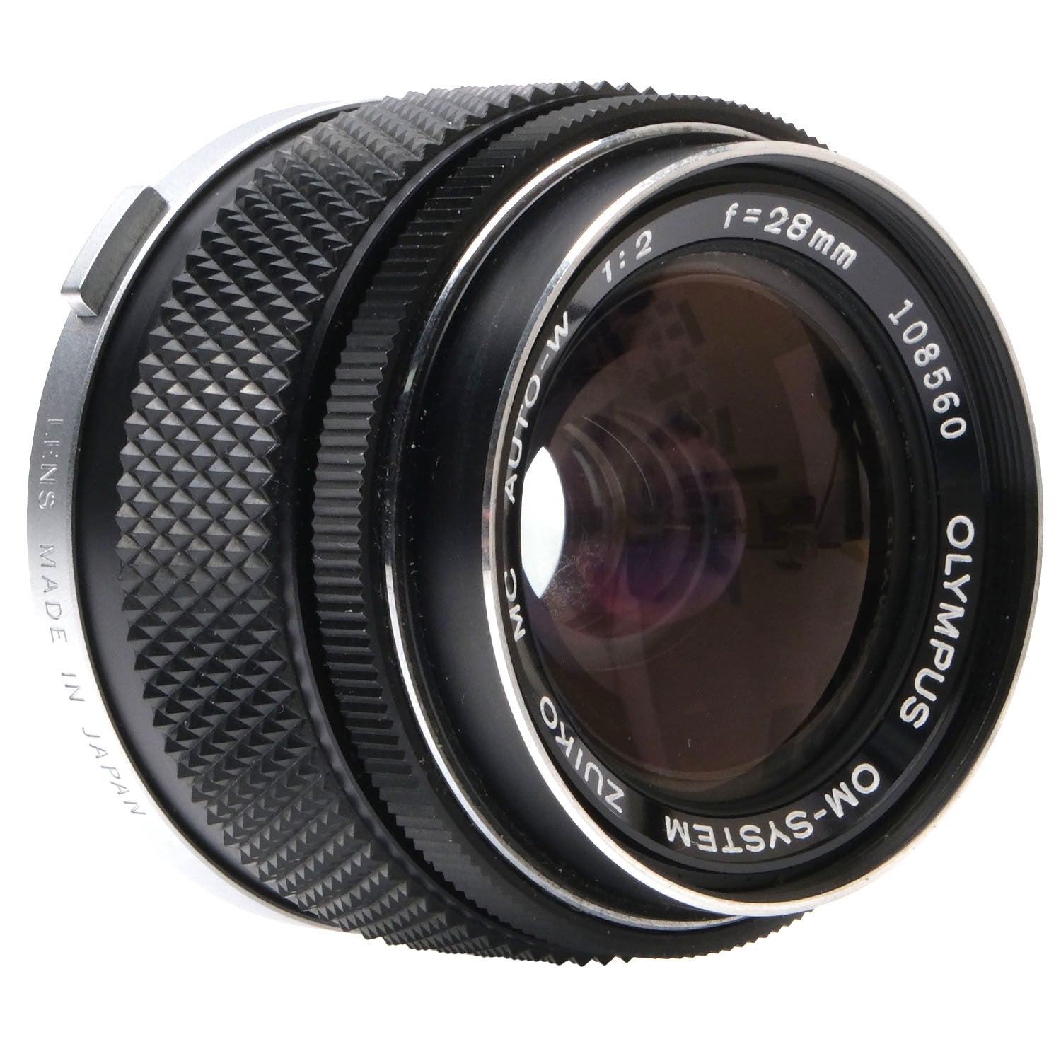 This Olympus OM 28mm f2 Zuiko MC Auto-W Lens, #108560, is in great condition with minor handling wear. I rate it cosmetically a (9+). The aperture ring is smooth, but the focus ring is quite stiff. The aperture functions properly and the glass is clean and clear with no haze, marks, or fungus. There are a few faint specks of dust inside, but they do not affect image quality. This lens includes front & rear caps. Please refer to the photos for details.
