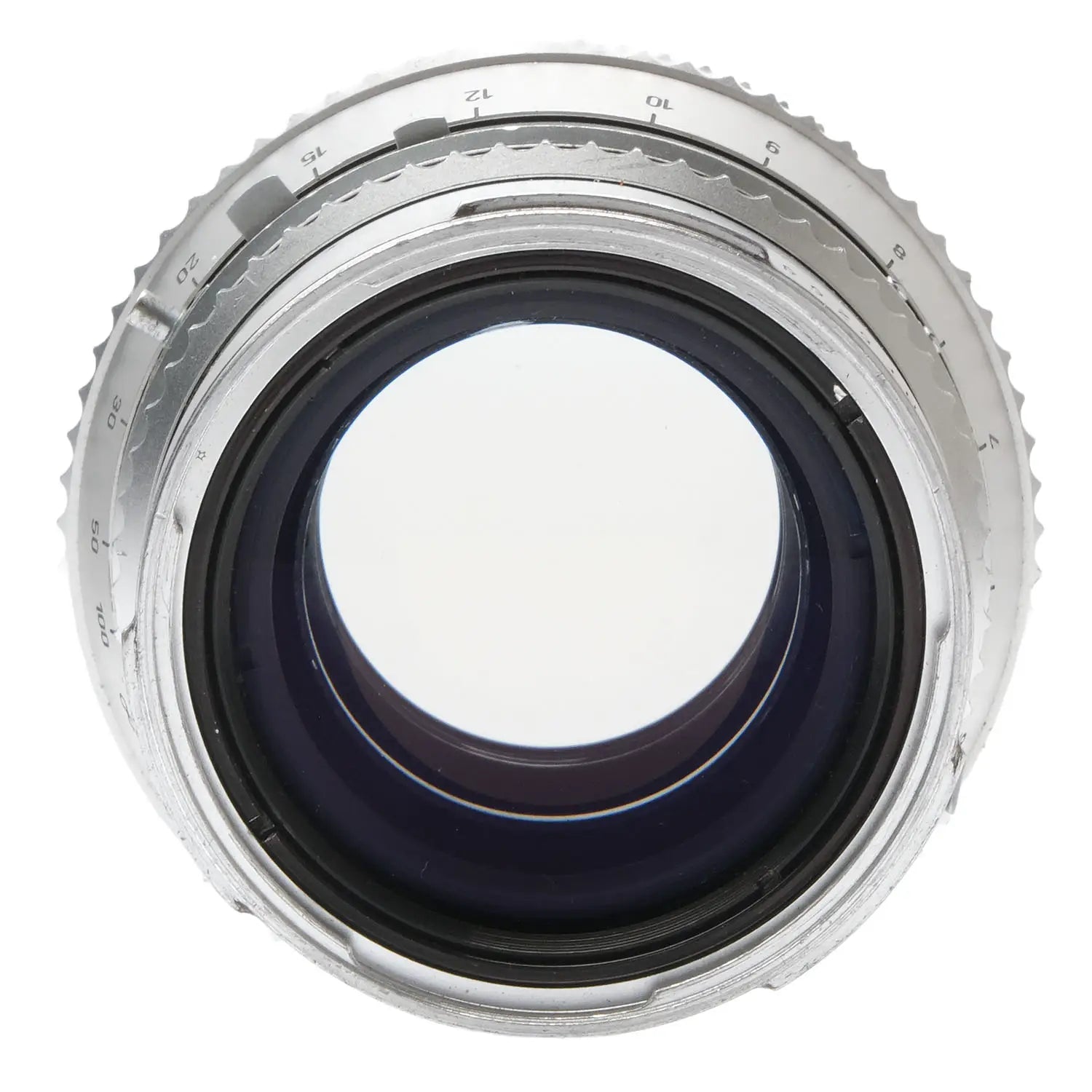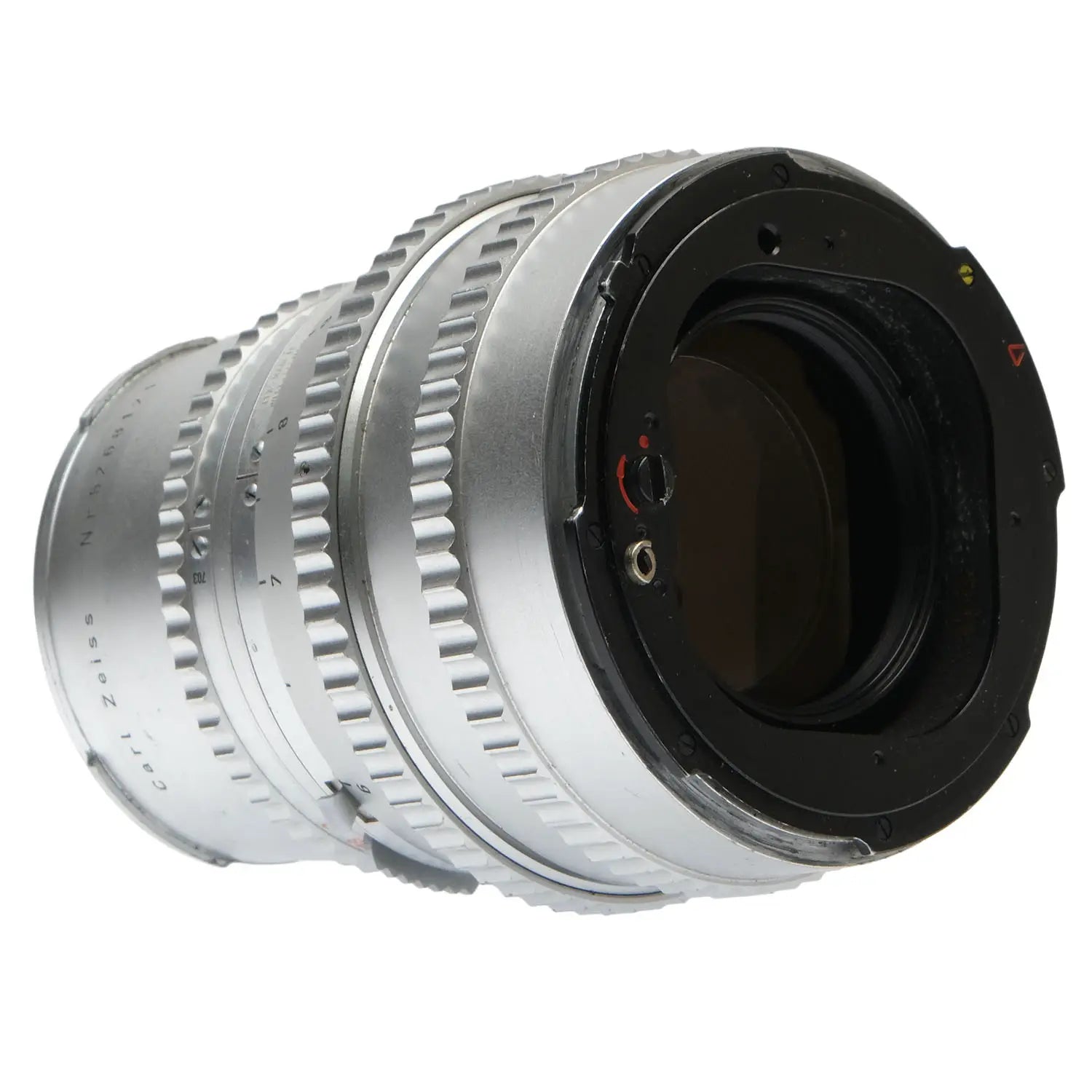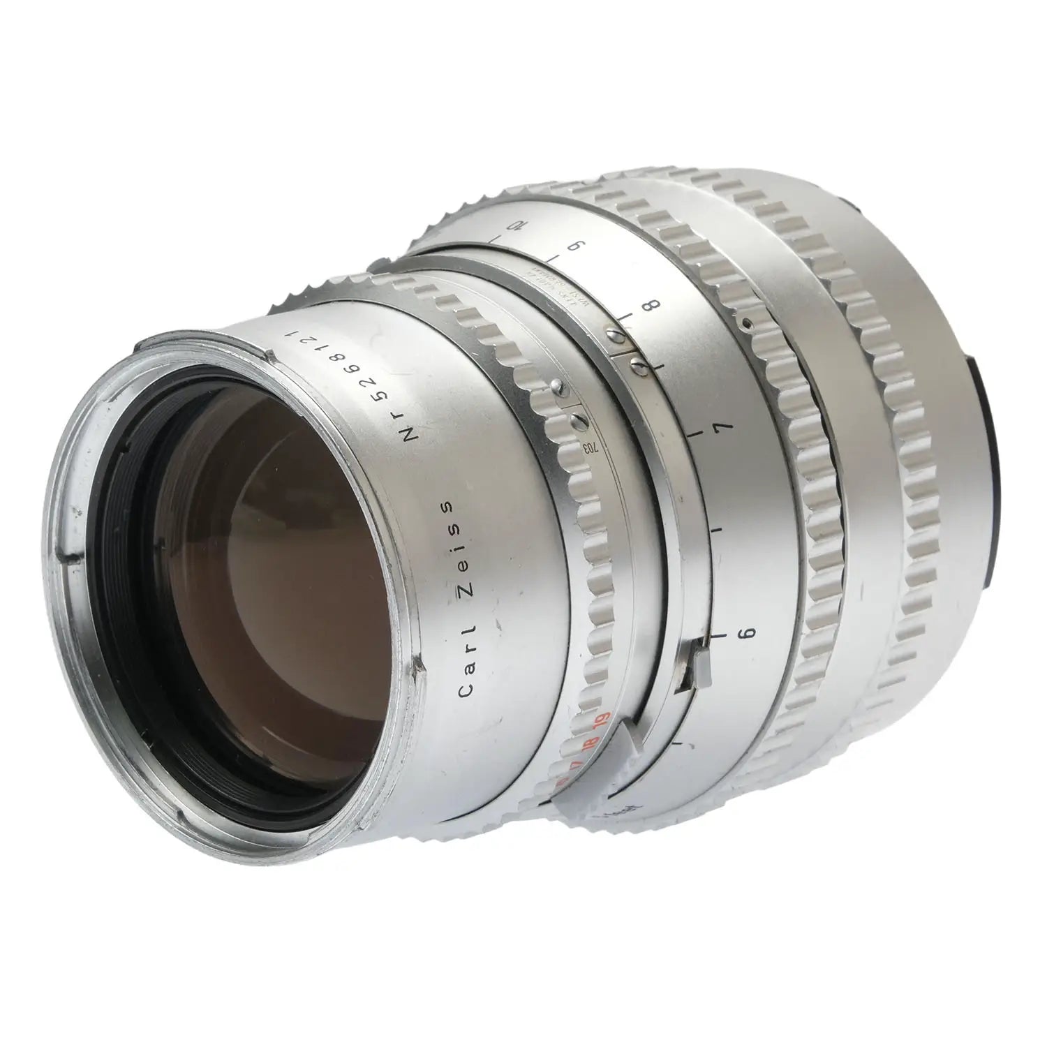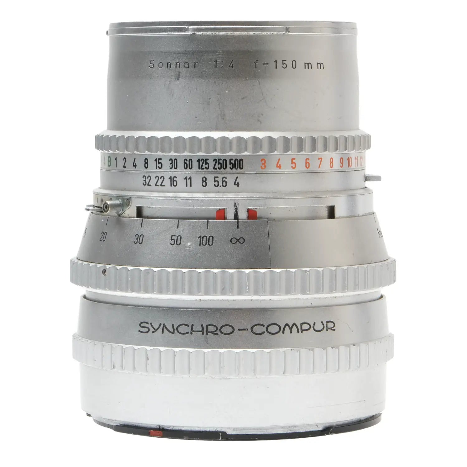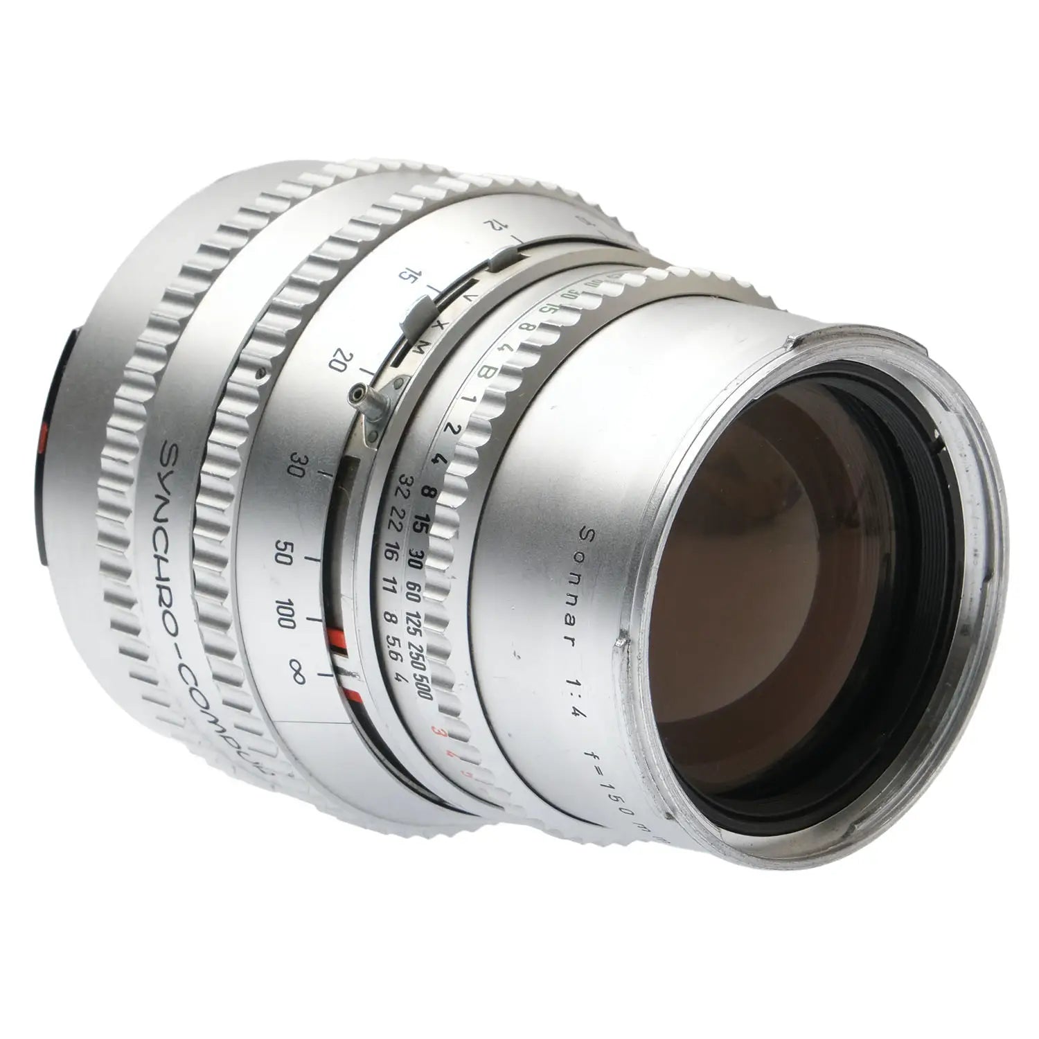 This Hasselblad C 150mm f4 Sonnar Lens (Silver), #5268121, is in good condition with some handling wear. I rate it cosmetically an (8). The focus, aperture, and shutter speed rings are smooth, the aperture functions properly, and the shutter is accurate at all speeds. The glass is clean and clear with no haze, marks, or fungus. There are a few faint specks of dust inside, but they do not affect image quality. This lens includes front & rear caps. Please refer to the photos for details.