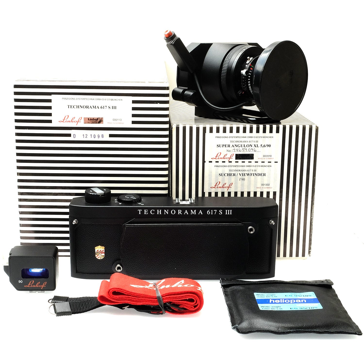 This Linhof 617s III, #D121098, is in great condition with minor handling wear. I rate it cosmetically a (9+). The camera is in proper working order; film advances properly. The included Schneider-Kreuznach 90mm f5.6 Super-Angulon XL Lens, #14659096, is in similar condition, also rated a (9+). The focus ring is a bit stiff. The shutter wheel and aperture lever are smooth, the shutter is accurate at all speeds, and the glass is clean and clear with no haze, marks, or fungus. There are a few faint specks of dust inside, but they do not affect image quality. The included Linhof 90mm viewfinder is clear and the framelines are bright. This listing also includes a Heliopan Center ND filter, front & rear lens caps, neck strap, body cap, the original box for the lens, and the original instructions & box for the body. Please refer to the photos for details.