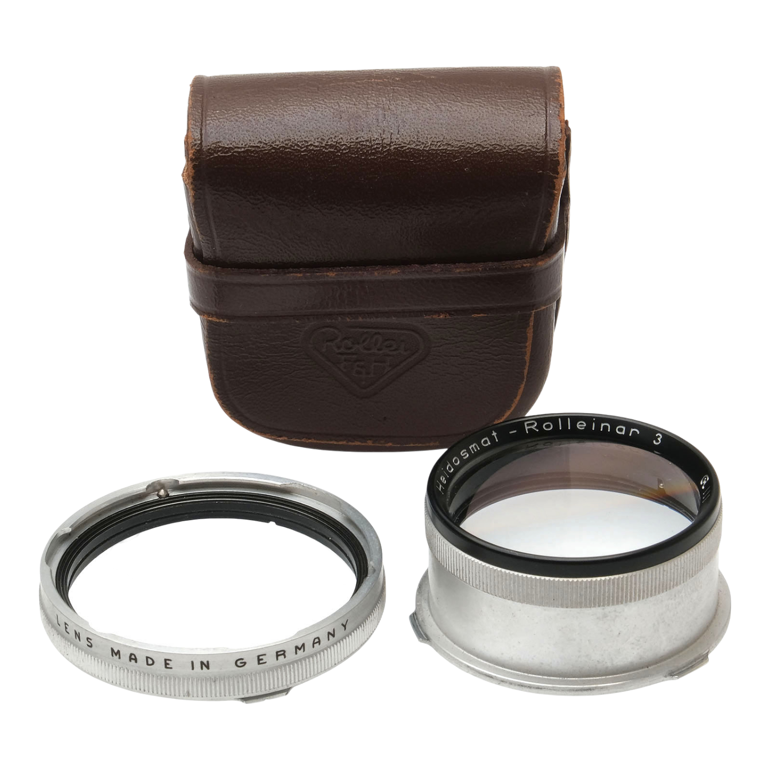 This Rollei RIII Rolleinar 3 is in great condiiton with minor handling wear. I rate it cosmetically a (9+). The Rolleinar is in proper working order; the glass is clear. It includes a leather Rollei case. Please refer to the photos for details.