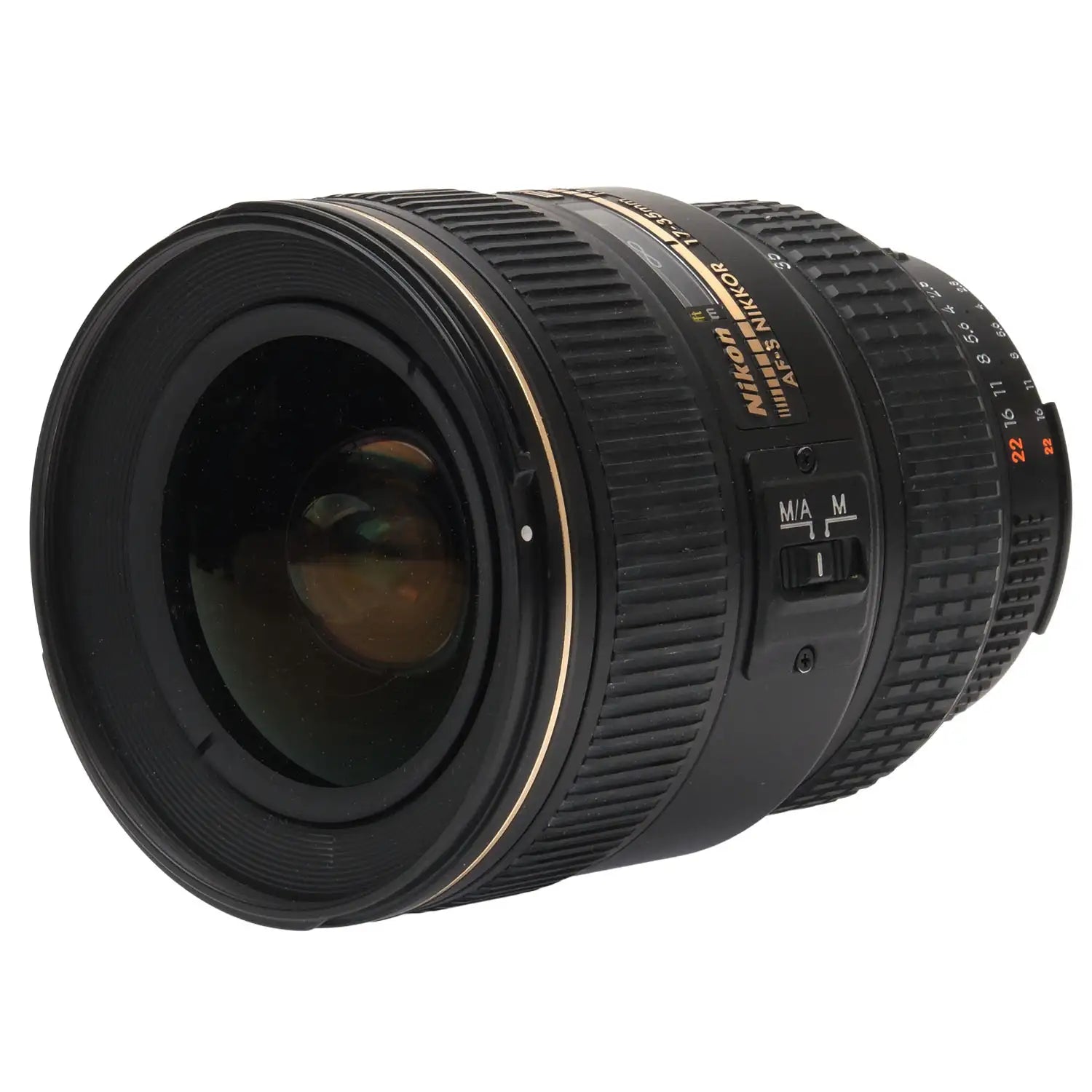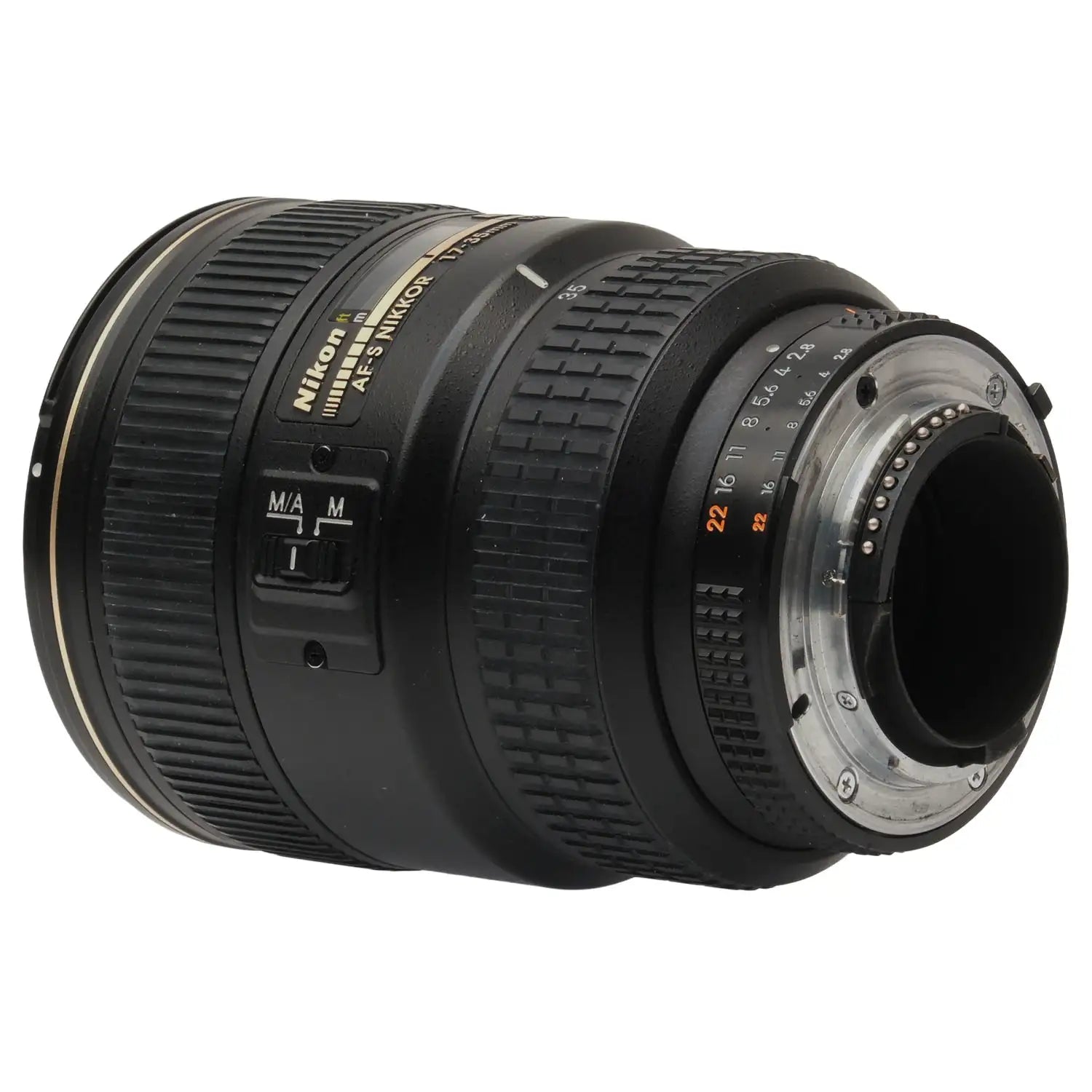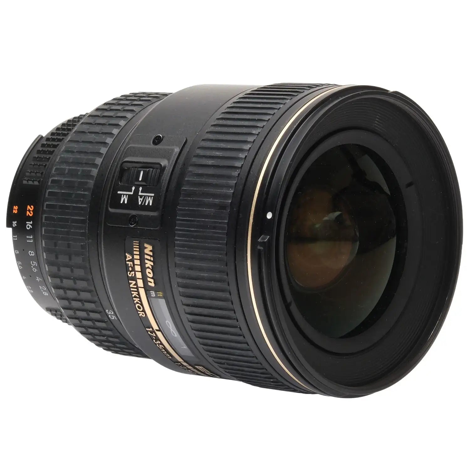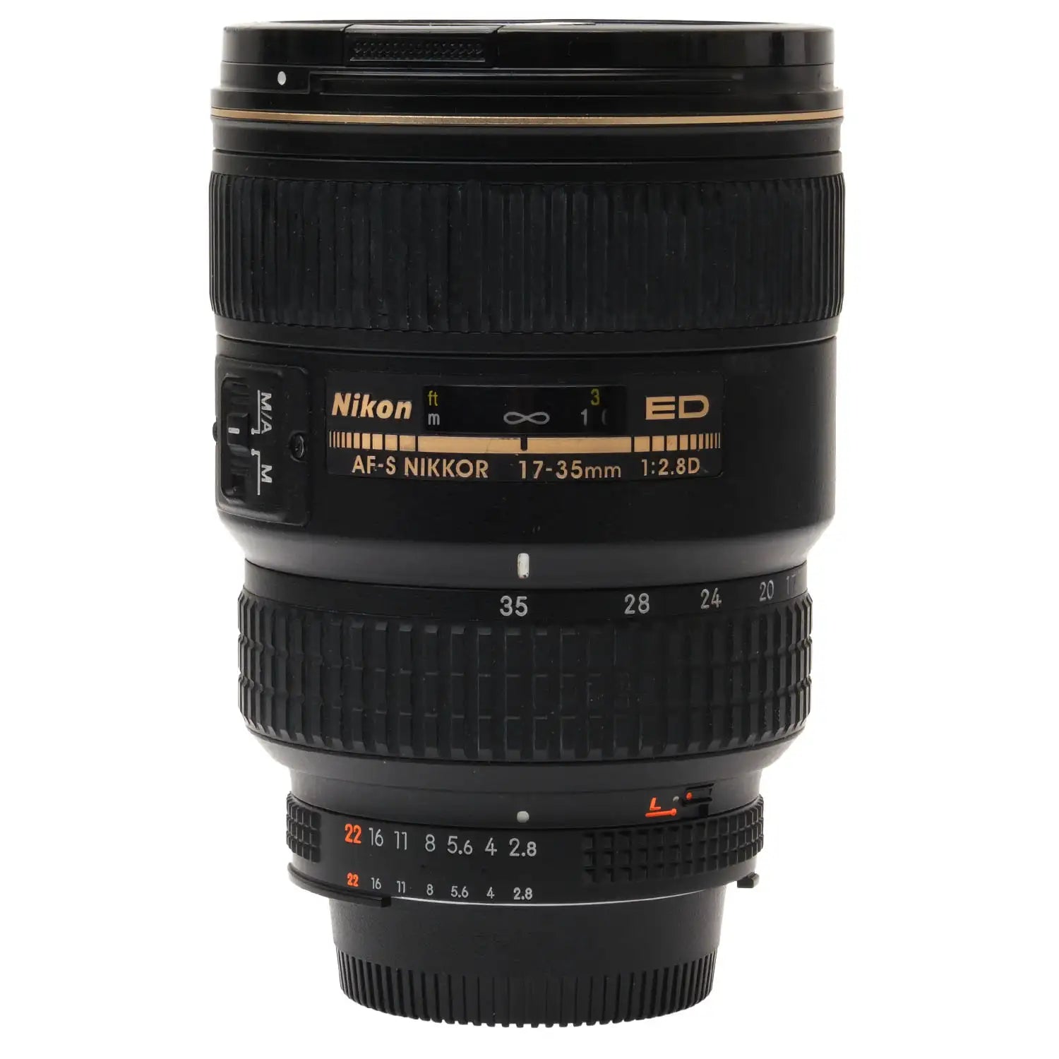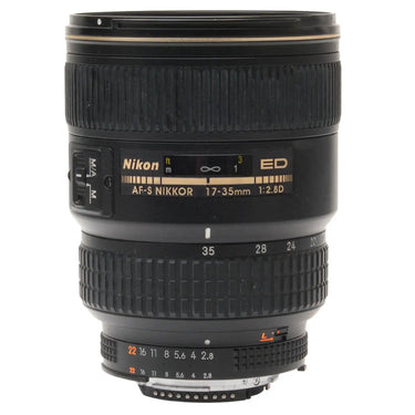 This Nikon AF-S 17-35mm f2.8 D ED Nikkor Zoom Lens, #US267321, is in great condition with minor handling wear. I rate it cosmetically a (9). The focus ring is a bit rough, the zoom ring is a bit loose, and the aperture ring is a bit jerky. The autofocus and aperture function properly, but the autofocus squeaks. The glass is clean and clear with no haze, marks, or fungus. There are a few faint specks of dust inside, but they do not affect image quality. This lens includes a Nikon lens hood and front & rear caps. Please refer to the photos for details.