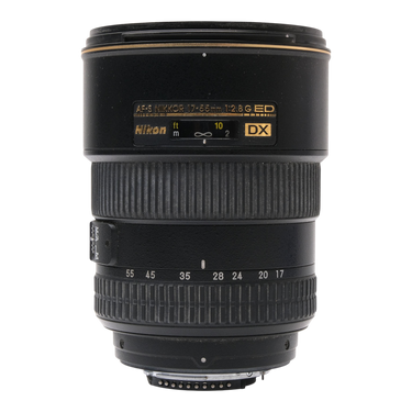 This Nikon AF-S 17-55mm f2.8 G ED DX Nikkor Zoom Lens, #US247208, is in good condition with some handling wear. I rate it cosmetically an (8+). The focus ring squeaks a bit and the zoom ring is quite stiff, but the autofocus and aperture function properly and the glass is clean and clear with no haze, marks, or fungus. There are a few faint specks of dust inside, but they do not affect image quality. This lens includes a Nikon lens hood and front & rear caps. Please refer to the photos for details.