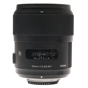This Sigma 35mm f1.4 DG Art Lens for Nikon F, #52264758, is in great condition with some handling wear. I rate it cosmetically an (8+). The focus ring is a bit stiff, but the autofocus and aperture function properly and the glass is clean and clear with no haze, marks, or fungus. There are a few faint specks of dust inside, but they do not affect image quality. This lens includes front & rear caps. Please refer to the photos for details.