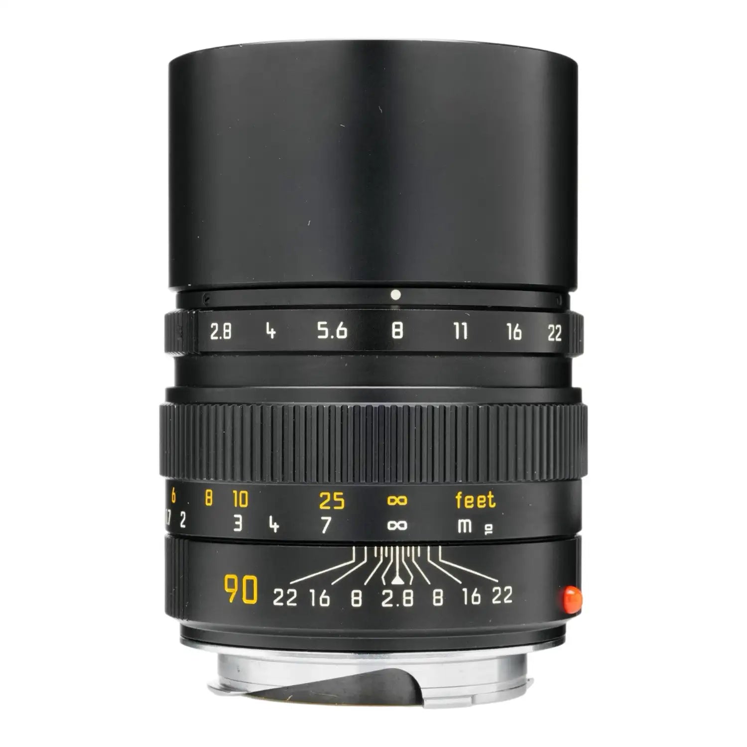 This Leica 90mm f2.8 Elmarit-M Lens, #3769927, is in excellent condition. I rate it cosmetically at a (9+) condition. The focus is smooth, and the aperture works well. The glass is clean and clear with no haze, marks, or fungus. The built-in hood is in good shape and slides into place with ease. This lens takes E46 Filters, comes with the original box, leather case, both caps, and paperwork.