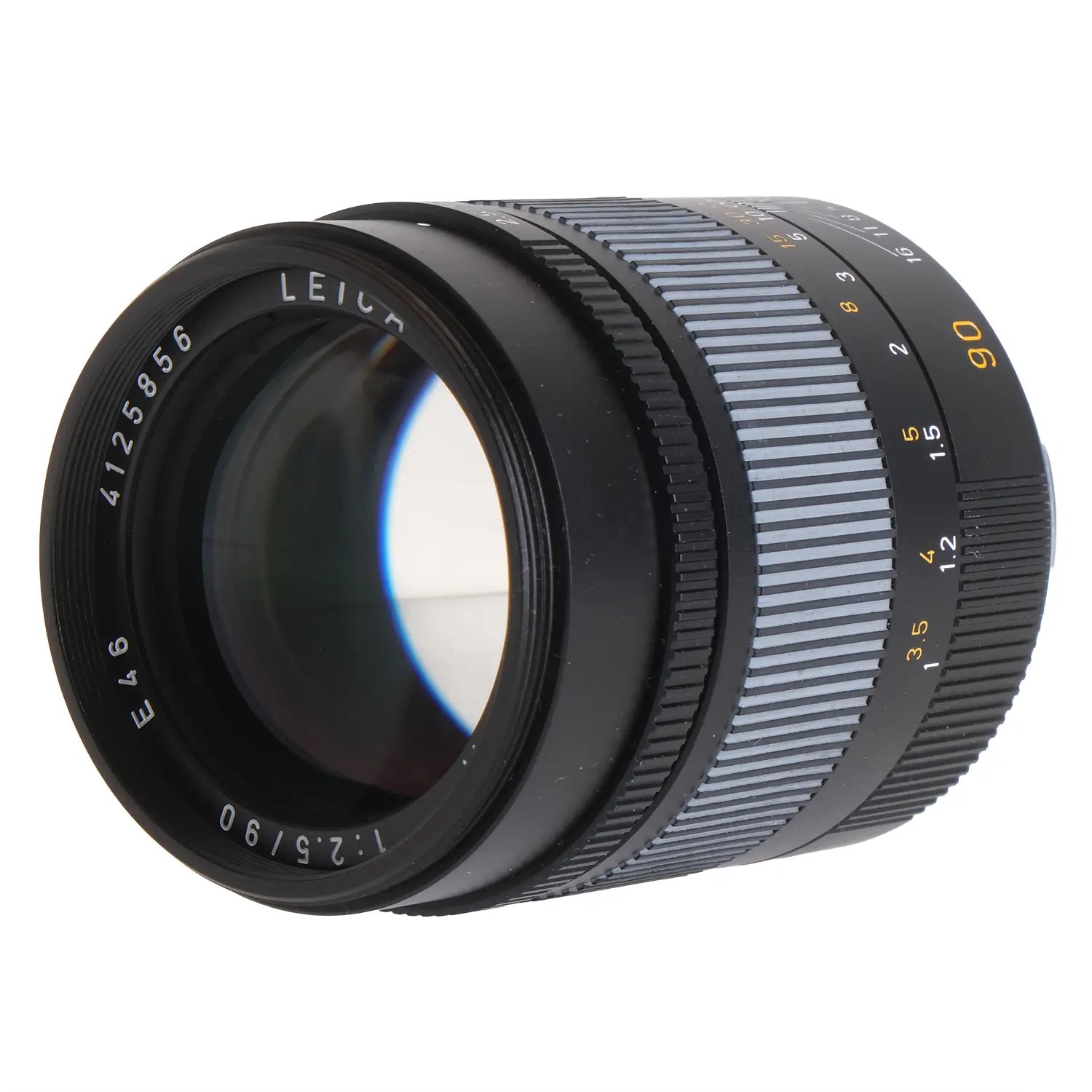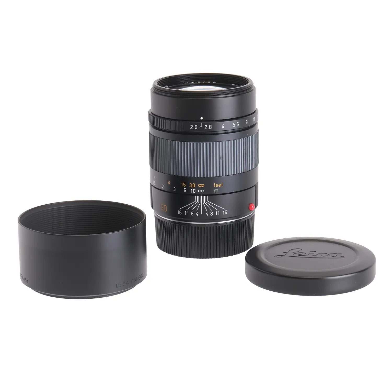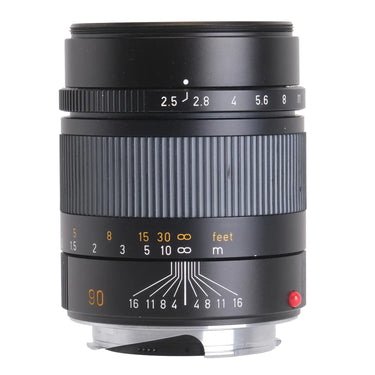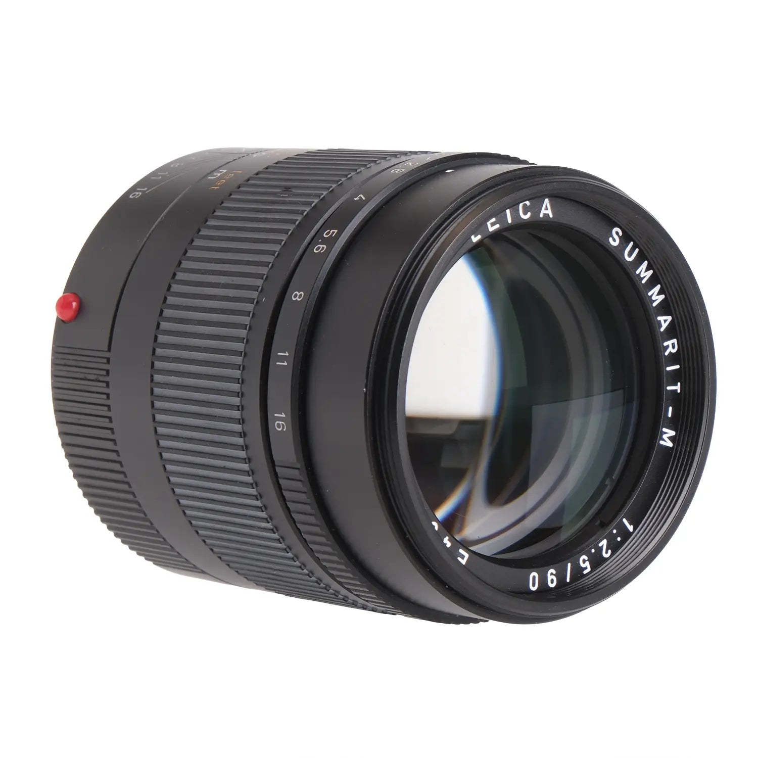 This Leica 90mm f2.5 Summarit-M Lens #4125856, is in very good cosmetic condition with minor signs of handling wear found throughout, please see photos for visual reference. Cosmetically, this lens has been rated at a (9) condition. This lens is in proper working order; the aperture and focus turn smoothly, and the glass is clean and clear with no signs of fungus, haze, or marks present. This lens comes with a lens shade, a lens shade cap, and a rear cap only. This lens is ready for use!
